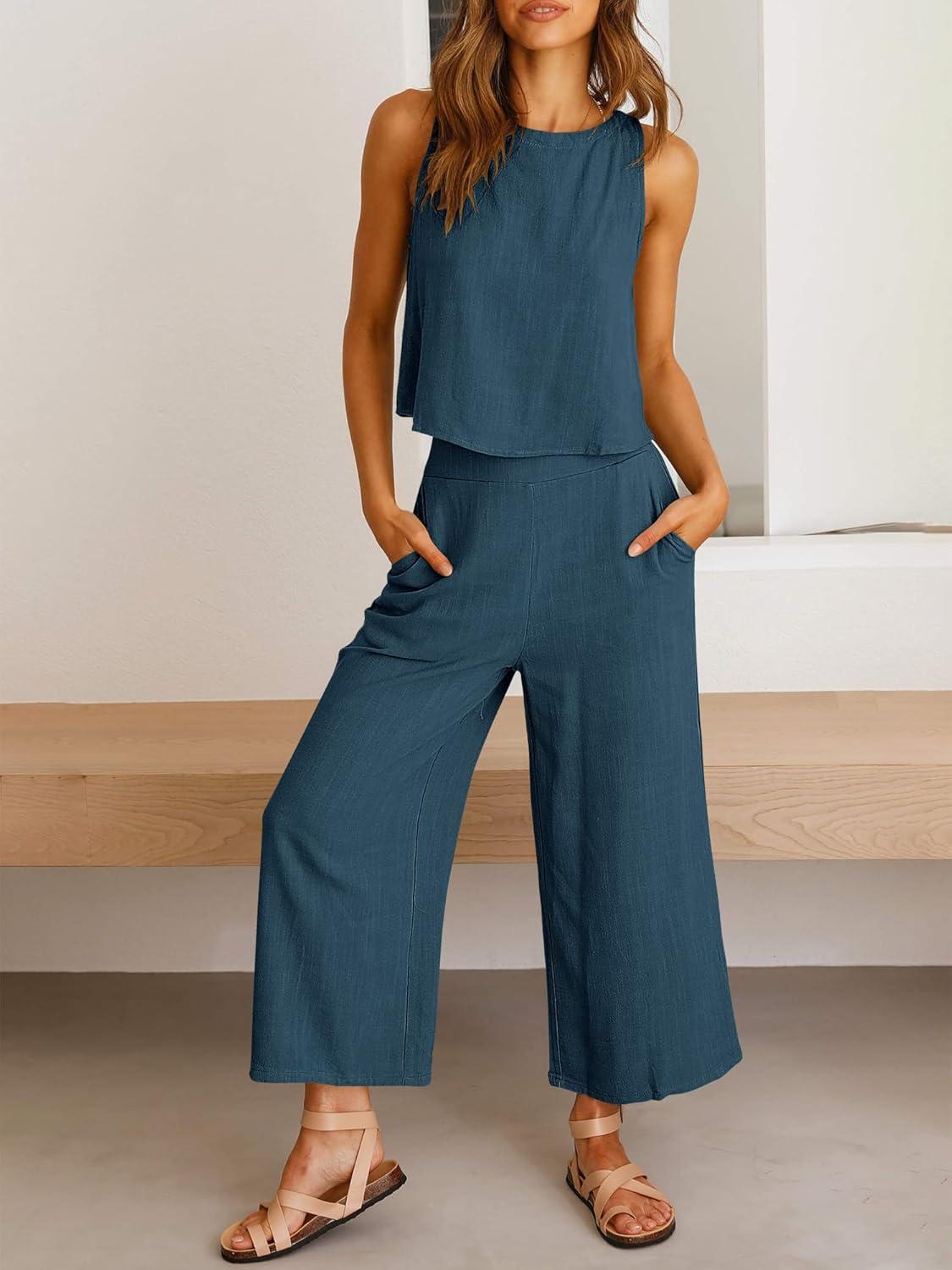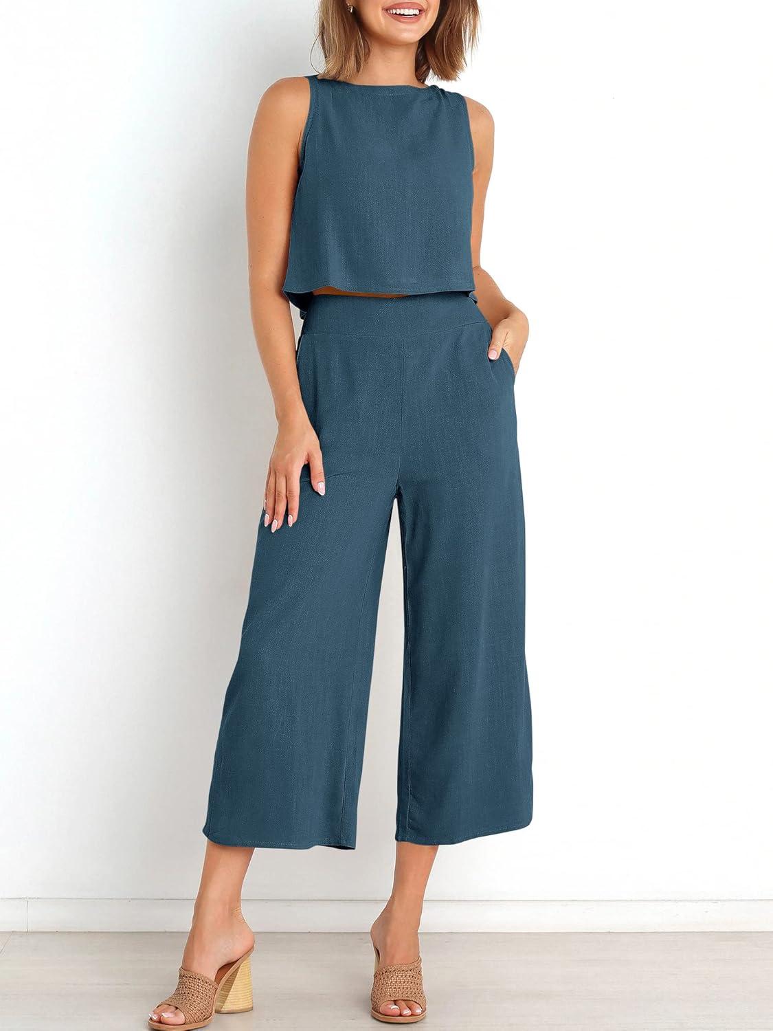 ANRABESS Women's Summer 2 Piece Outfits Sleeveless Crop Top Capri Wide Leg Pants Jumpsuit Linen Lounge Beach Travel Sets(Deep Blue)