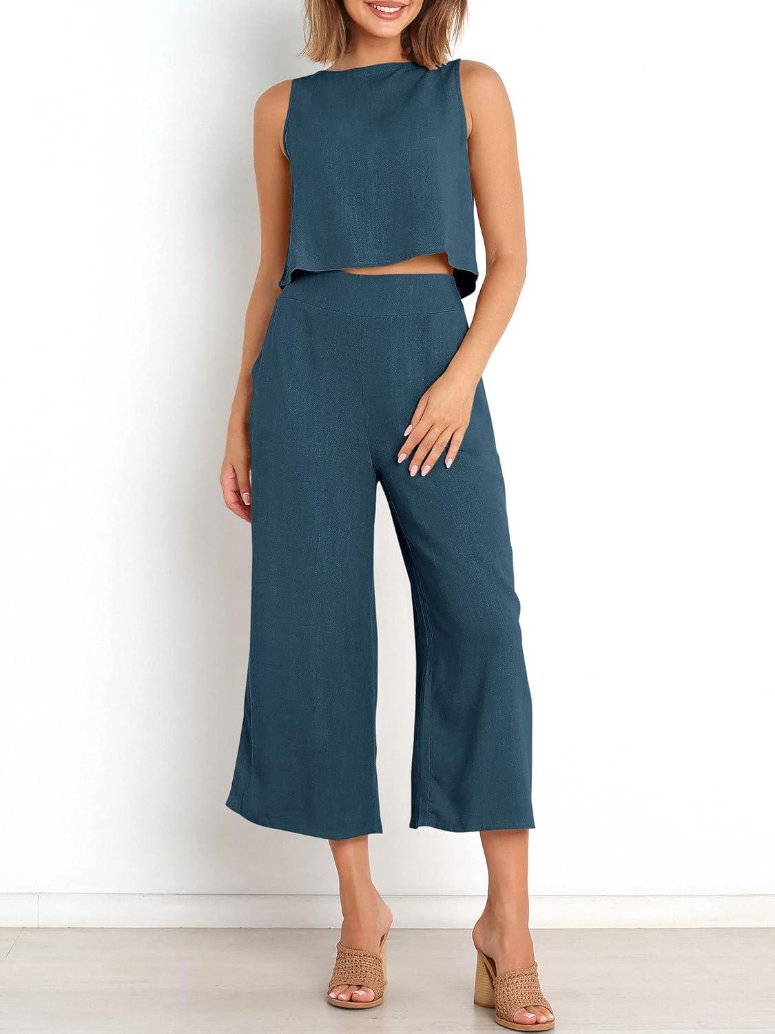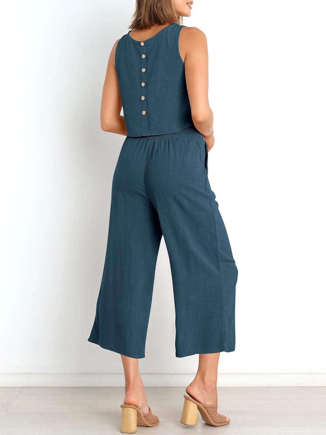 ANRABESS Women's Summer 2 Piece Outfits Sleeveless Crop Top Capri Wide Leg Pants Jumpsuit Casual Linen Lounge Matching Sets 2 piece outfit features a sleeveless round neck crop top, wide-leg cropped pants, button back, high waist, and a wide waistband for added comfort.