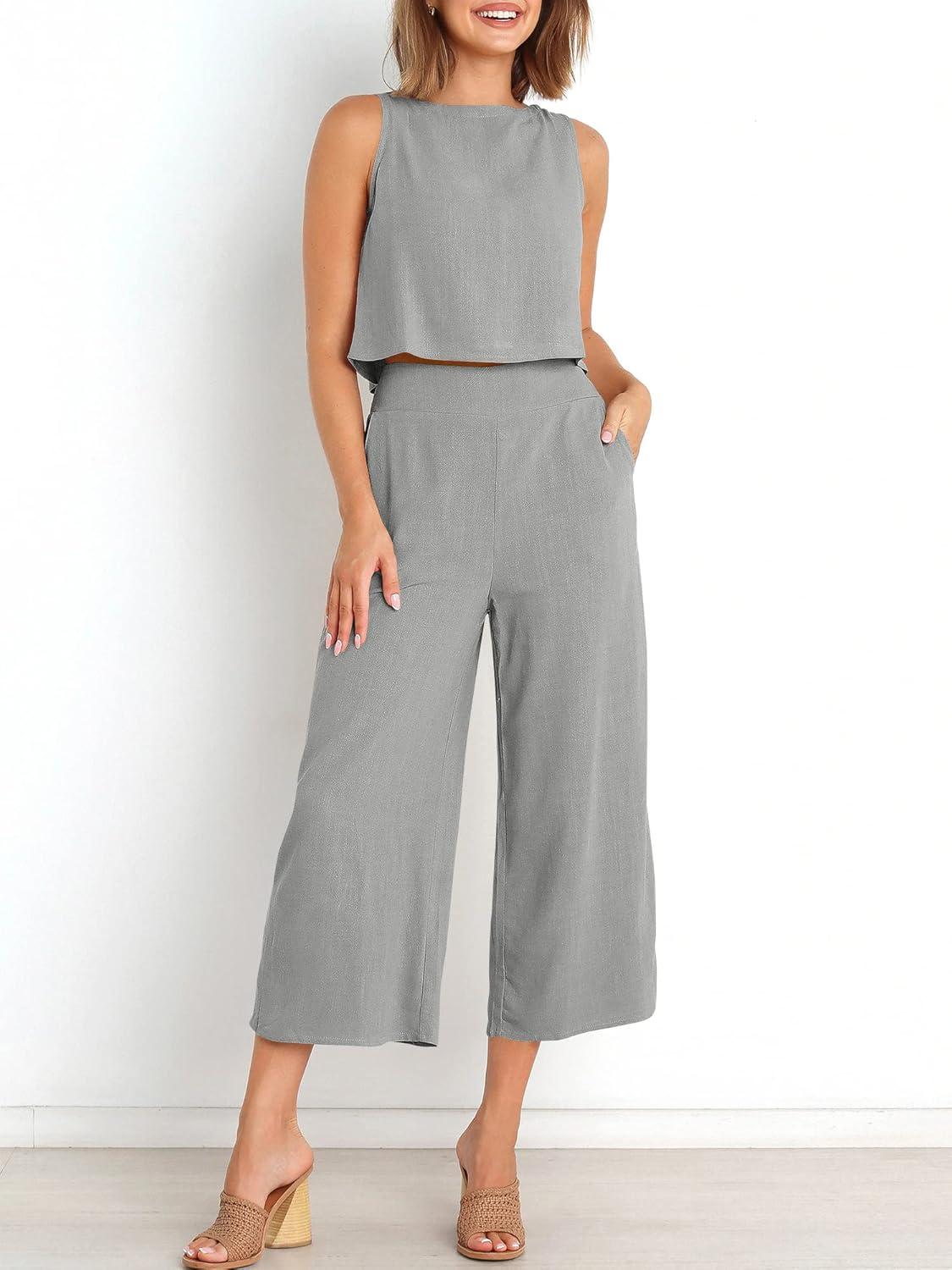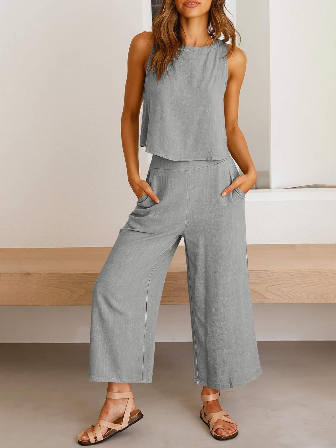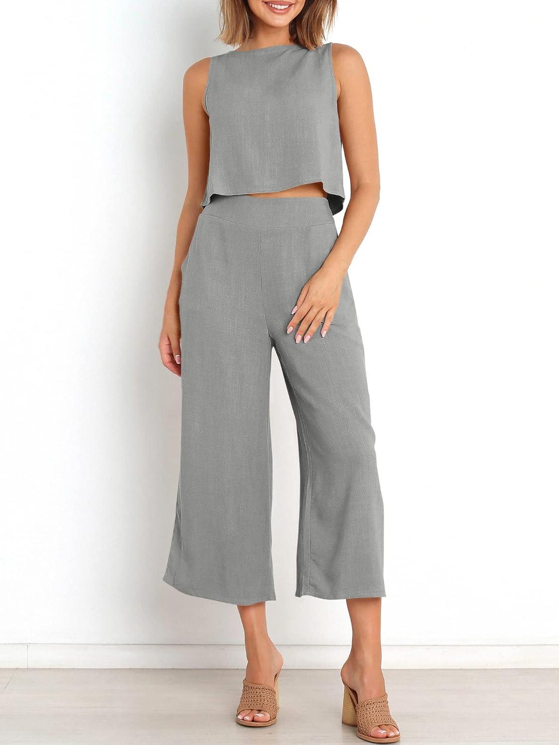 ANRABESS Women's Summer 2 Piece Outfits Sleeveless Crop Top Capri Wide Leg Pants Jumpsuit Linen Lounge Beach Travel Sets(Light Gray)
