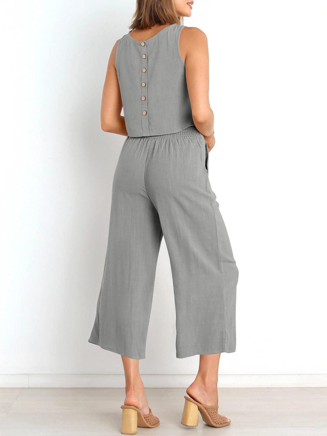 ANRABESS Women's Summer 2 Piece Outfits Sleeveless Crop Top Capri Wide Leg Pants Jumpsuit Casual Linen Lounge Matching Sets 2 piece outfit features a sleeveless round neck crop top, wide-leg cropped pants, button back, high waist, and a wide waistband for added comfort.