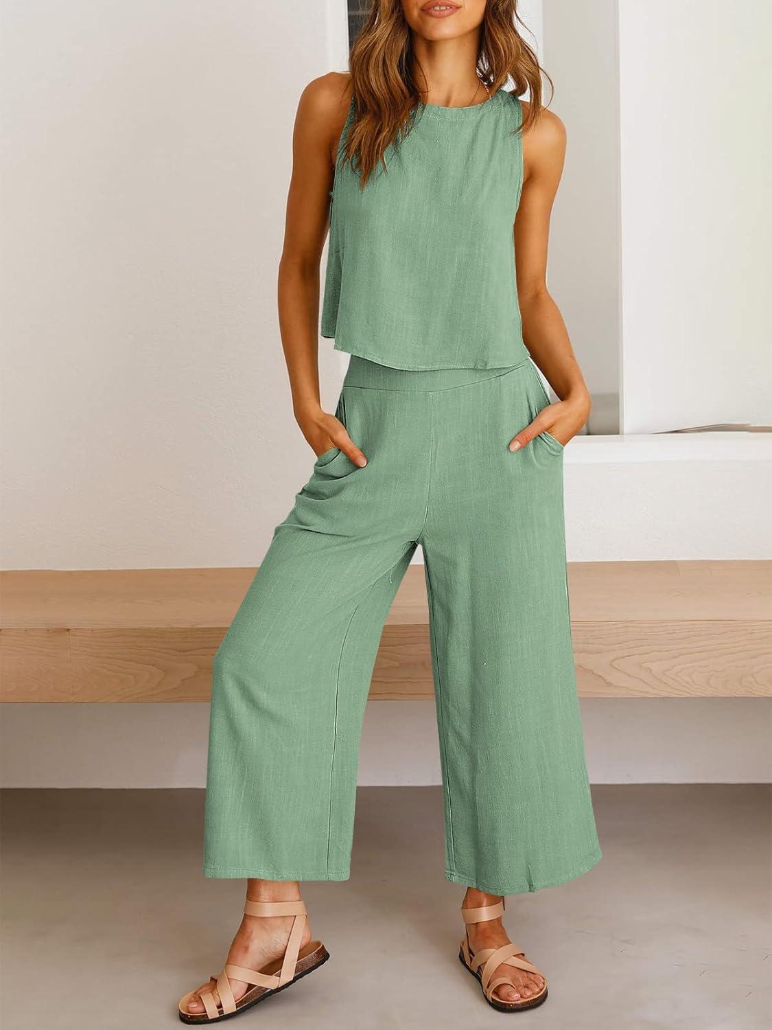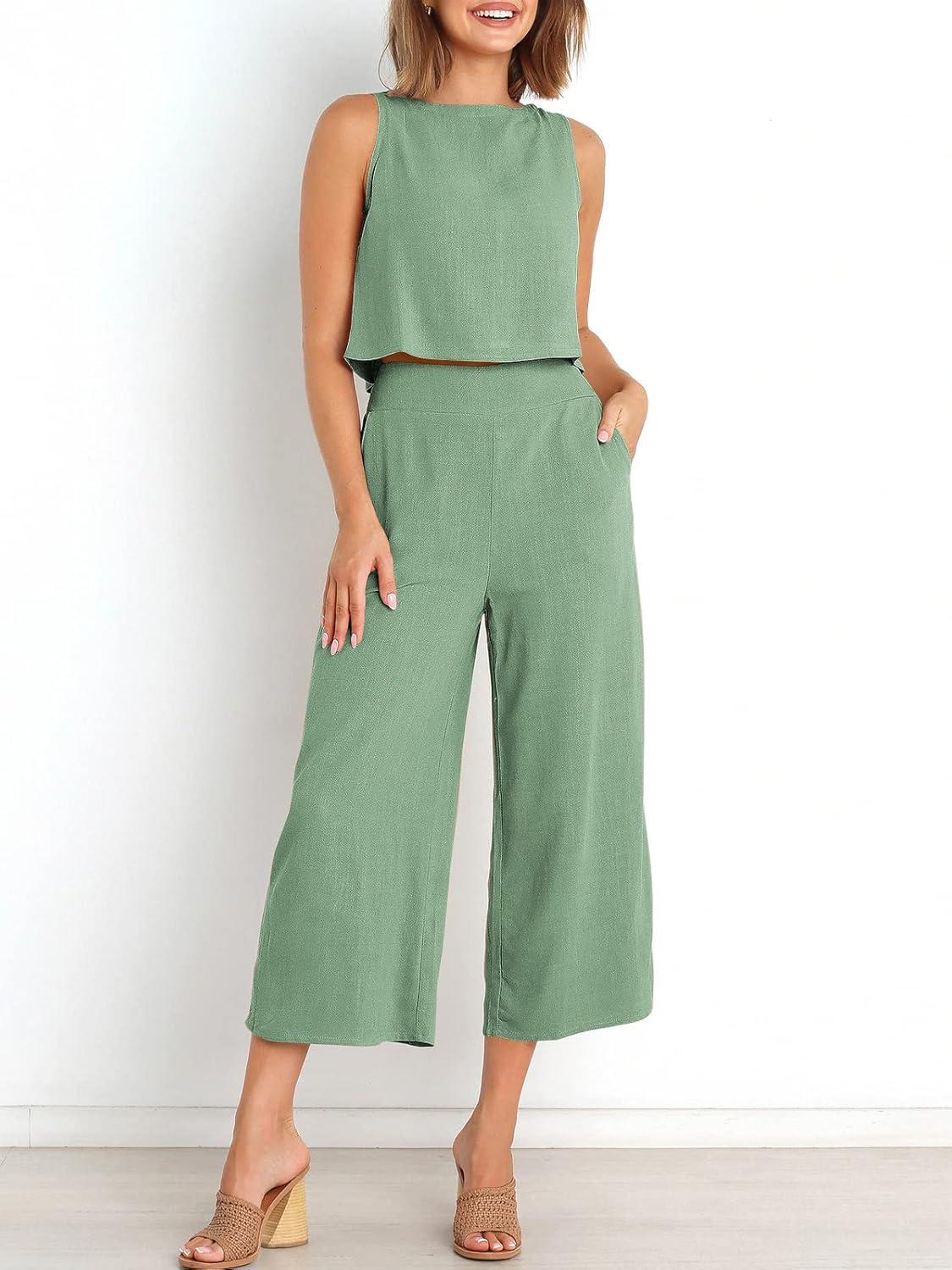 ANRABESS Women's Summer 2 Piece Outfits Sleeveless Crop Top Capri Wide Leg Pants Jumpsuit Linen Lounge Beach Travel Sets(Light Green)