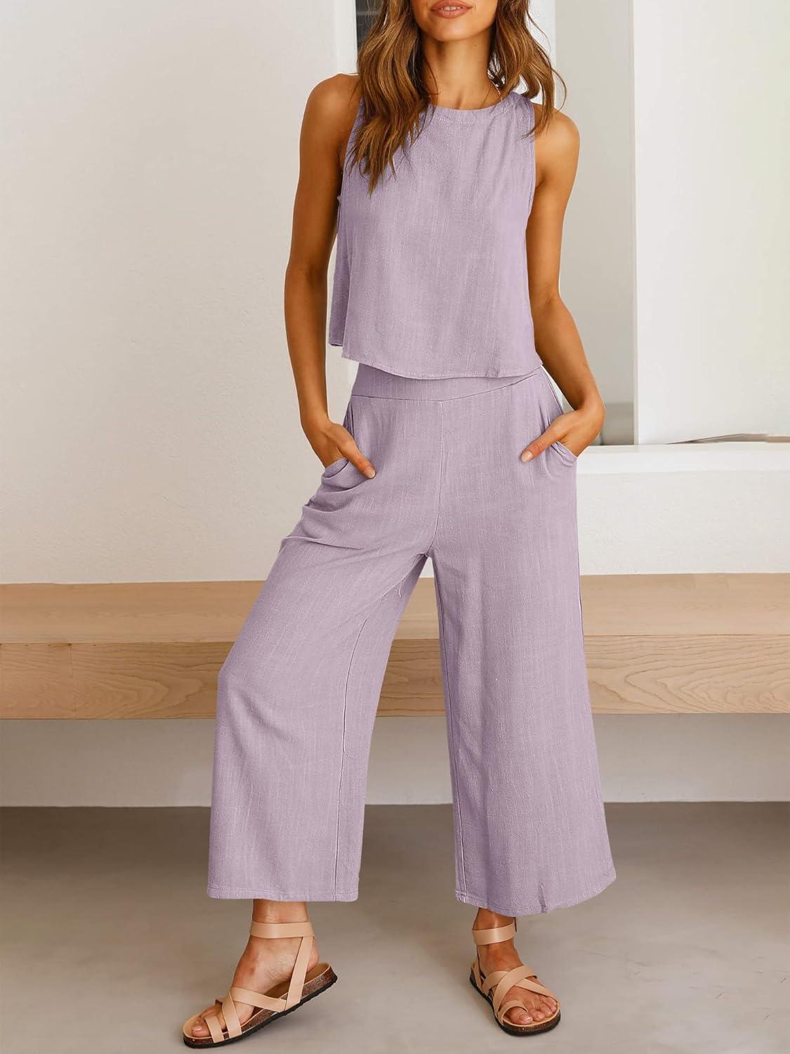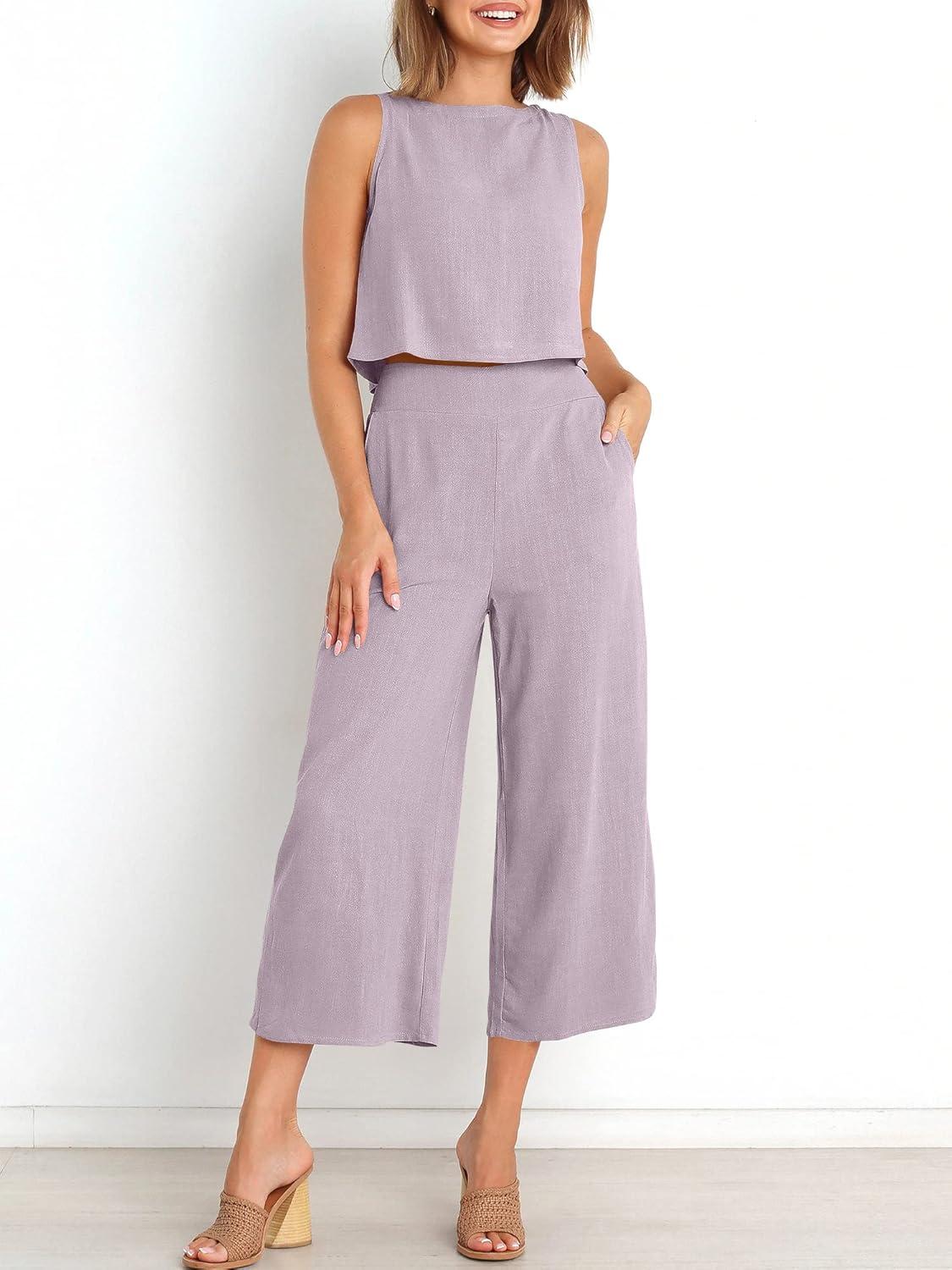 ANRABESS Women's Summer 2 Piece Outfits Sleeveless Crop Top Capri Wide Leg Pants Jumpsuit Linen Lounge Beach Travel Sets(Purple)