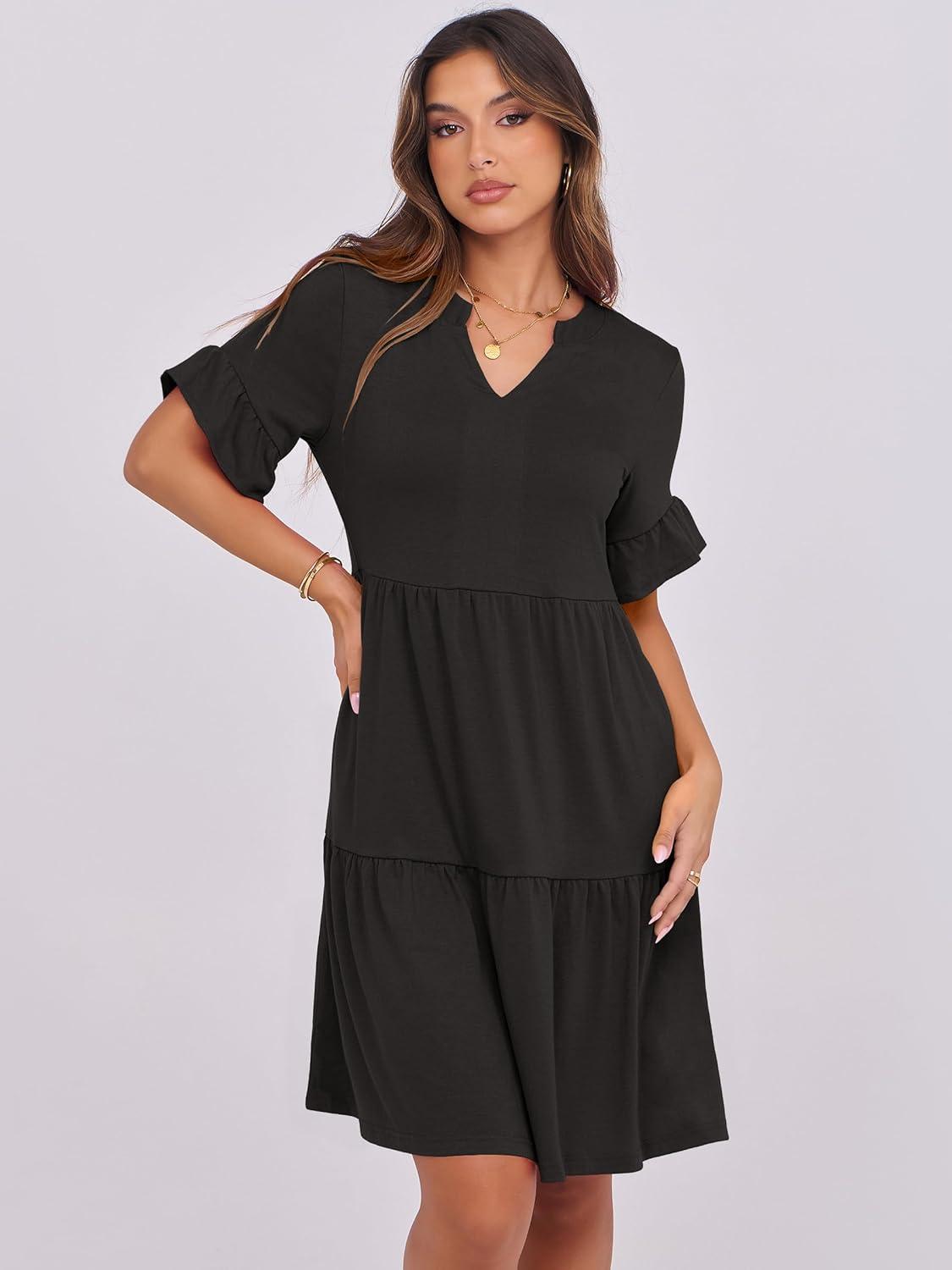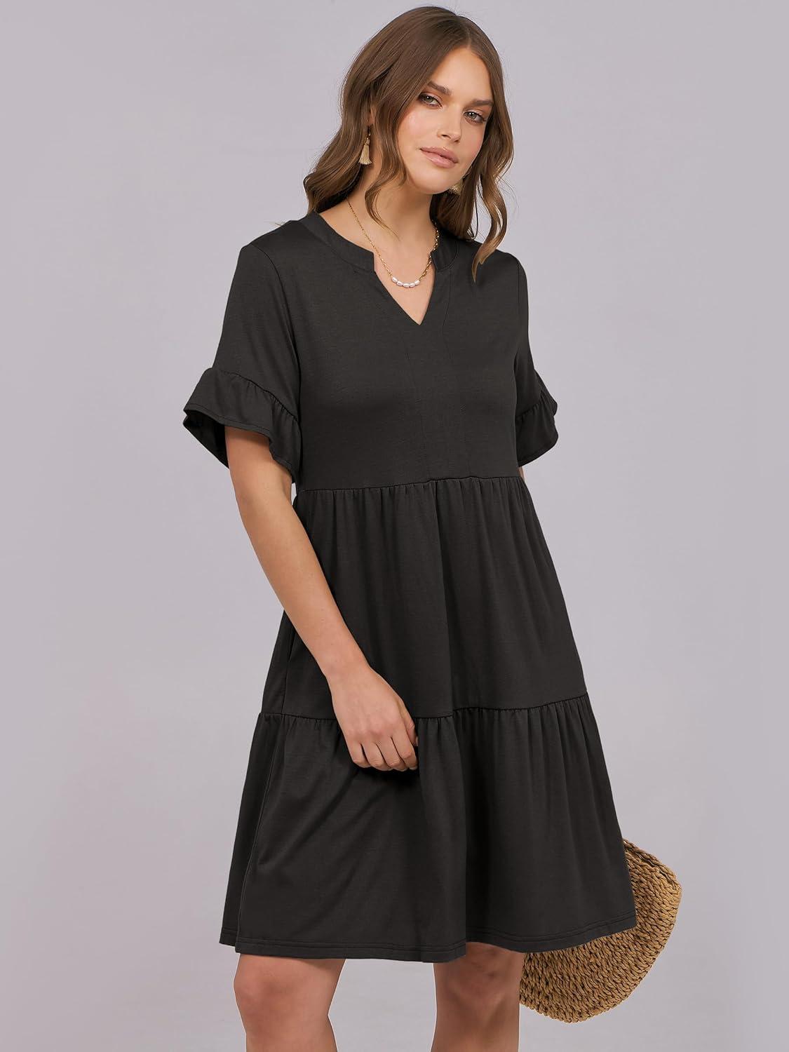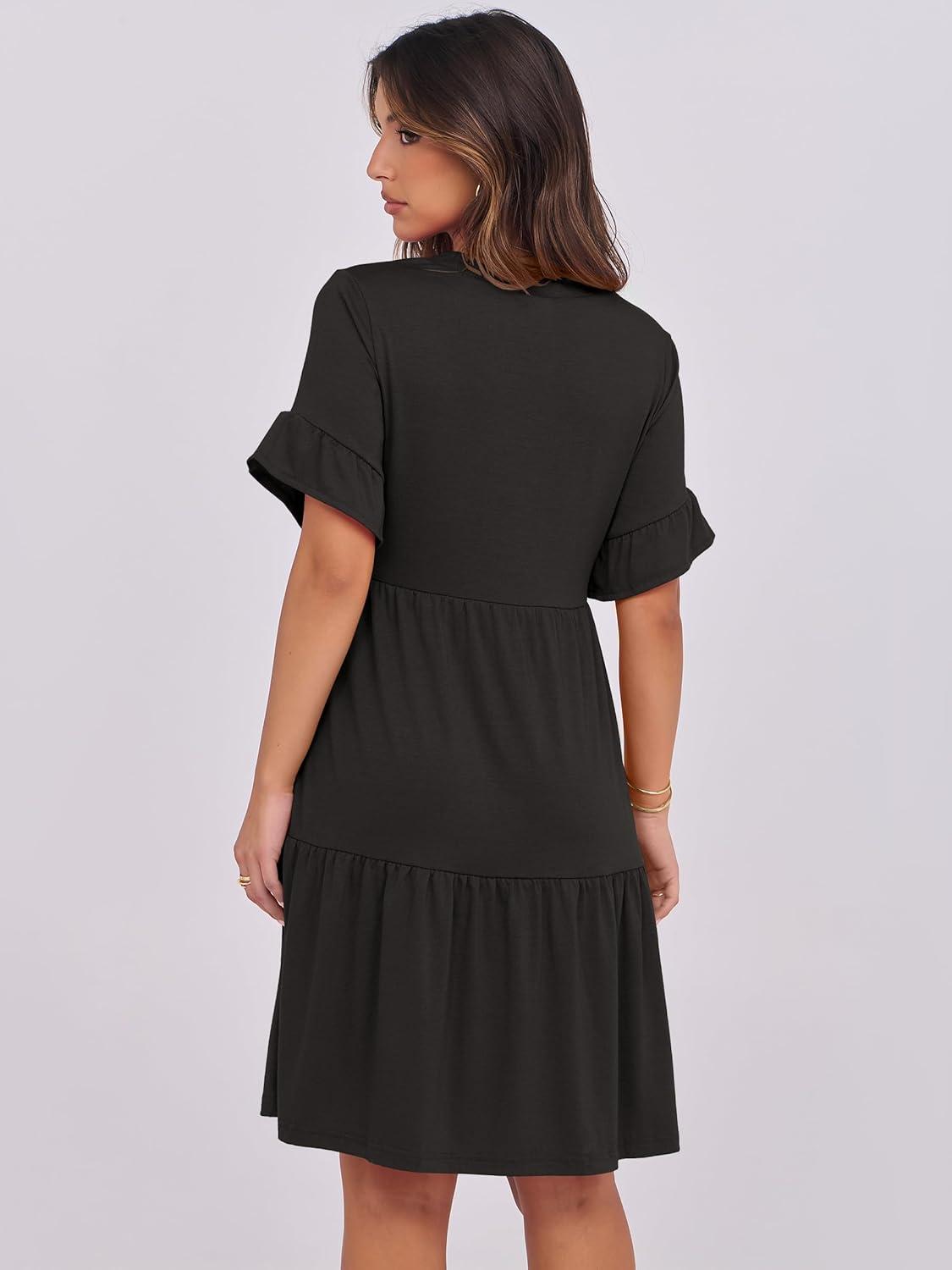 ANRABESS Womens Summer 2025 Trendy Ruffle Short Sleeve V Neck A Line Tiered Flowy Loose Casual Mini Beach Dress with Pockets(Black)