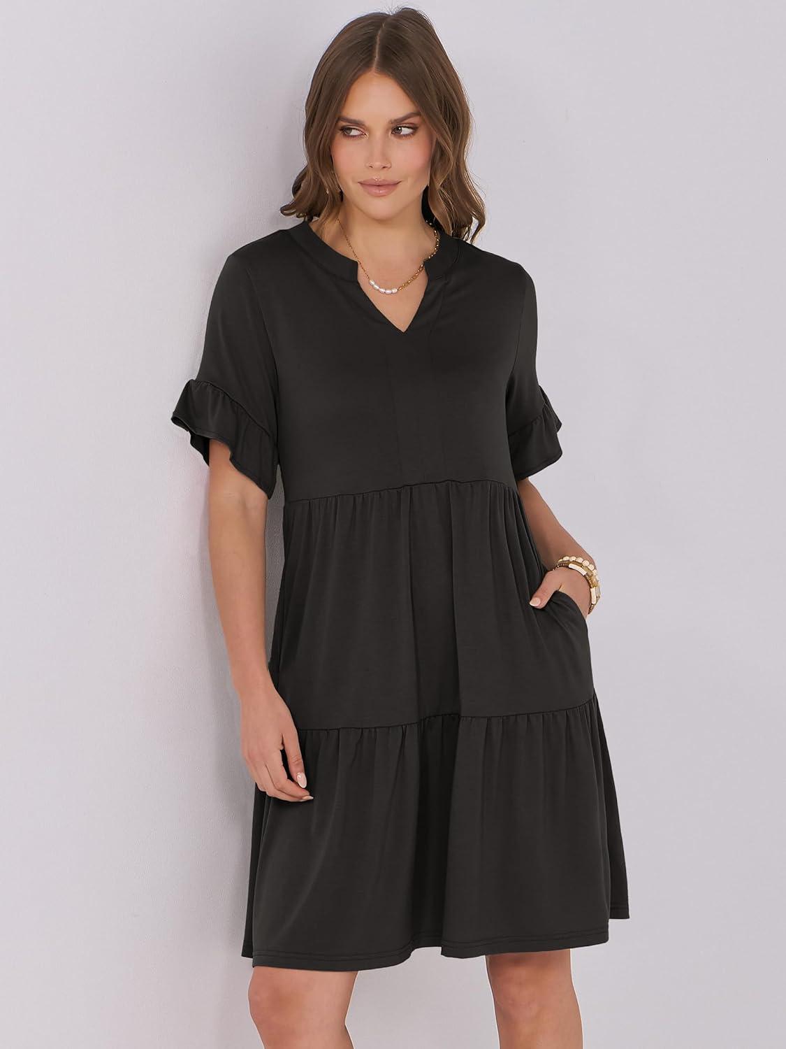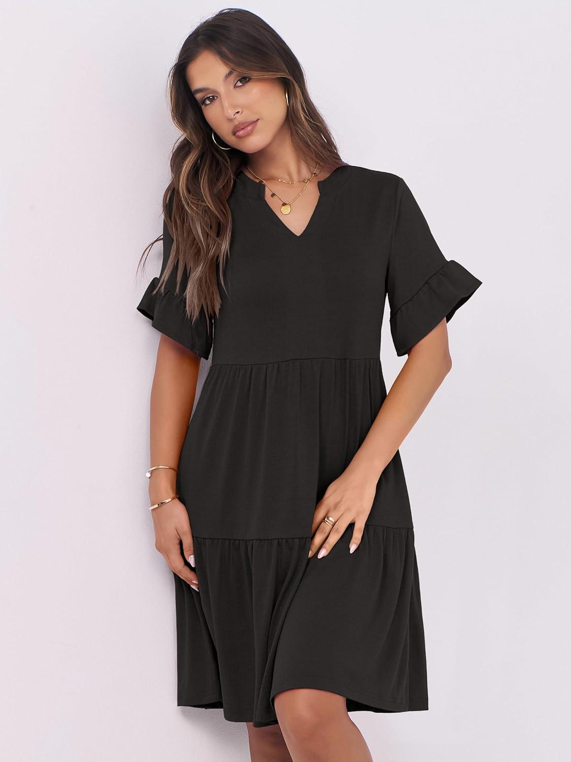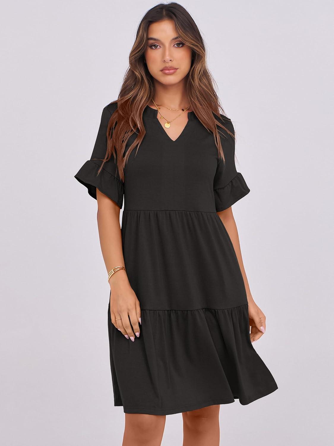 ANRABESS Womens Summer 2025 Trendy Ruffle Short Sleeve V Neck A Line Tiered Flowy Loose Casual Mini Beach Dress with Pockets(Black)