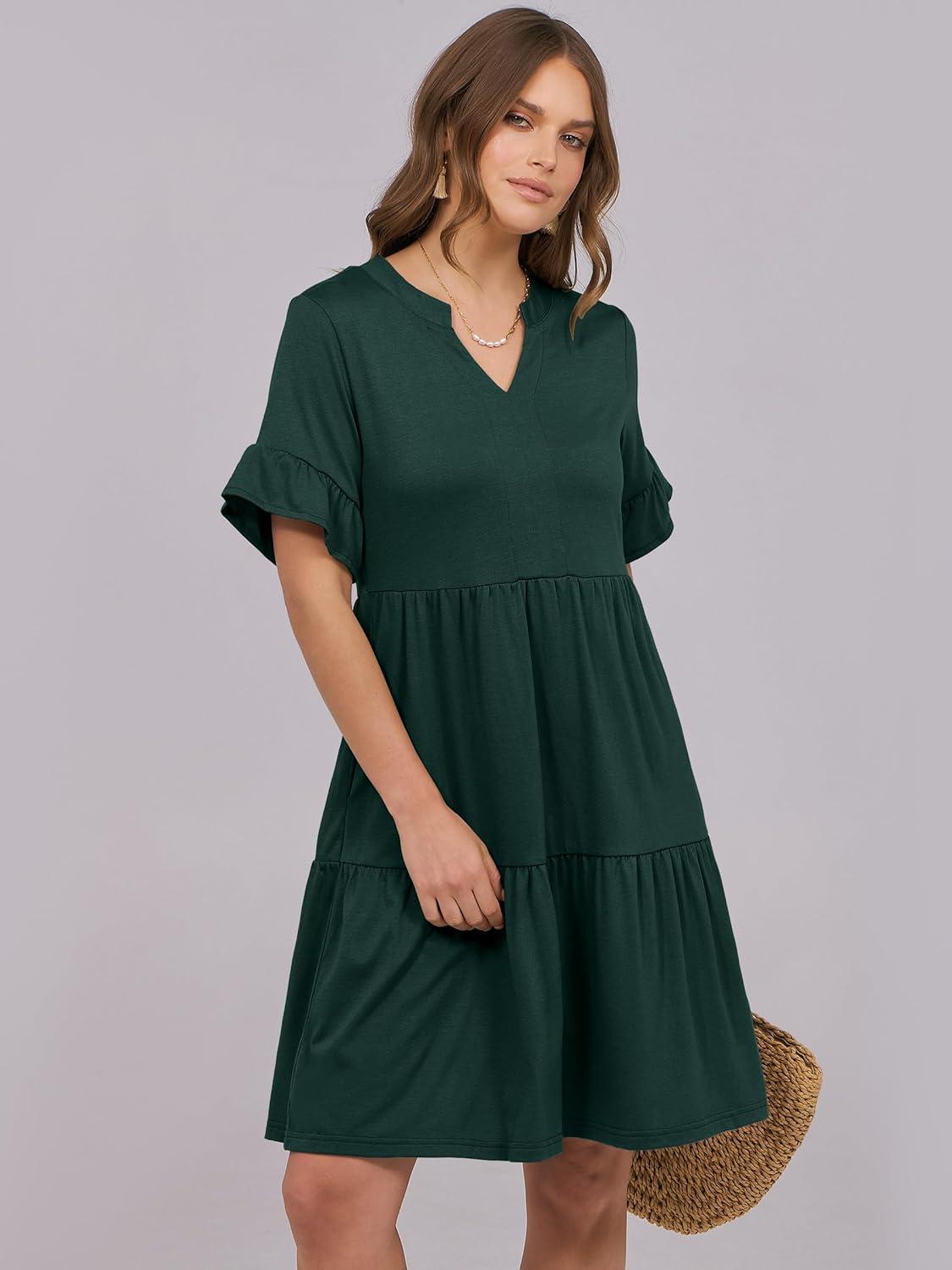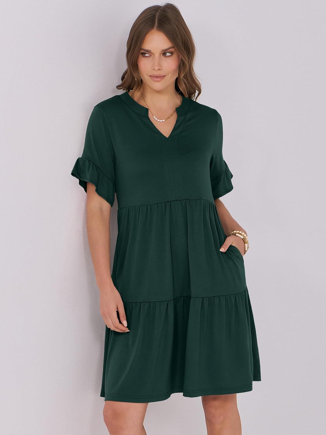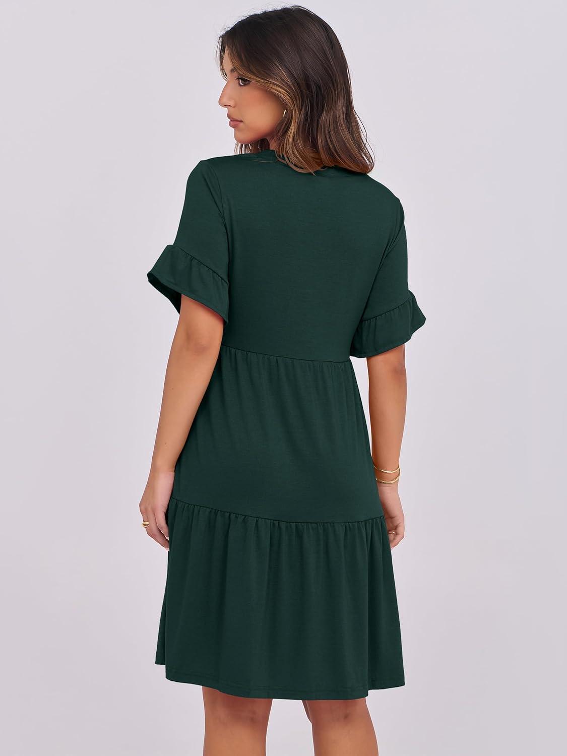 ANRABESS Womens Summer 2025 Trendy Ruffle Short Sleeve V Neck A Line Tiered Flowy Loose Casual Mini Beach Dress with Pockets(Forest Green)