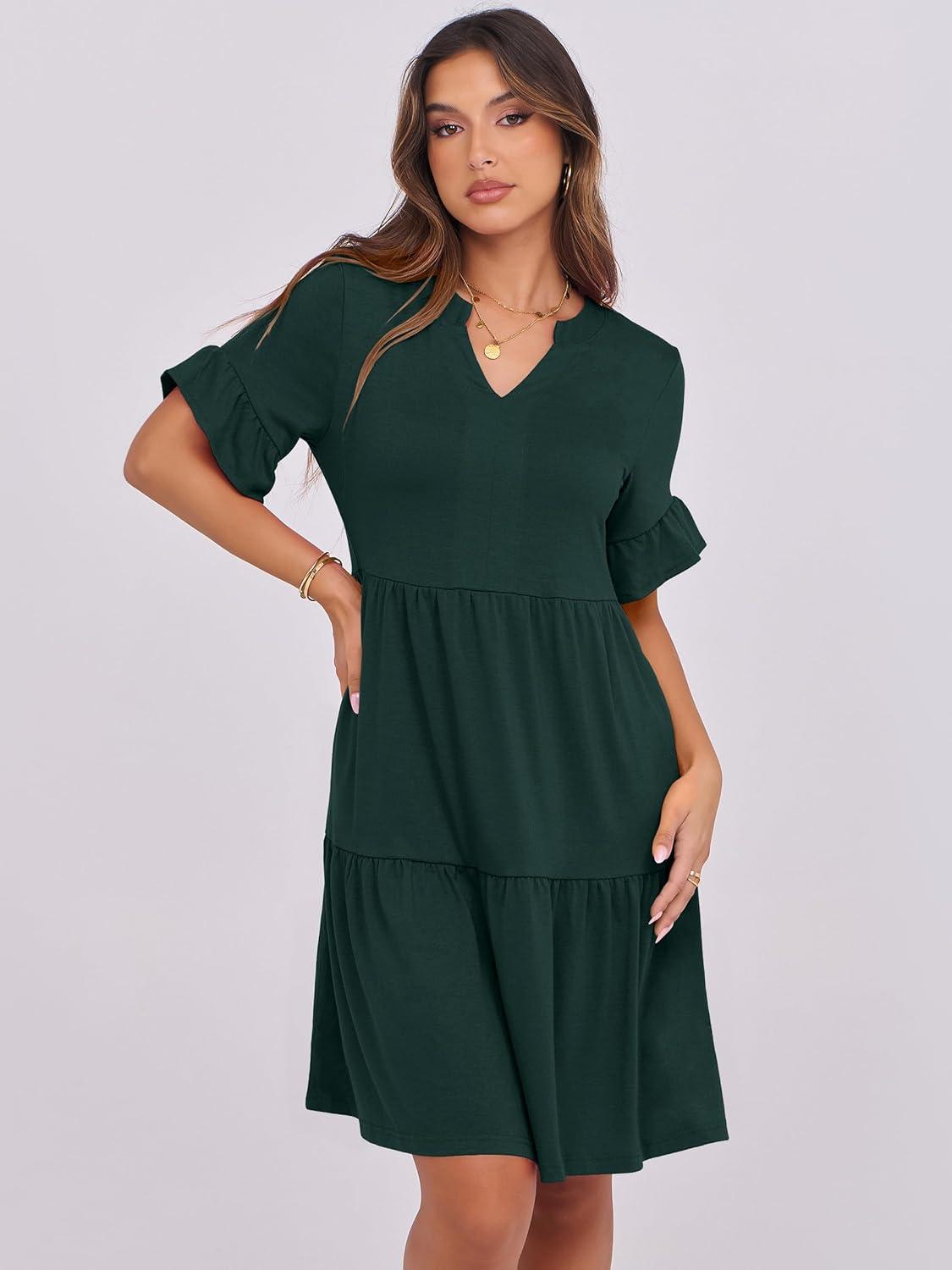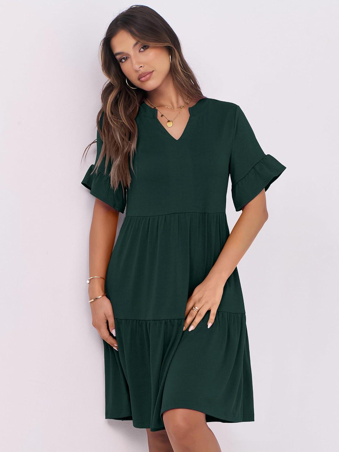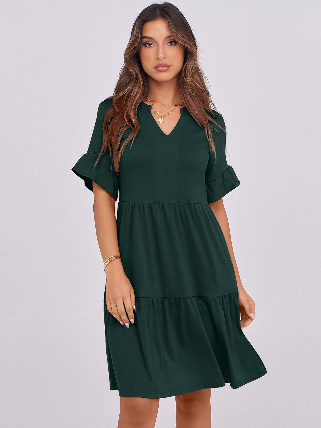 ANRABESS Womens Summer 2025 Trendy Ruffle Short Sleeve V Neck A Line Tiered Flowy Loose Casual Mini Beach Dress with Pockets(Forest Green)