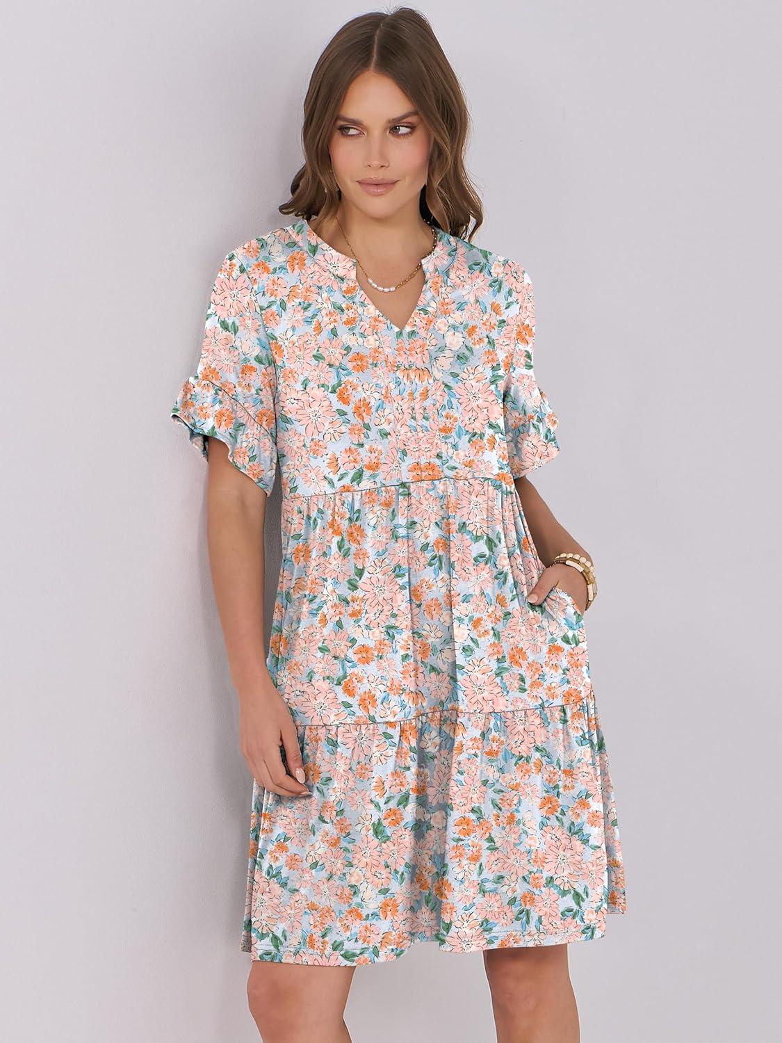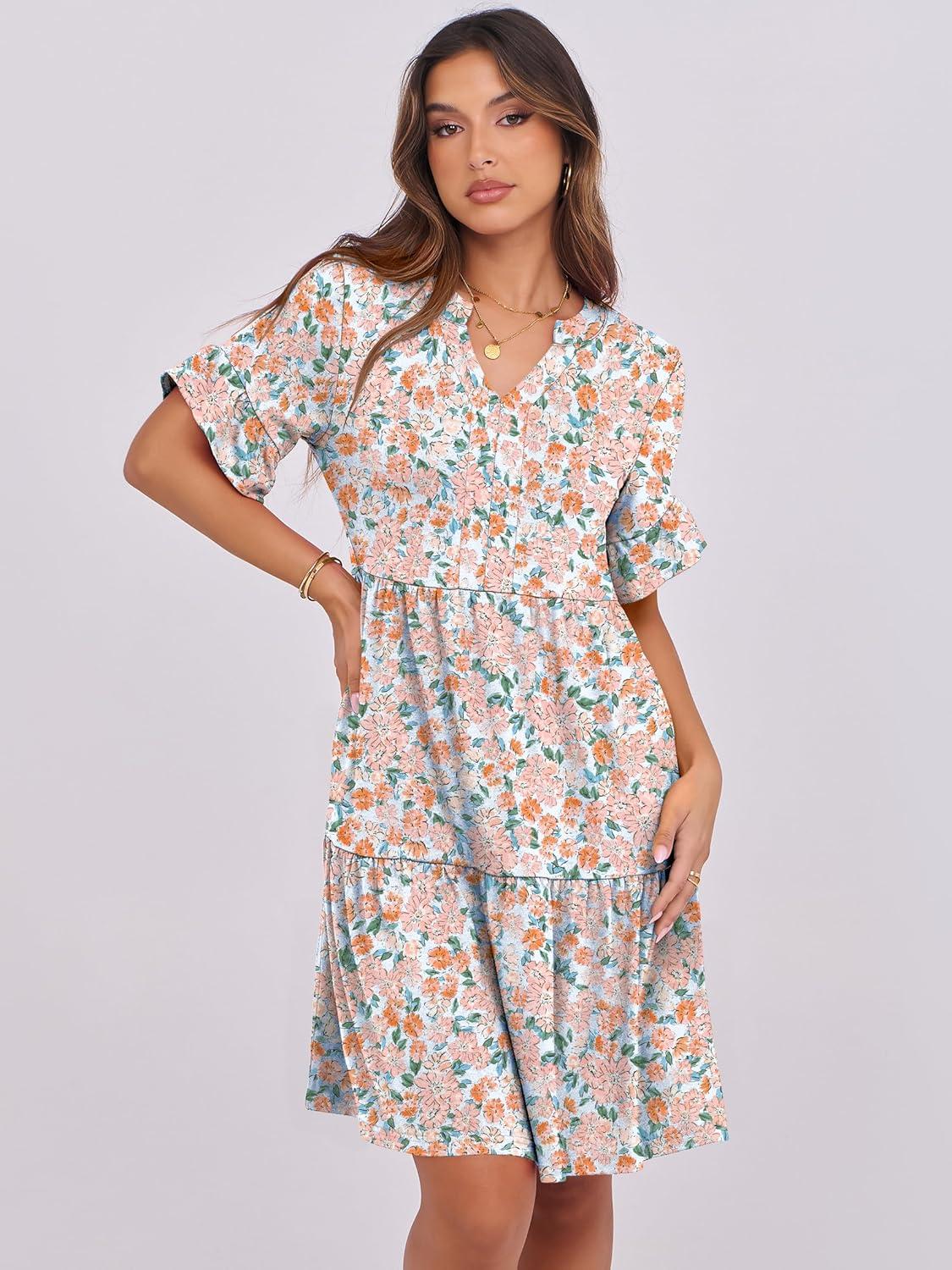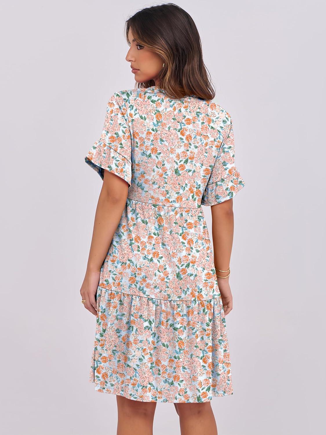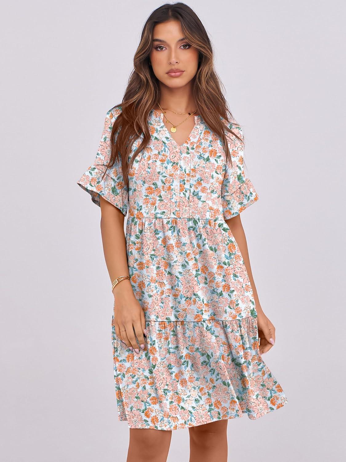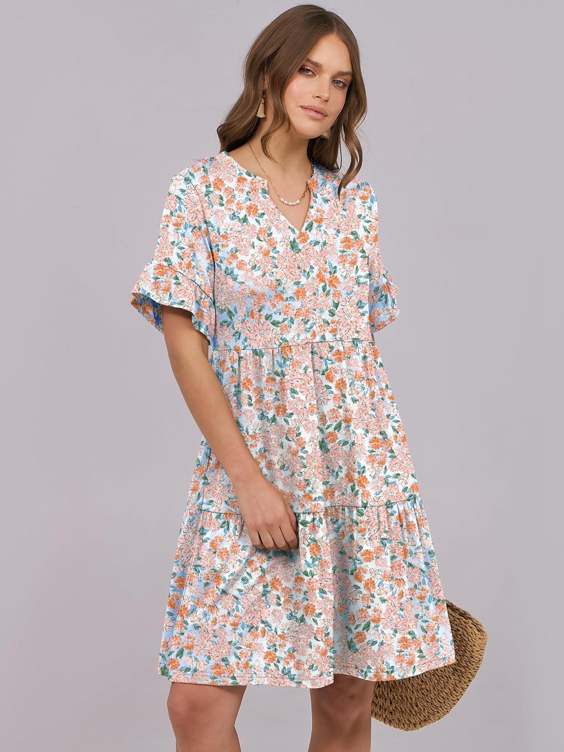 ANRABESS Womens Summer 2026 Trendy Ruffle Short Sleeve V Neck A Line Tiered Flowy Loose Casual Mini Beach Dress with Pockets(Coral Floral)