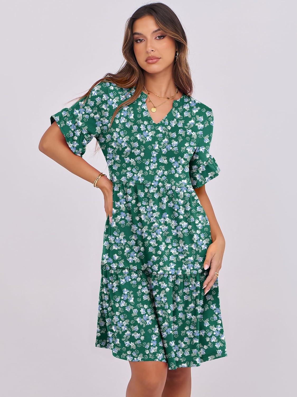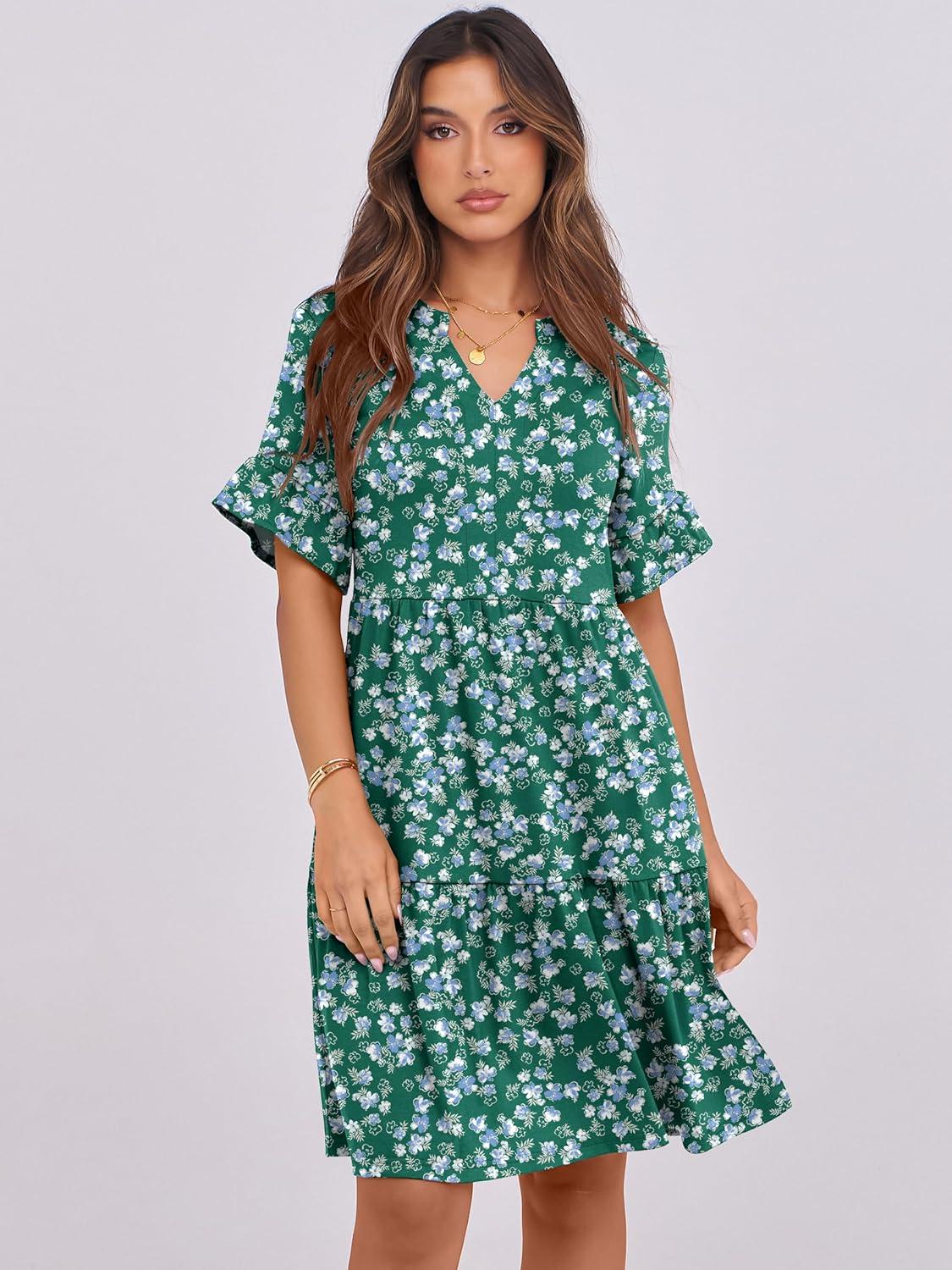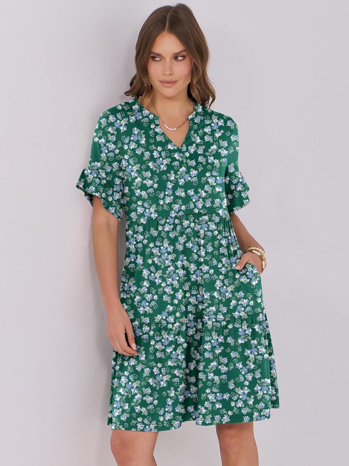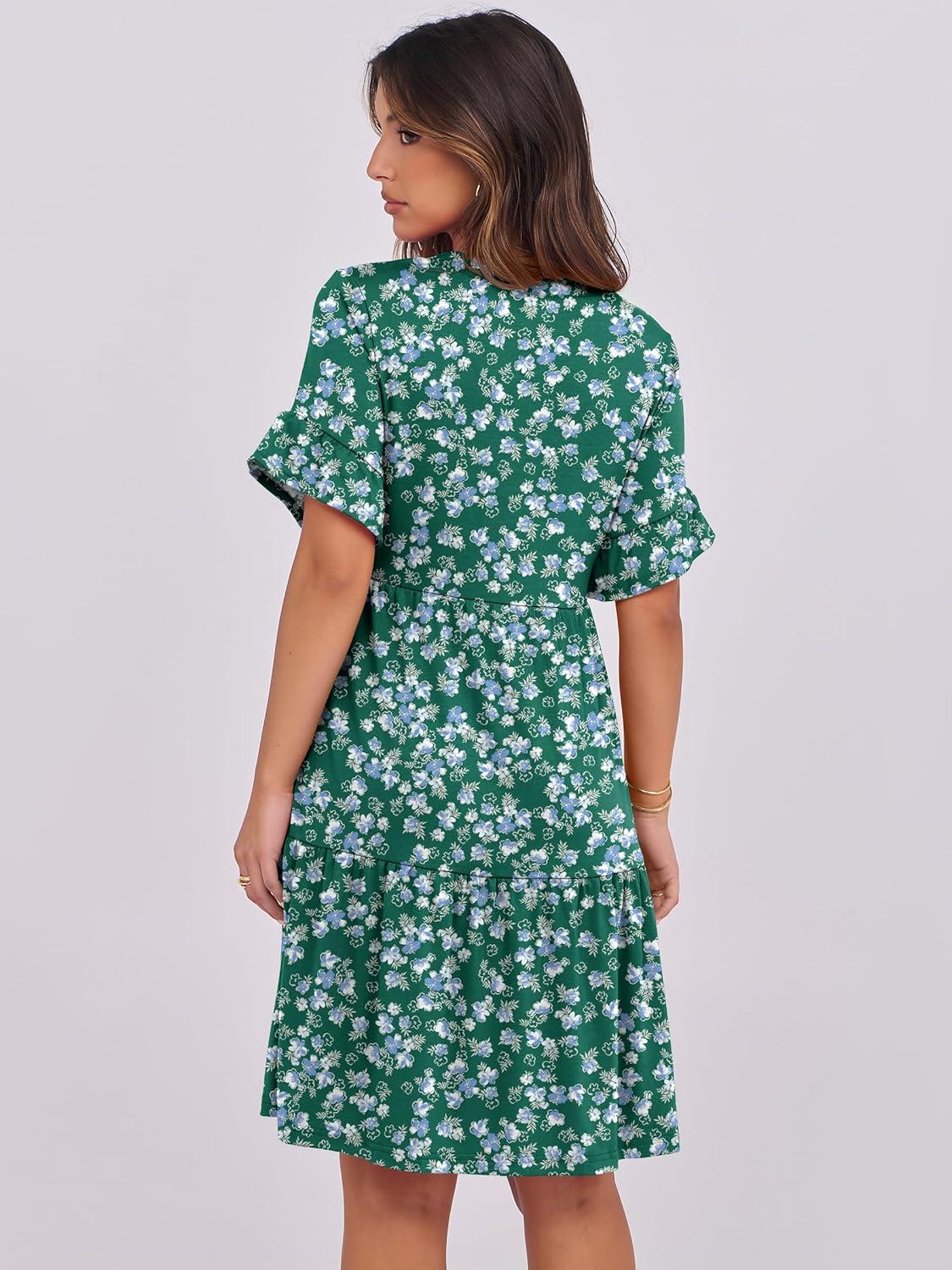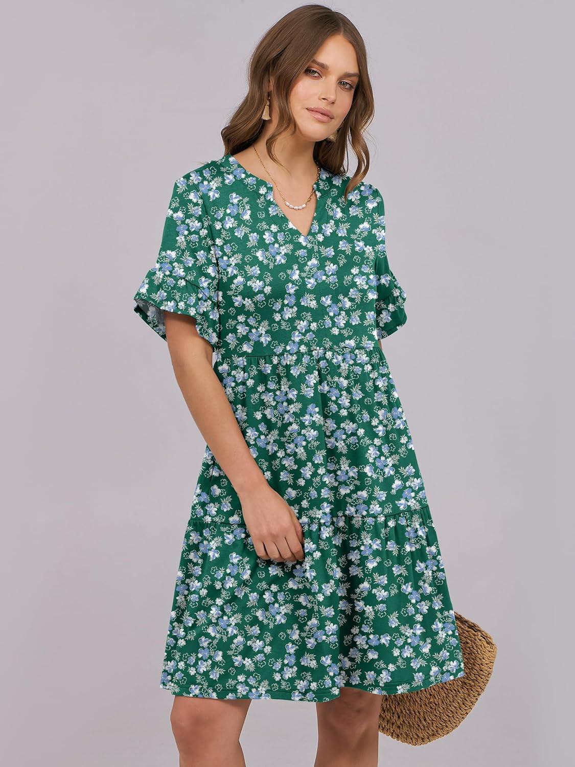 ANRABESS Womens Summer 2026 Trendy Ruffle Short Sleeve V Neck A Line Tiered Flowy Loose Casual Mini Beach Dress with Pockets(Green Blue Floral)