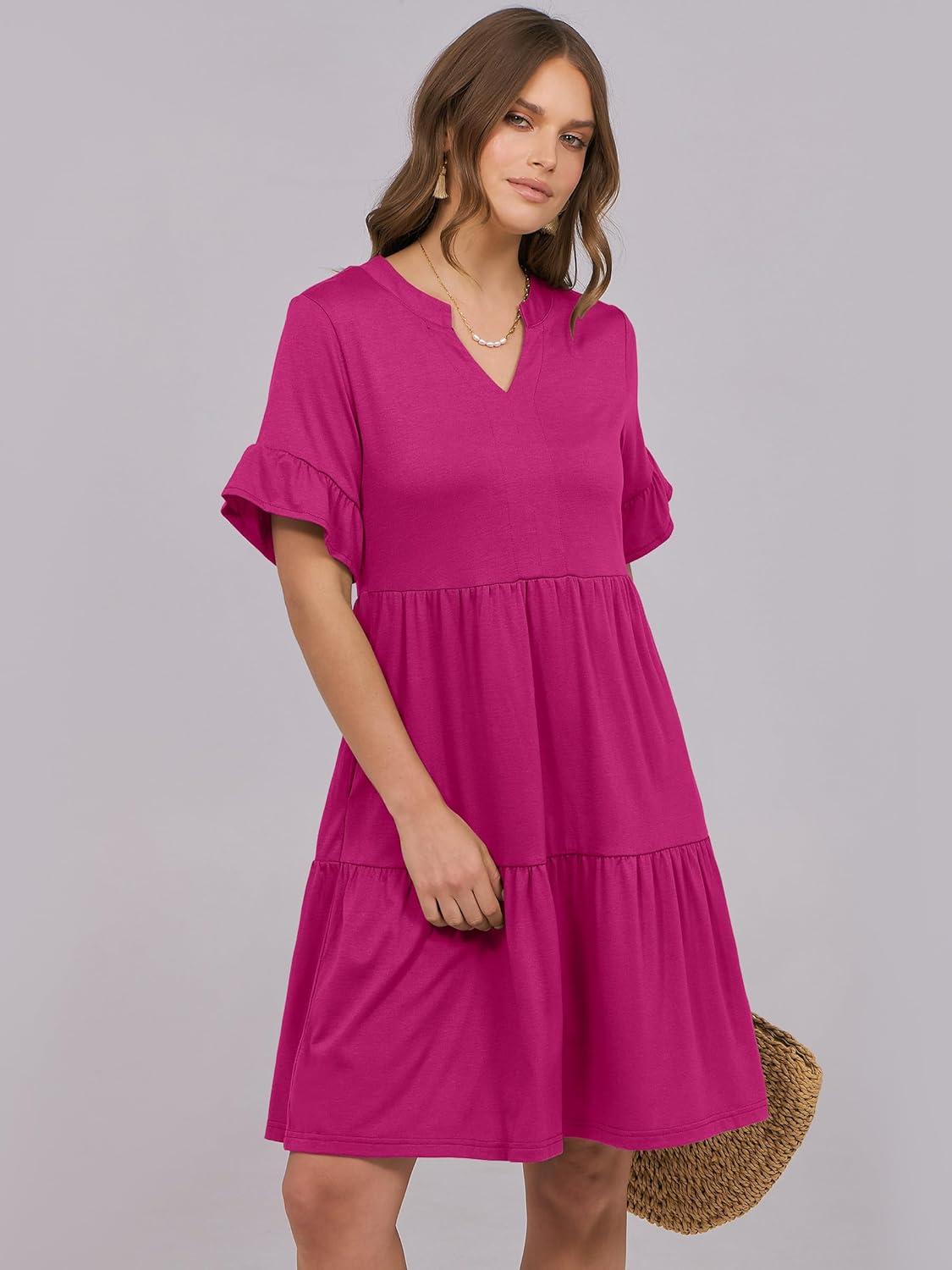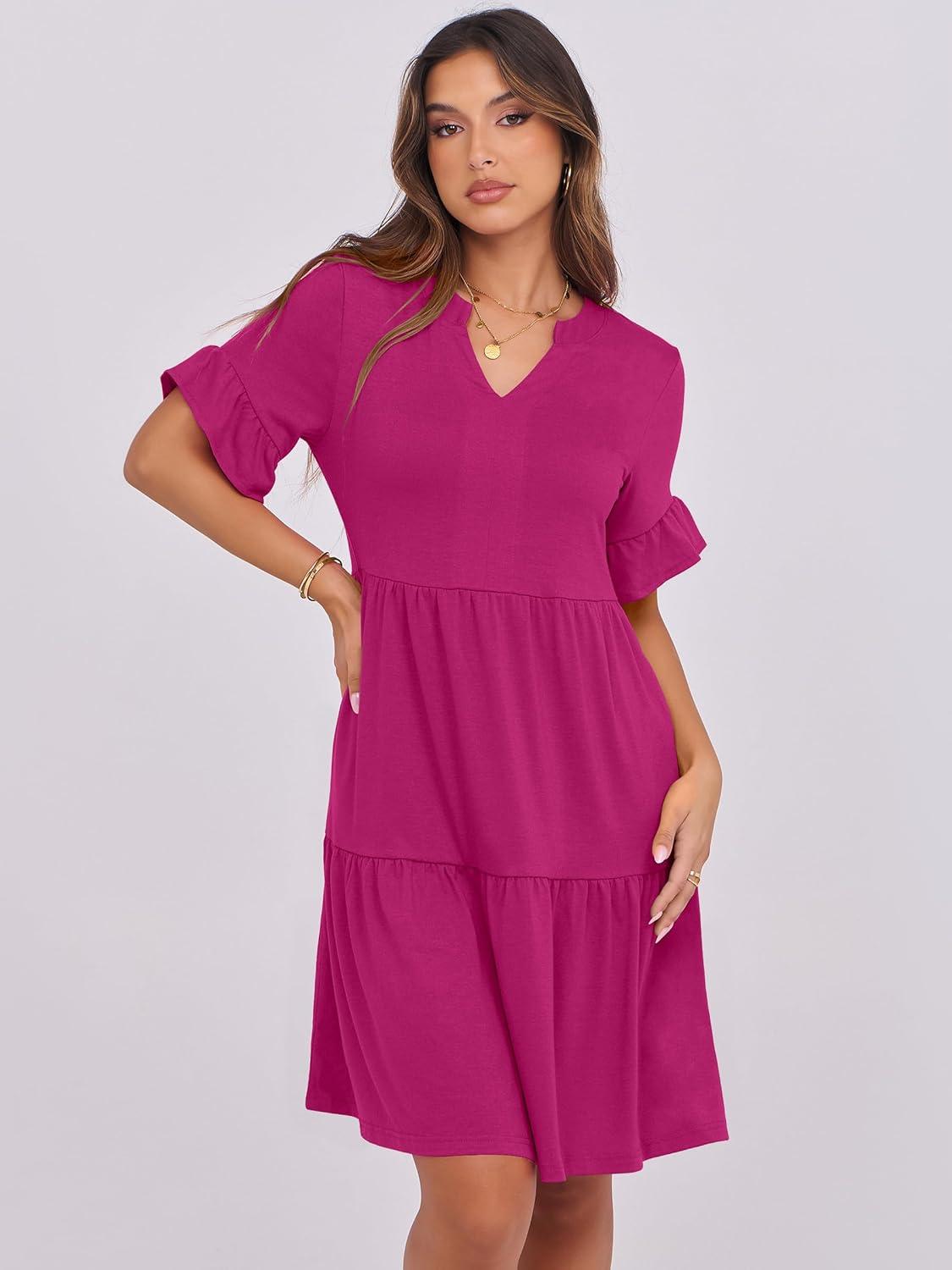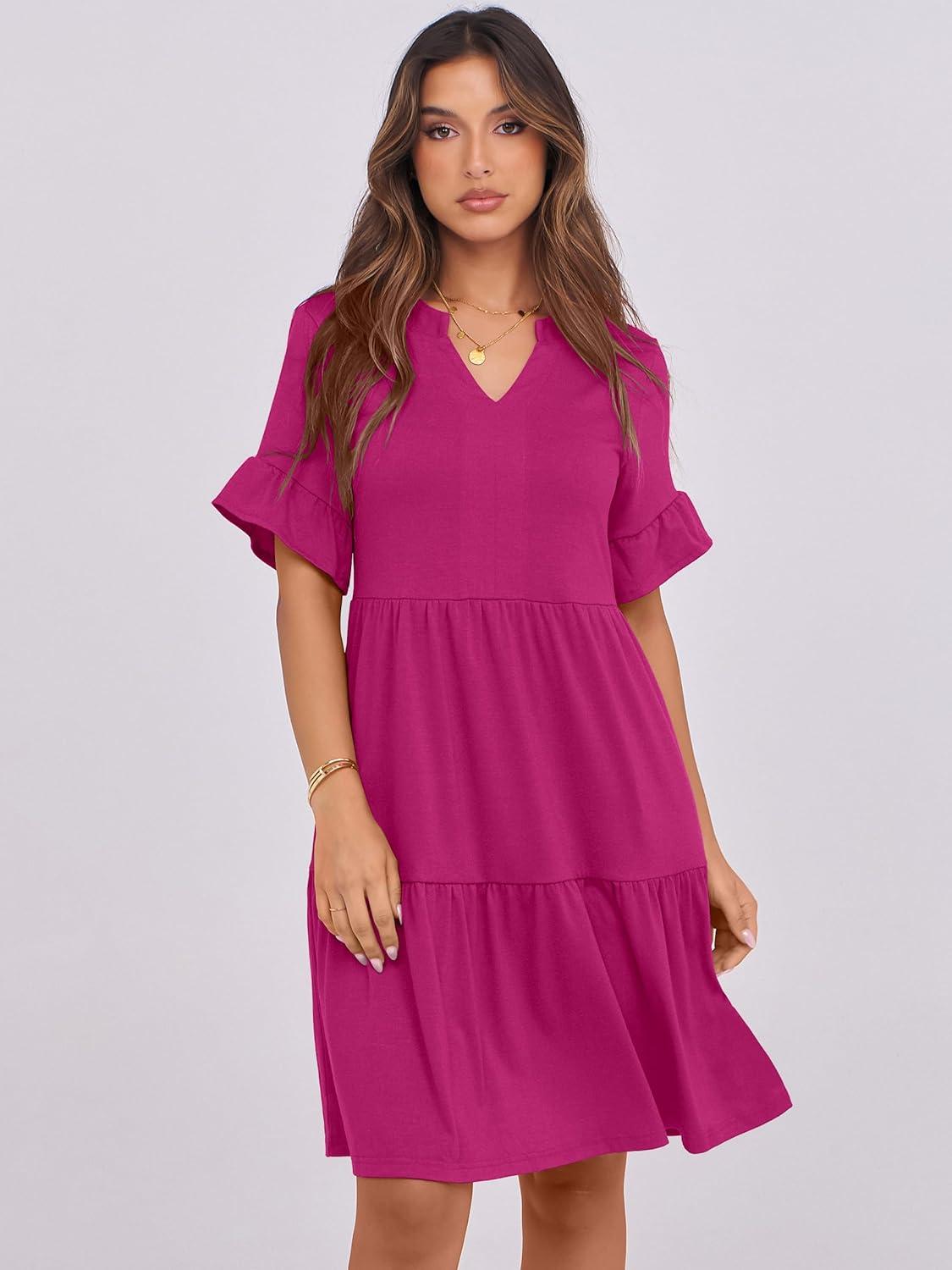 ANRABESS Womens Summer 2026 Trendy Ruffle Short Sleeve V Neck A Line Tiered Flowy Loose Casual Mini Beach Dress with Pockets(Hot Pink)