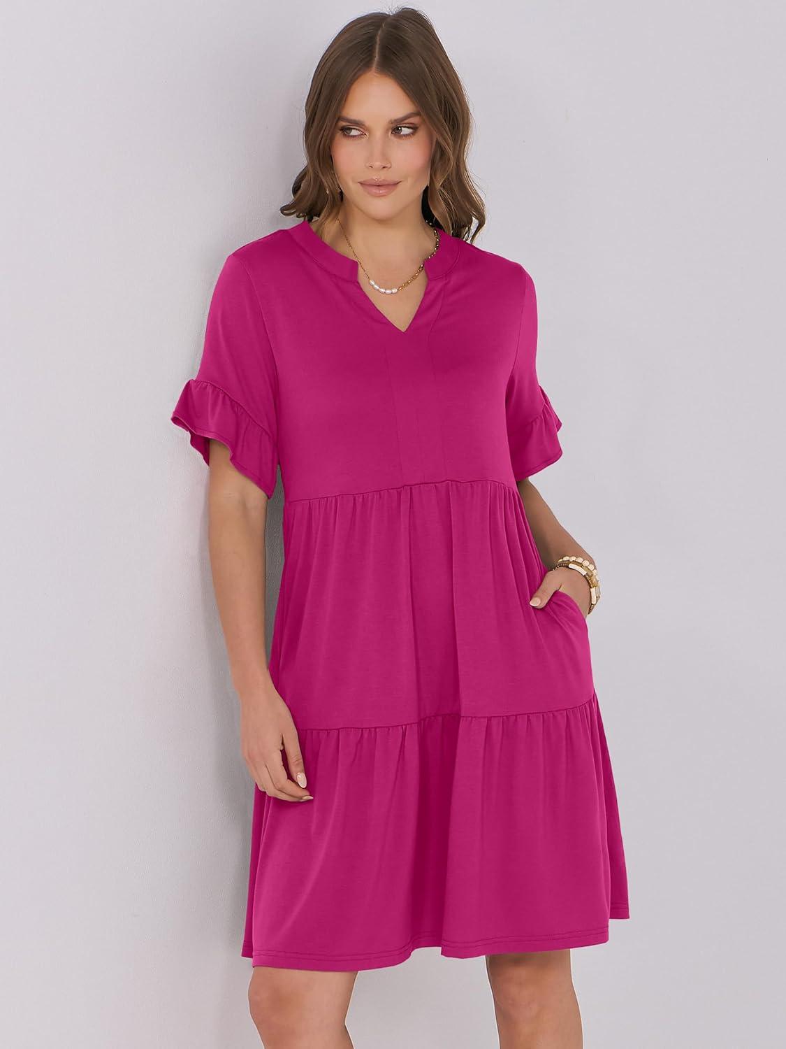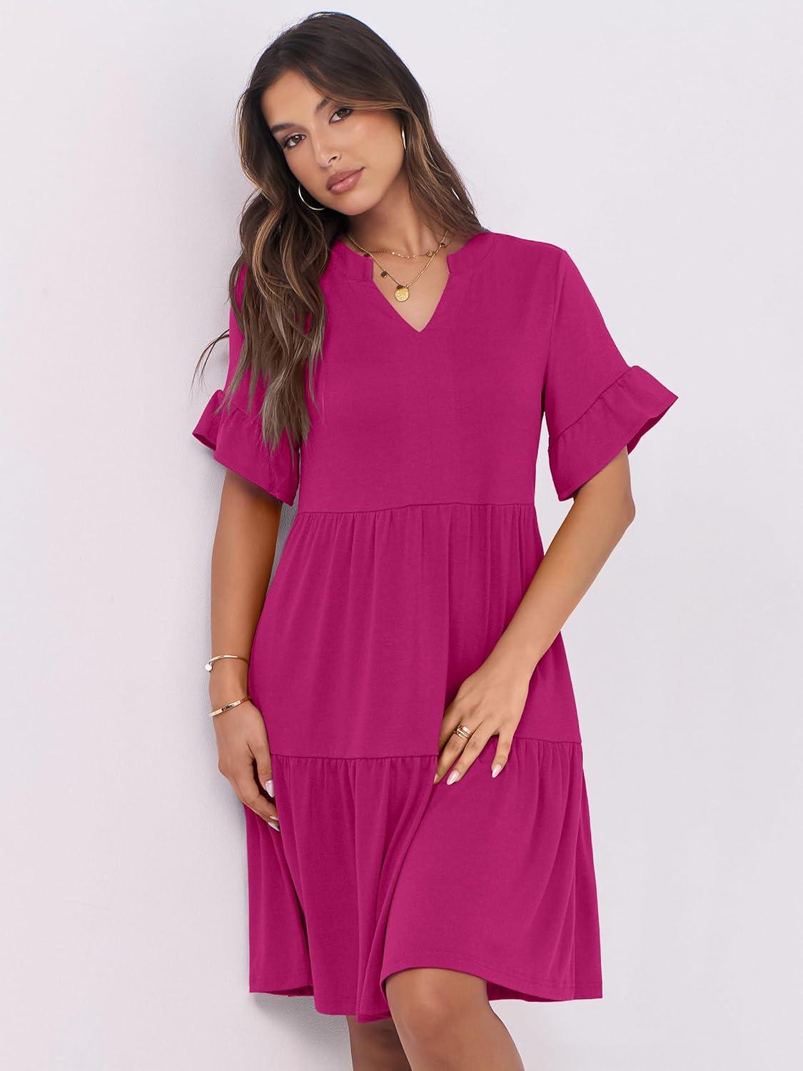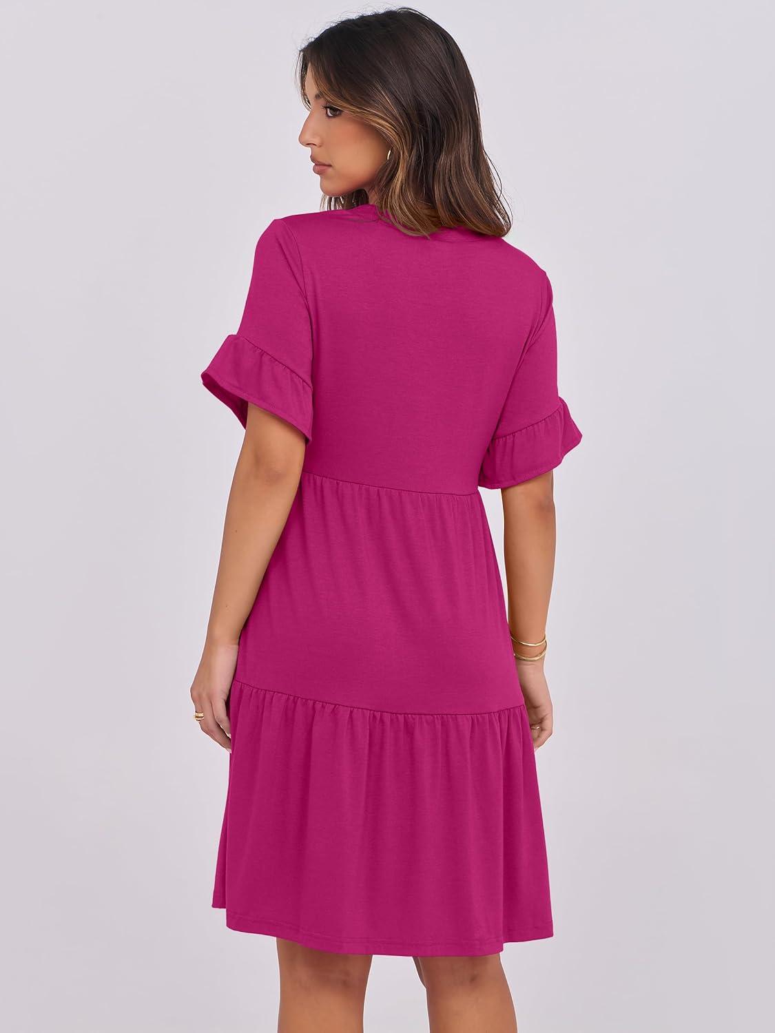ANRABESS Womens Summer 2026 Trendy Ruffle Short Sleeve V Neck A Line Tiered Flowy Loose Casual Mini Beach Dress with Pockets(Hot Pink)