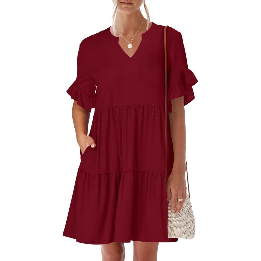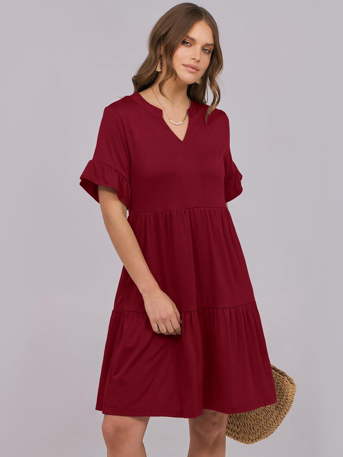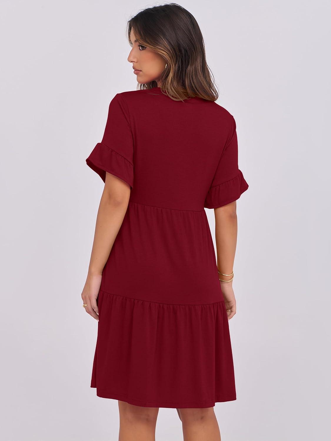 ANRABESS Womens Summer 2026 Trendy Ruffle Short Sleeve V Neck A Line Tiered Flowy Loose Casual Mini Beach Dress with Pockets(Wine Red)