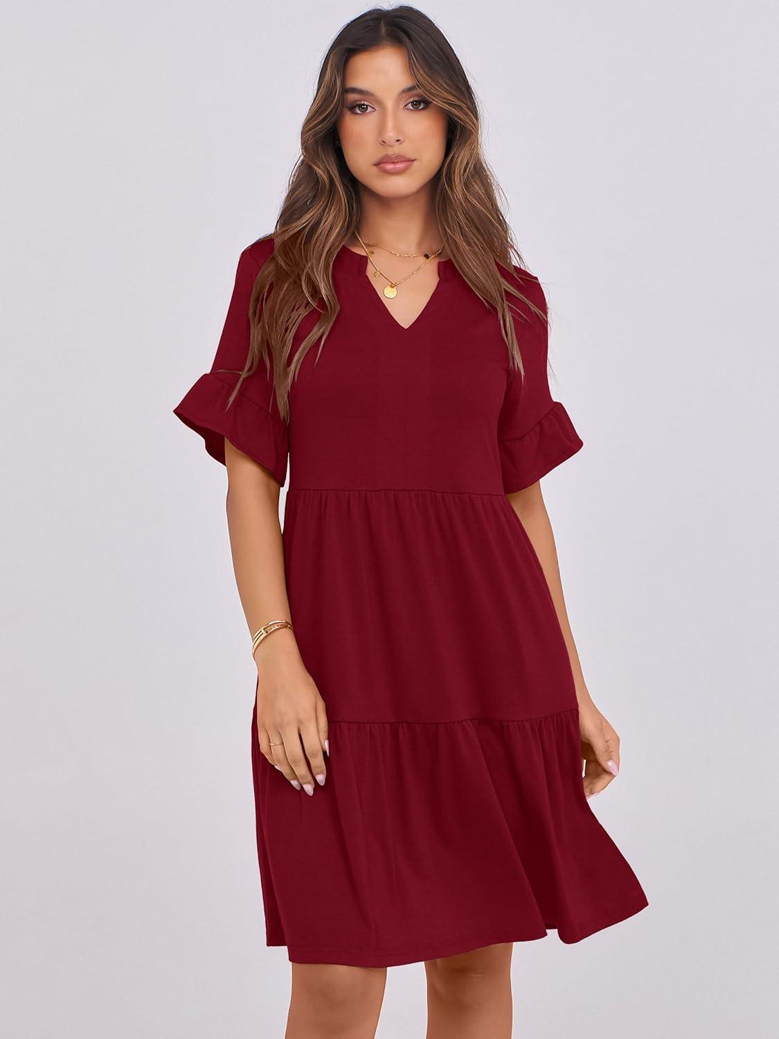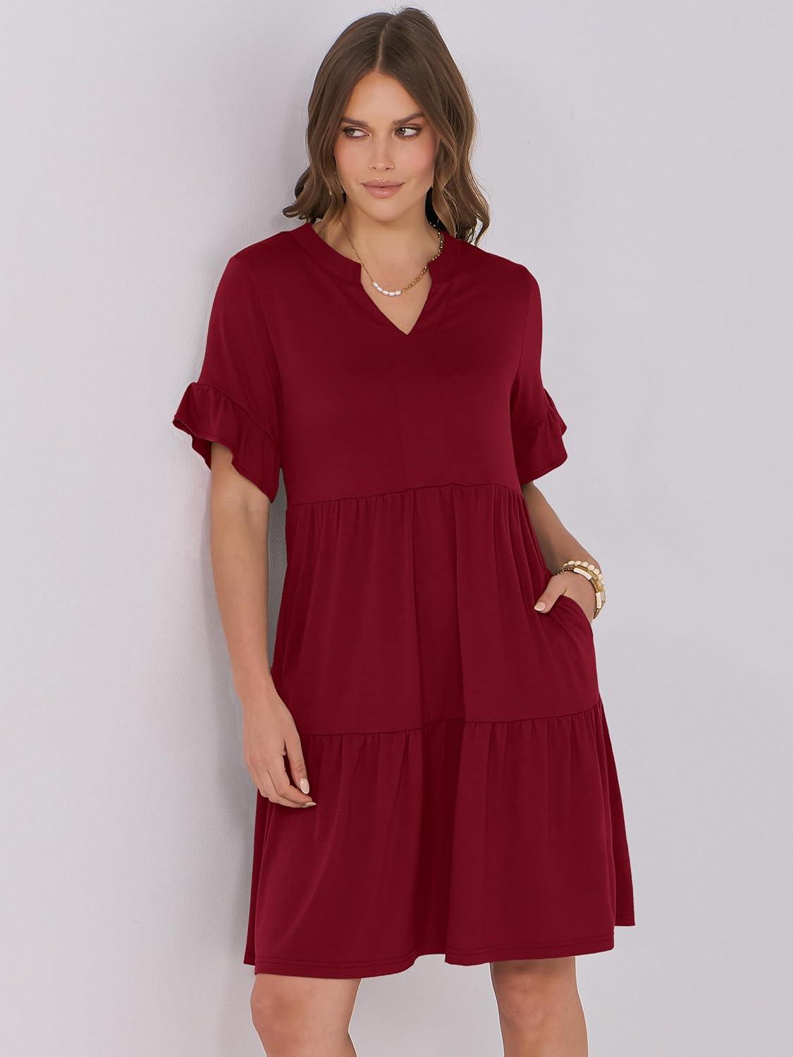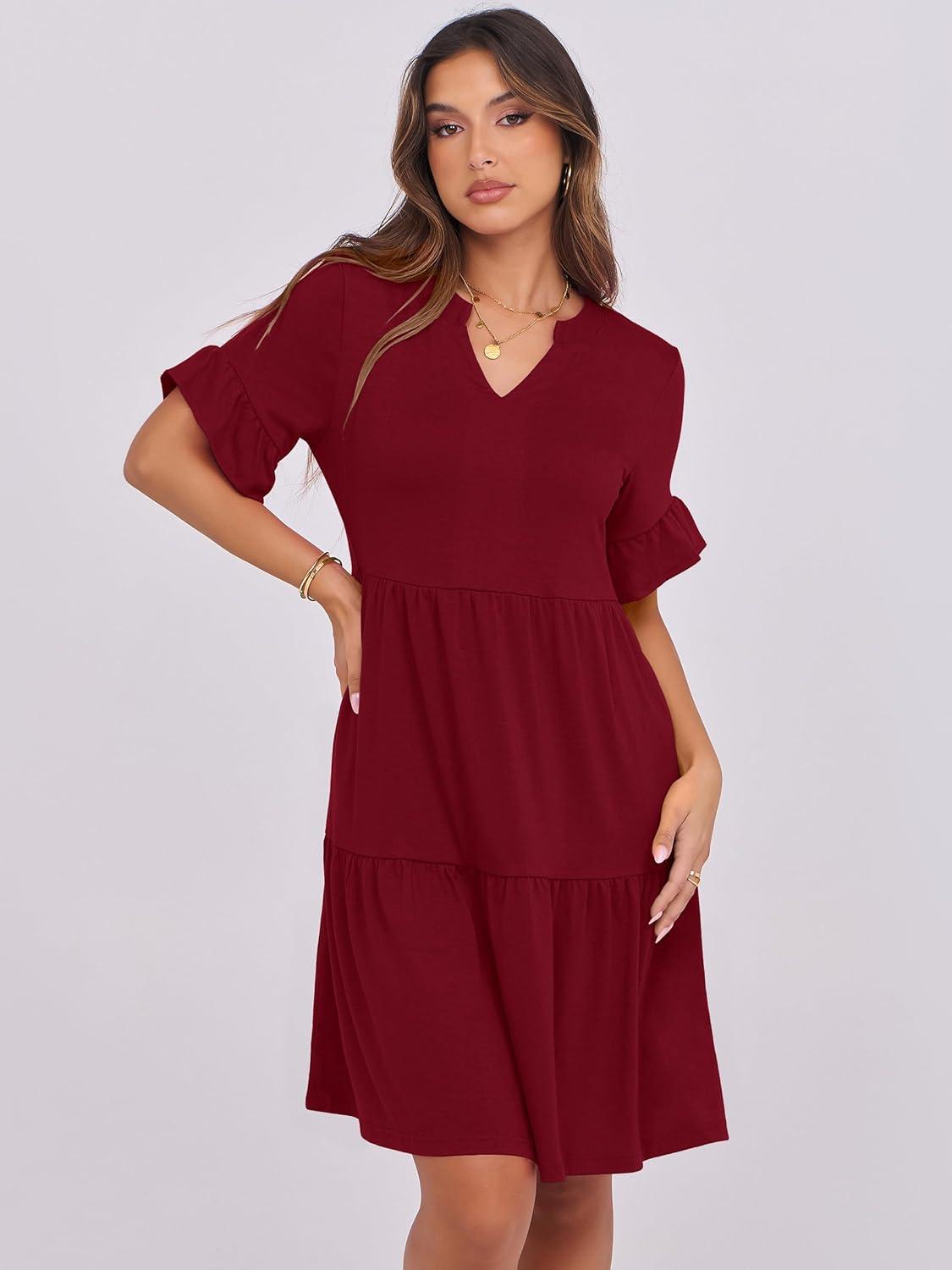ANRABESS Womens Summer 2026 Trendy Ruffle Short Sleeve V Neck A Line Tiered Flowy Loose Casual Mini Beach Dress with Pockets(Wine Red)