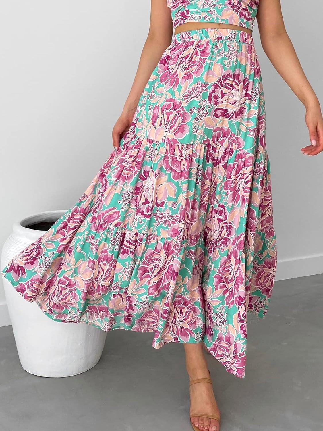 ANRABESS Women’s Summer Boho Flowy Swing Tiered A-Line Maxi Skirt 2025 Fashion Trendy Elastic Waist Pleated Long Beach Dress(Floral 03)