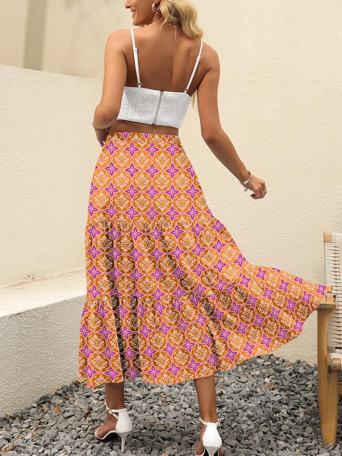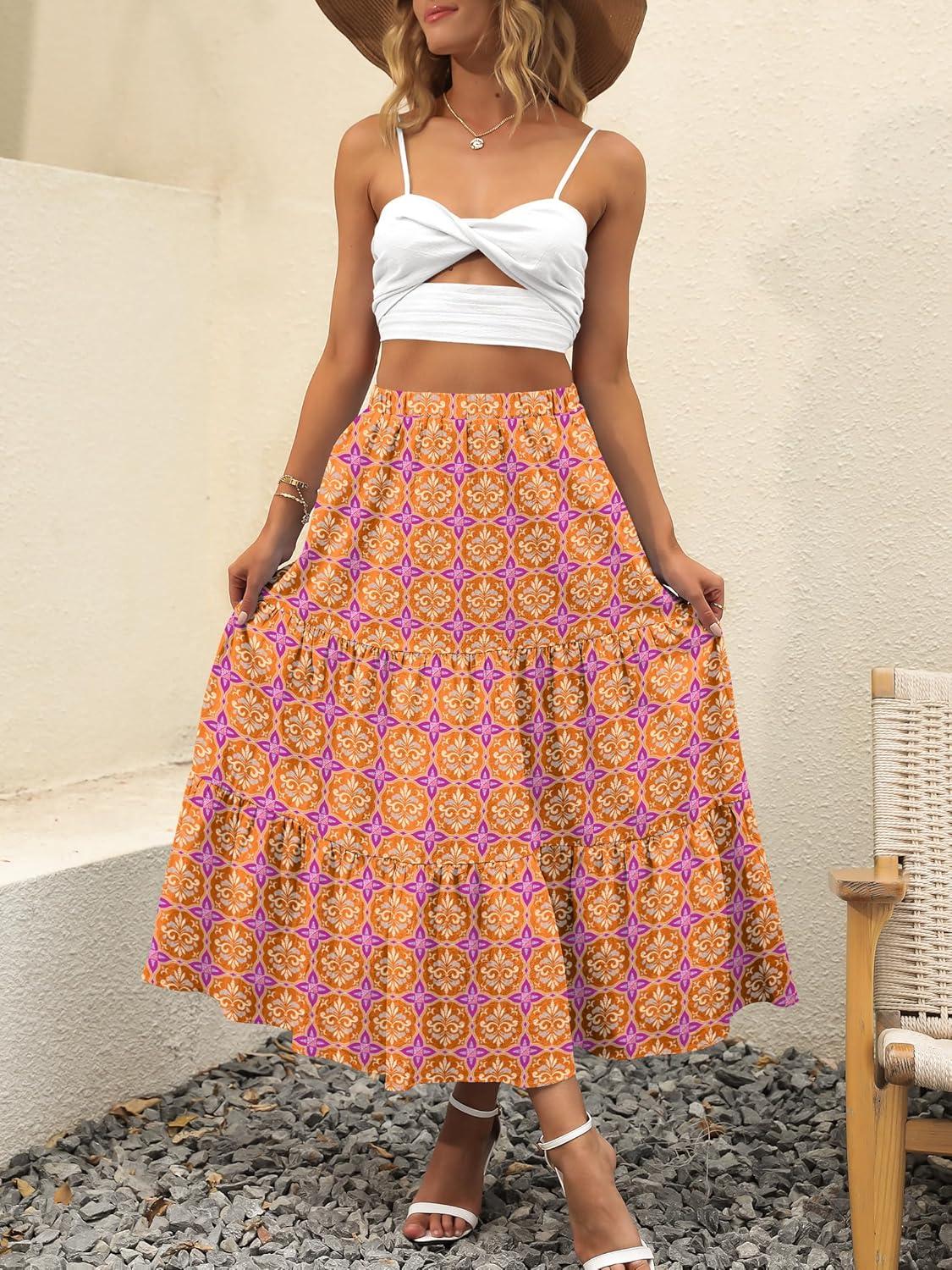 ANRABESS Women’s Summer Boho Flowy Swing Tiered A-Line Maxi Skirt 2025 Fashion Trendy Elastic Waist Pleated Long Beach Dress(Floral Pink)