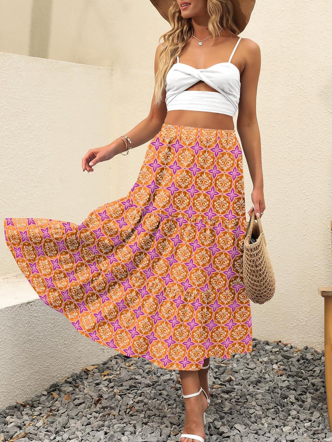 ANRABESS Women’s Summer Boho Flowy Swing Tiered A-Line Maxi Skirt 2025 Fashion Trendy Elastic Waist Pleated Long Beach Dress(Floral Yellow Purple)