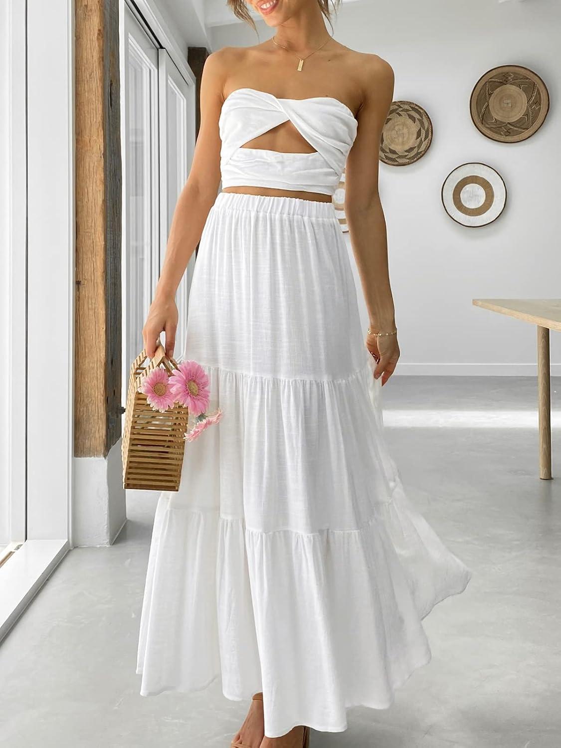 ANRABESS Women’s Summer Boho Flowy Swing Tiered A-Line Maxi Skirt 2025 Fashion Trendy Elastic Waist Pleated Long Beach Dress(White)