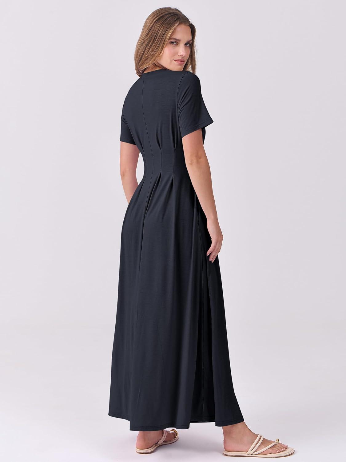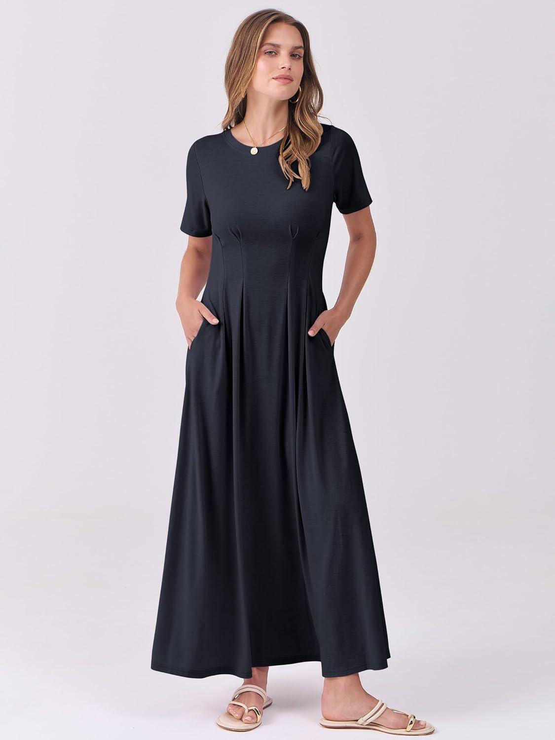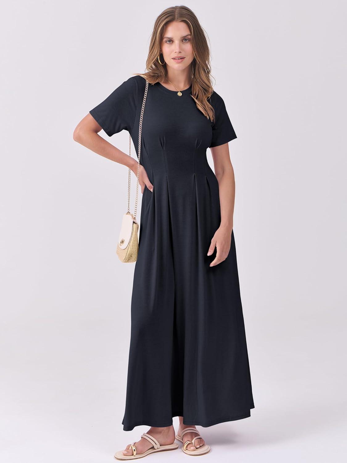 ANRABESS Women's Summer Casual Dress Short Sleeve Crewneck Pleated Waisted Swing Flowy 2025 A Line Beach Maxi Long Dresses(Navy Blue)