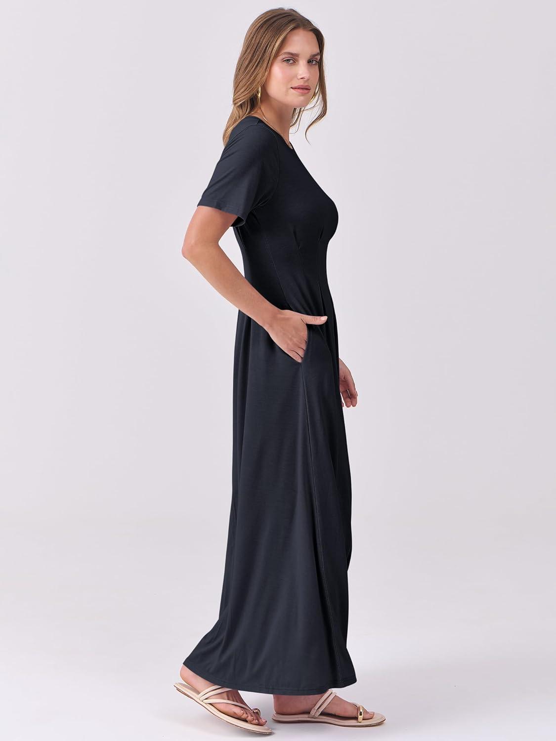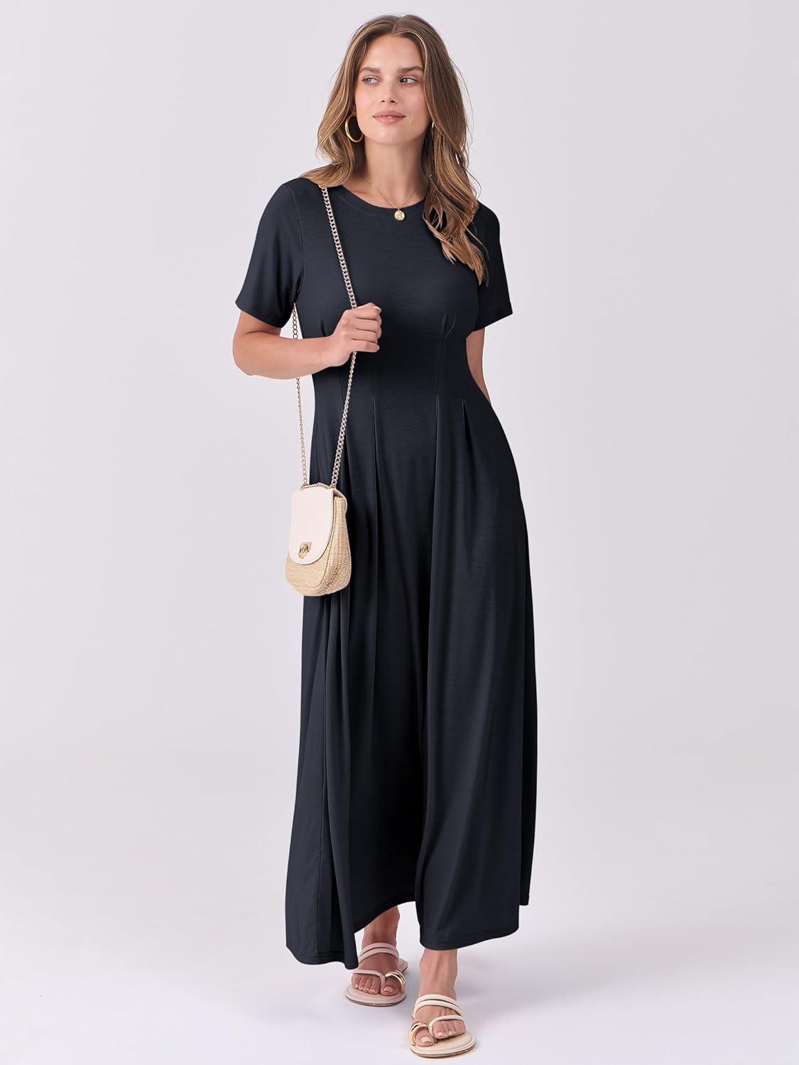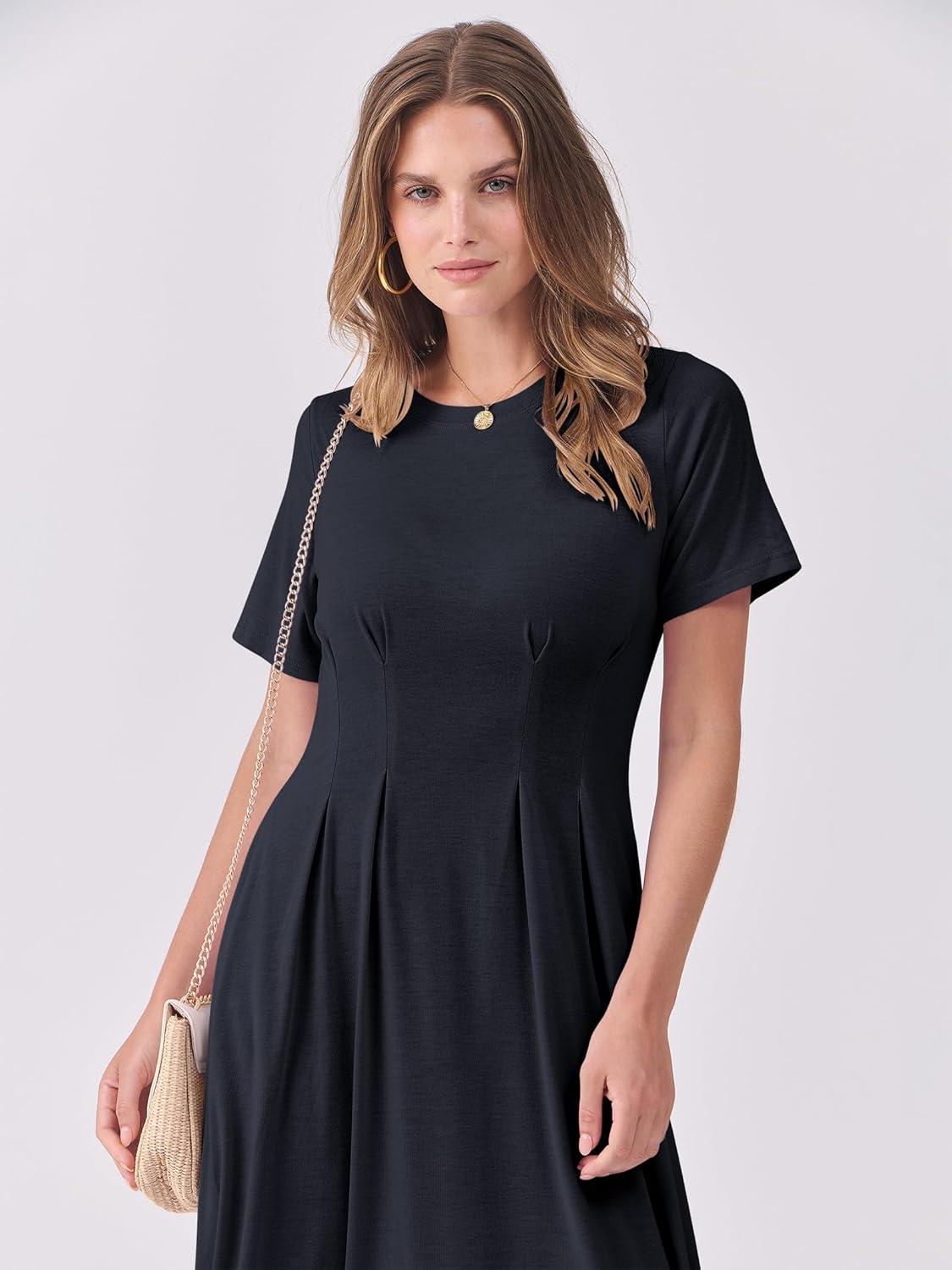ANRABESS Women's Summer Casual Dress Short Sleeve Crewneck Pleated Waisted Swing Flowy 2025 A Line Beach Maxi Long Dresses(Navy Blue)