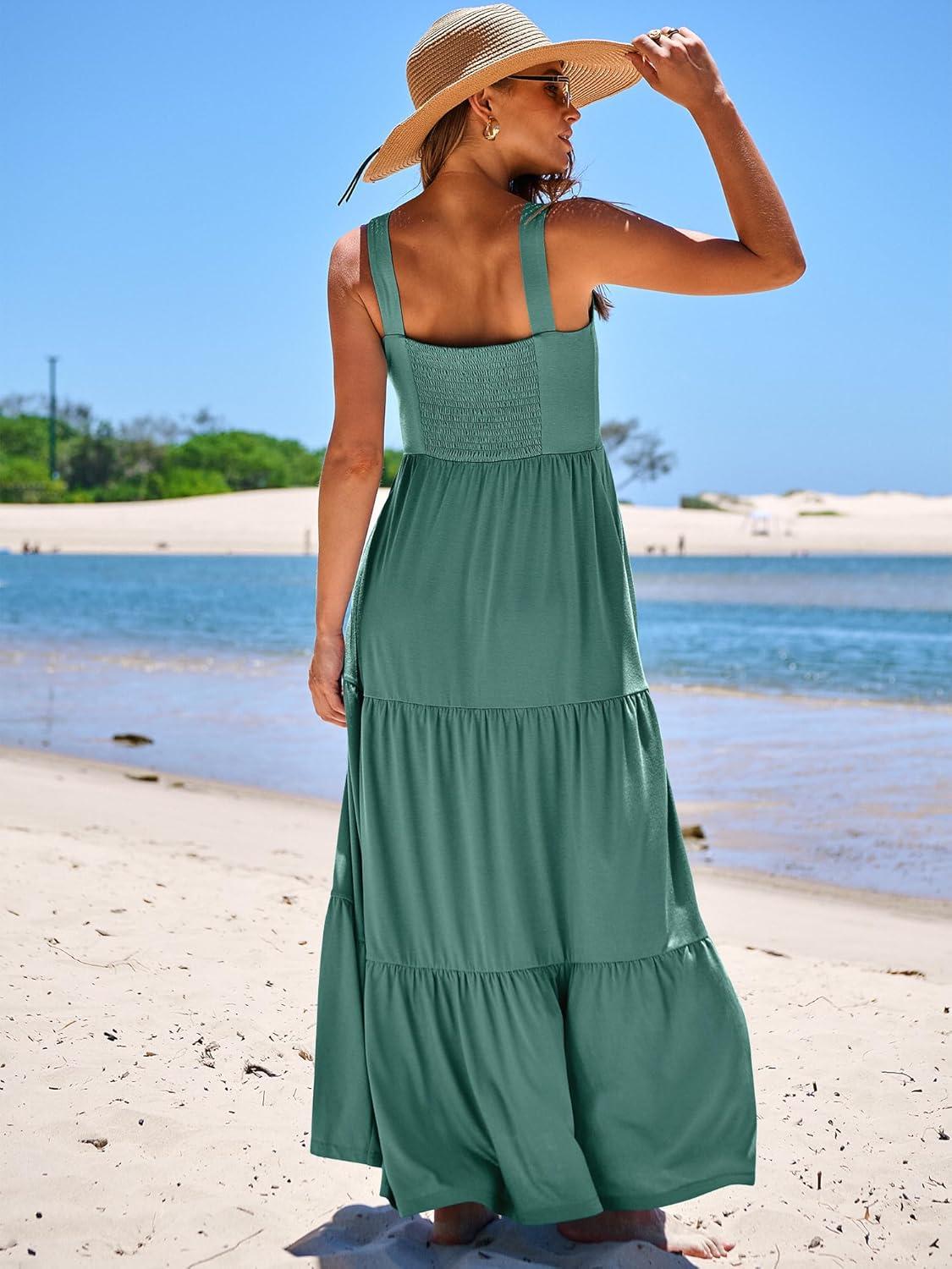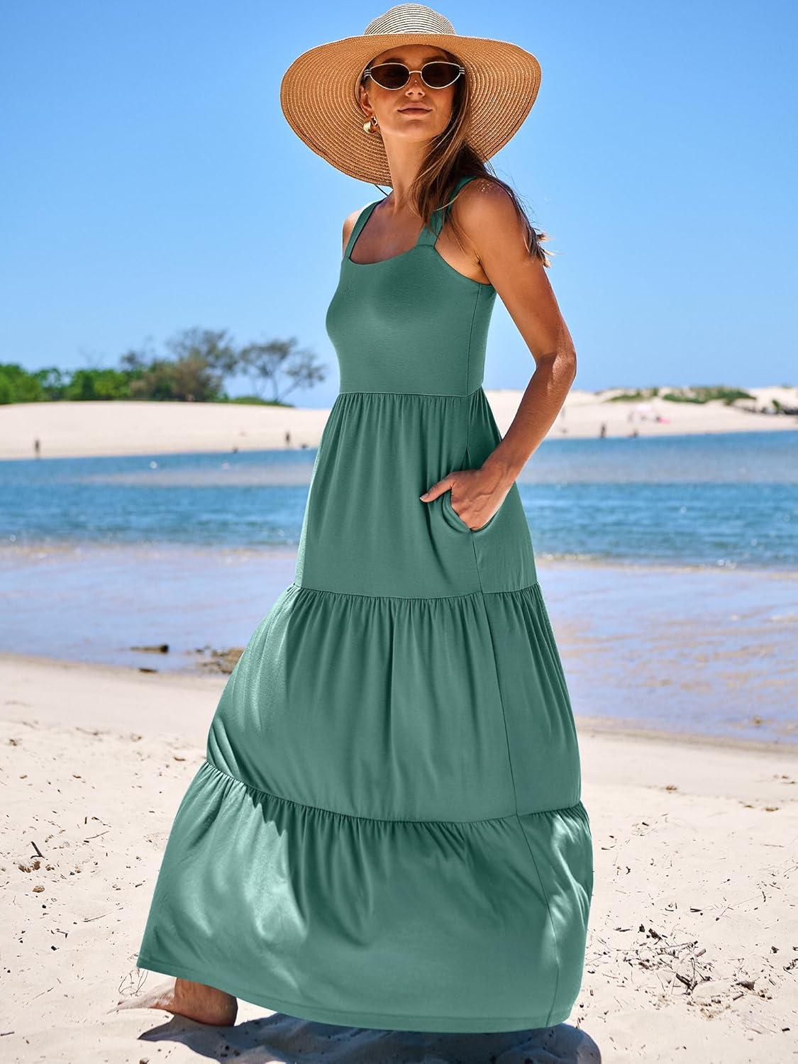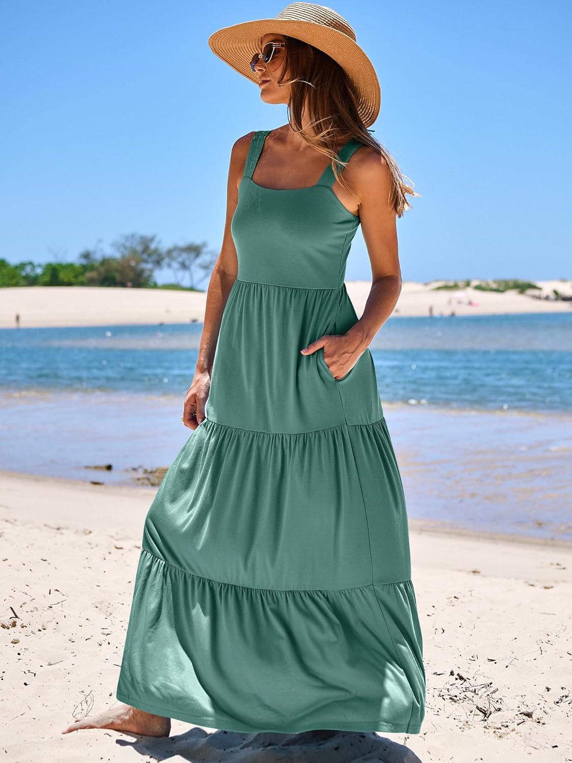 ANRABESS Women’s Summer Casual Long Maxi Beach Vacation Dresses Sleeveless Square Neck Flowy Tiered Sun Dress with Pockets(Grass)