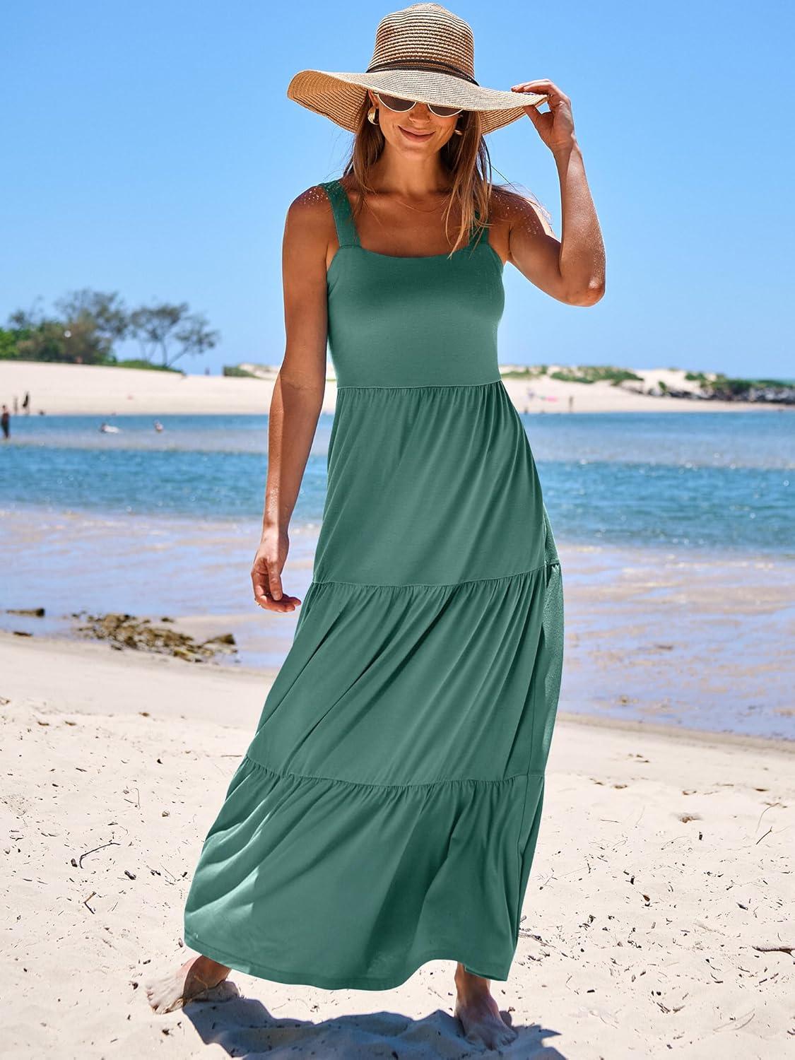 ANRABESS Women's Summer Casual Long Maxi Beach Vacation Dresses Sleeveless Square Neck Flowy Tiered Sun Dress with Pockets(Grass)
