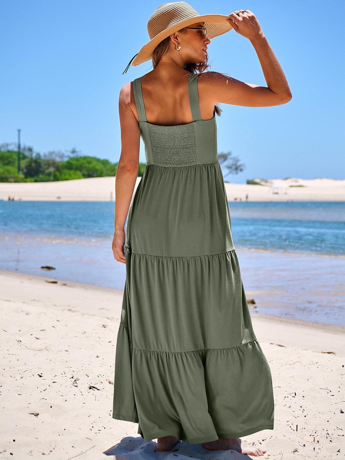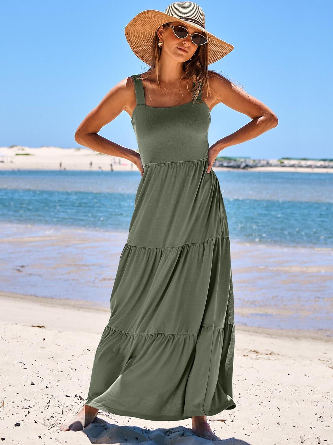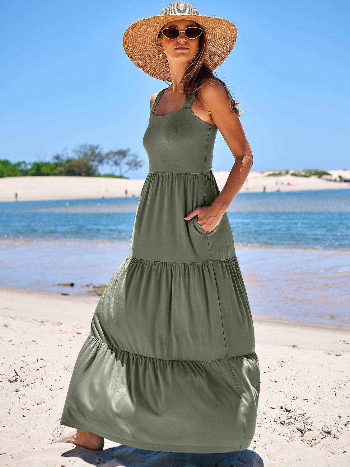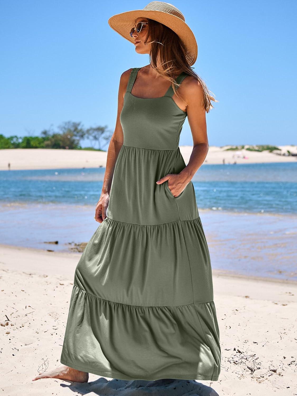 ANRABESS Women’s Summer Casual Long Maxi Beach Vacation Dresses Sleeveless Square Neck Flowy Tiered Sun Dress with Pockets(Olive)