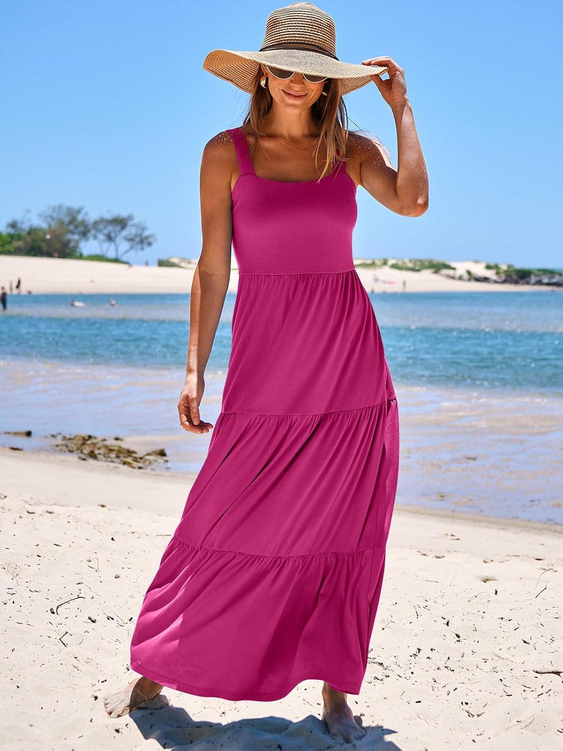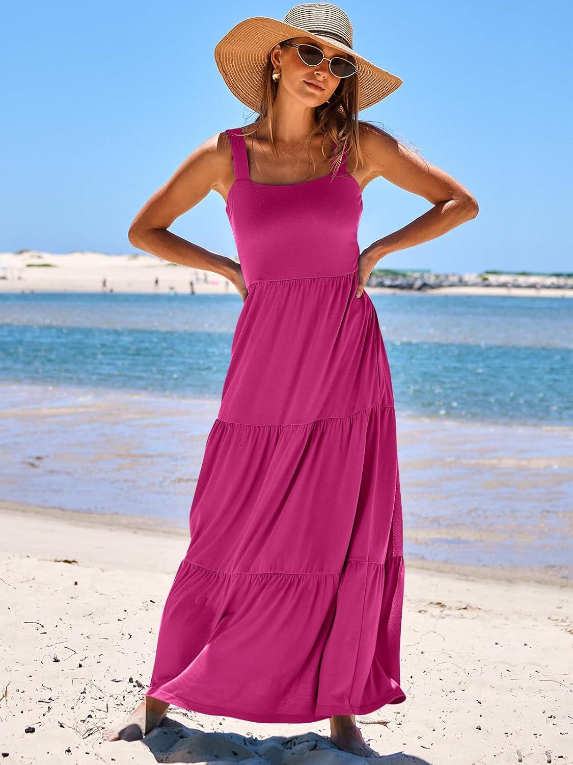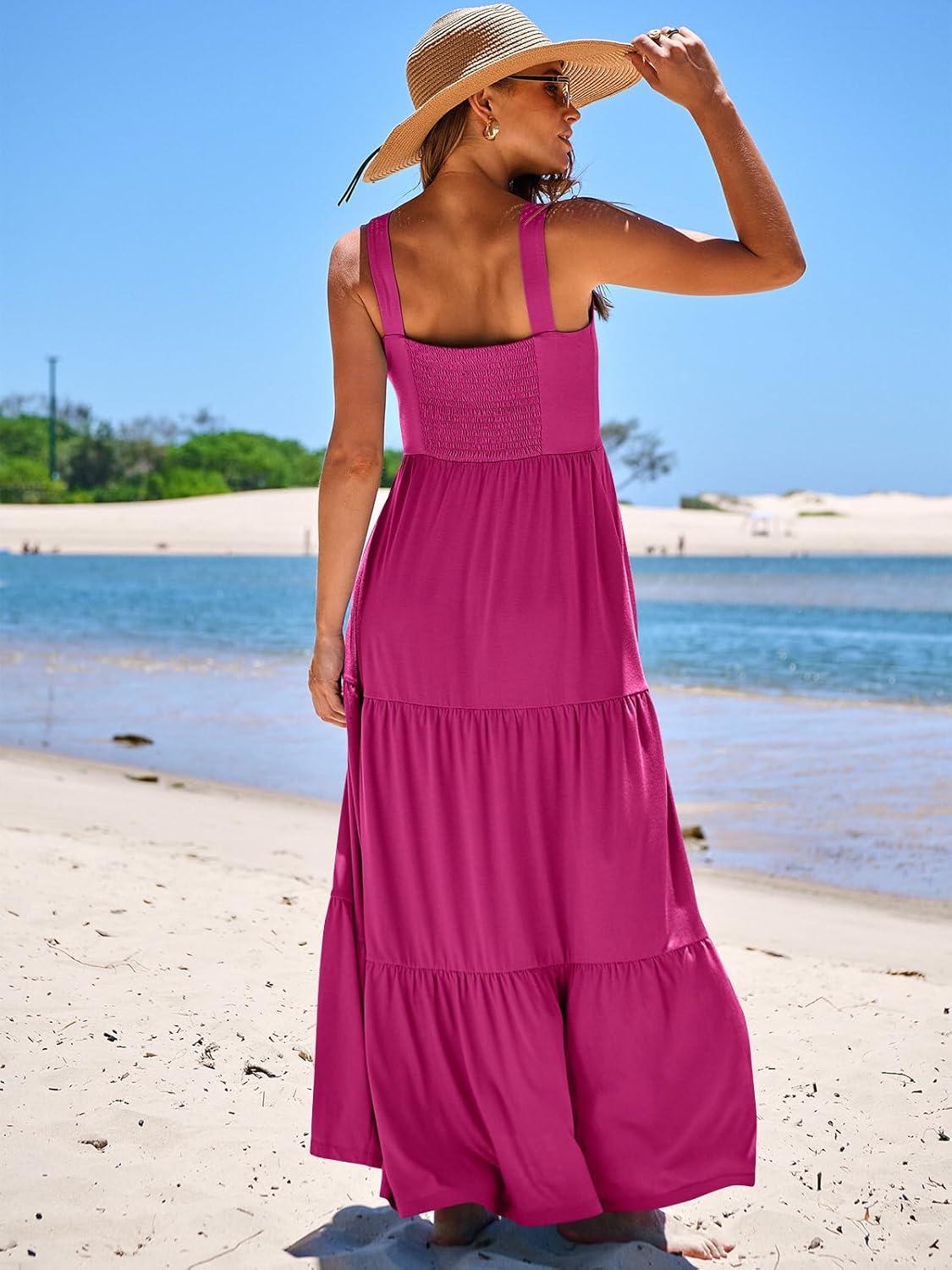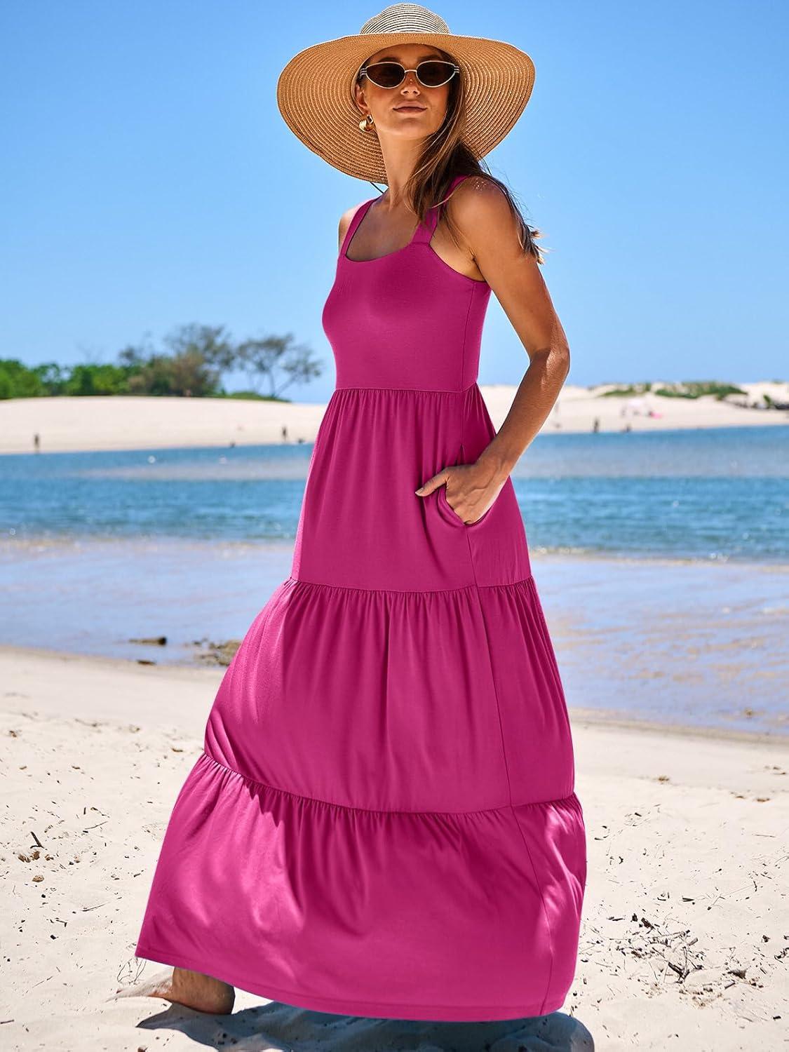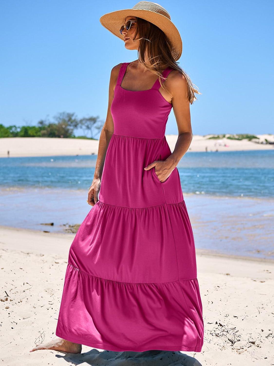 ANRABESS Women’s Summer Casual Long Maxi Beach Vacation Dresses Sleeveless Square Neck Flowy Tiered Sun Dress with Pockets(Rose Pink)