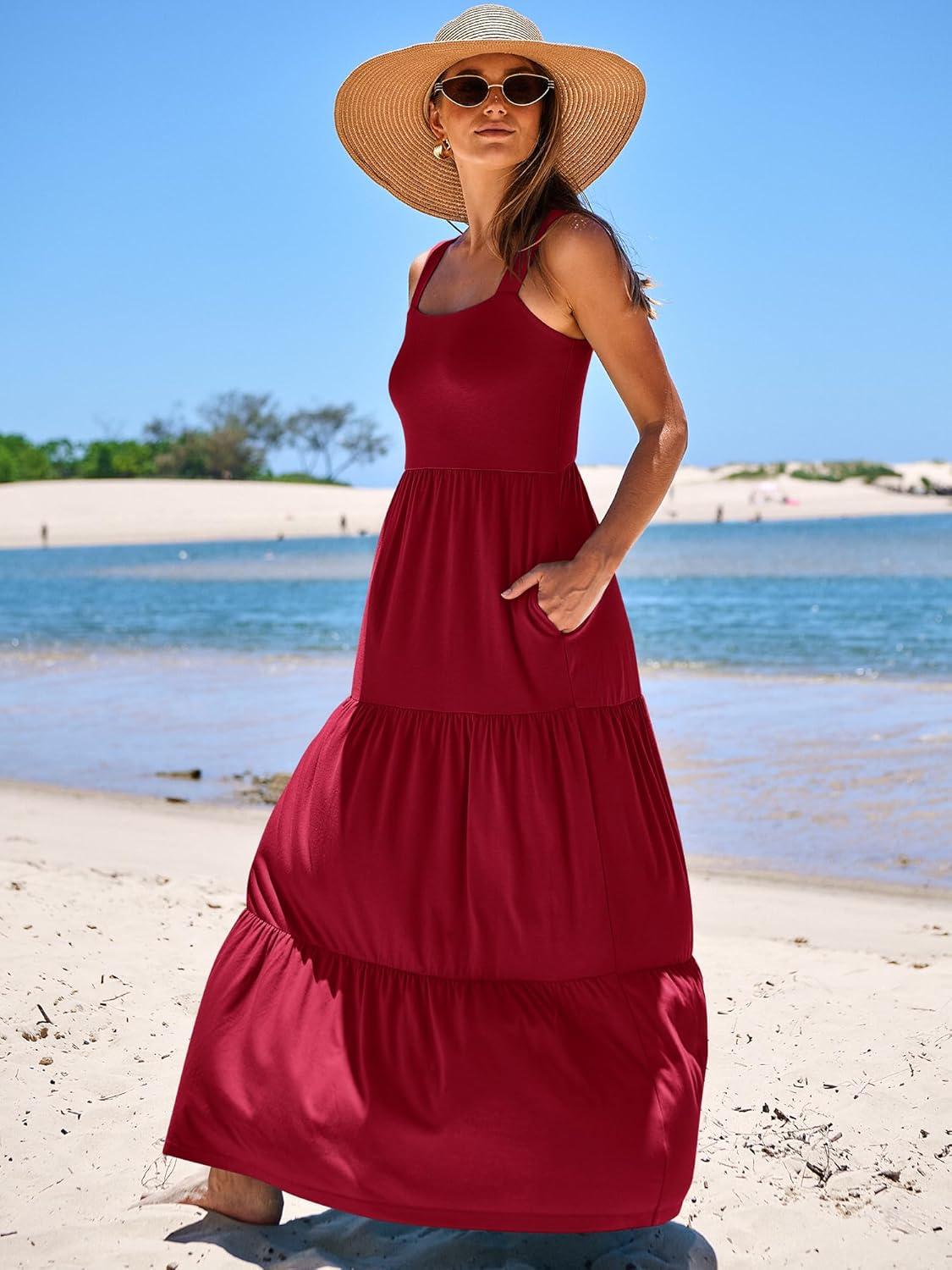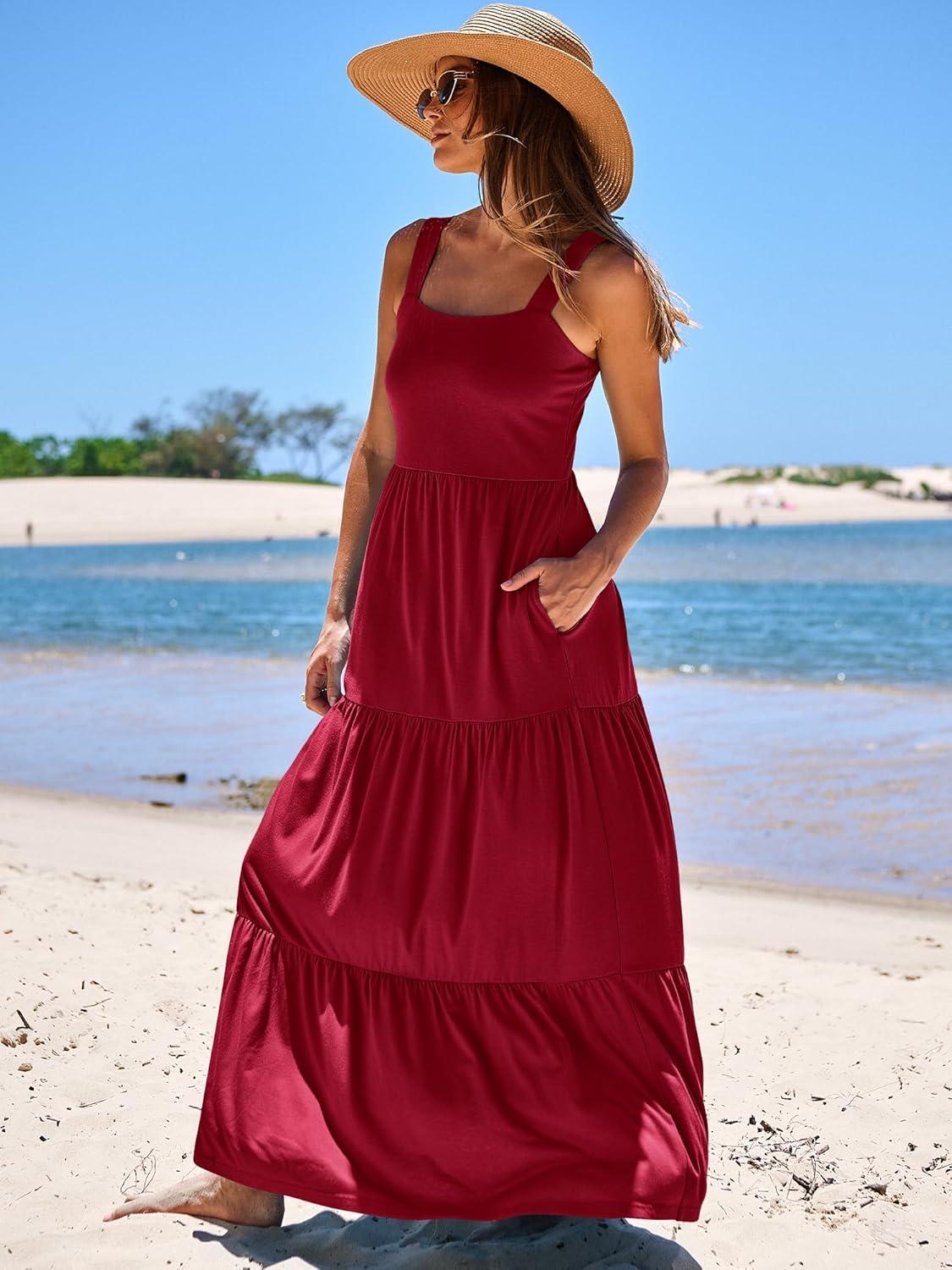 ANRABESS Women’s Summer Casual Long Maxi Beach Vacation Dresses Sleeveless Square Neck Flowy Tiered Sun Dress with Pockets(Wine Red)