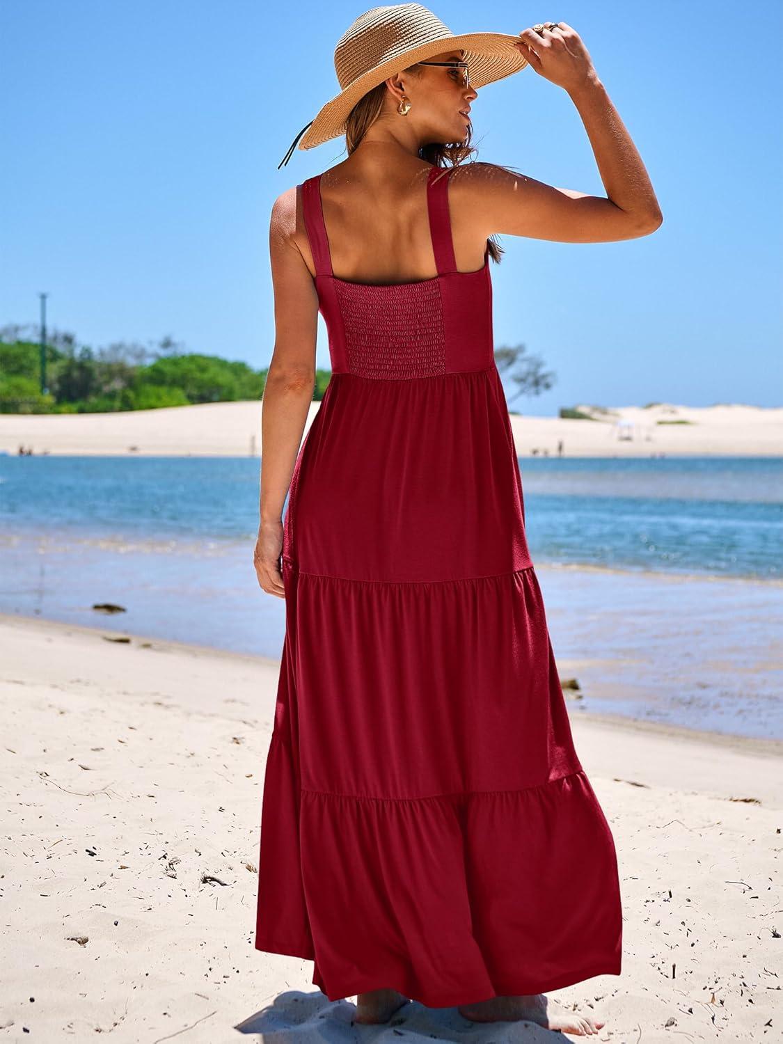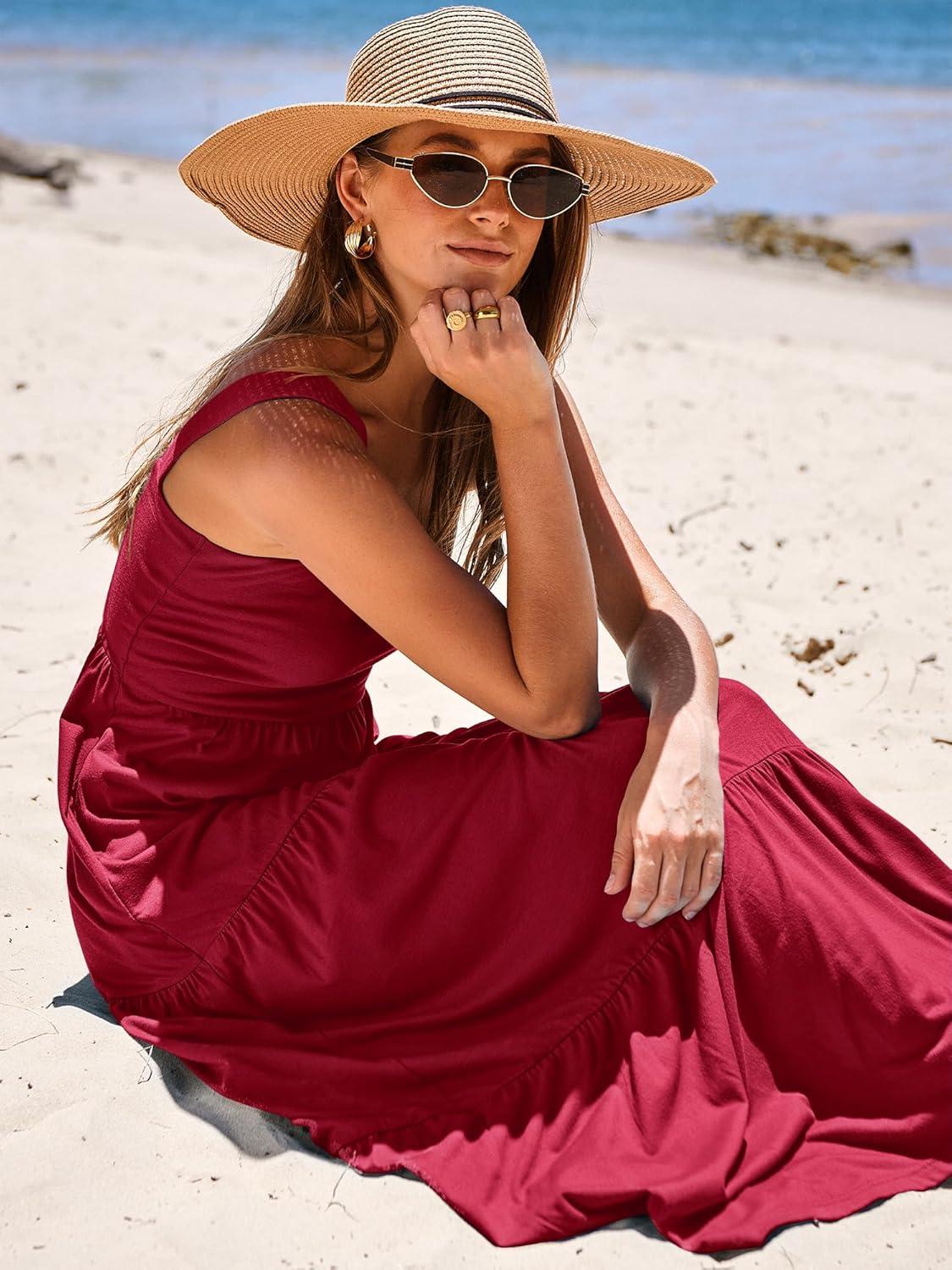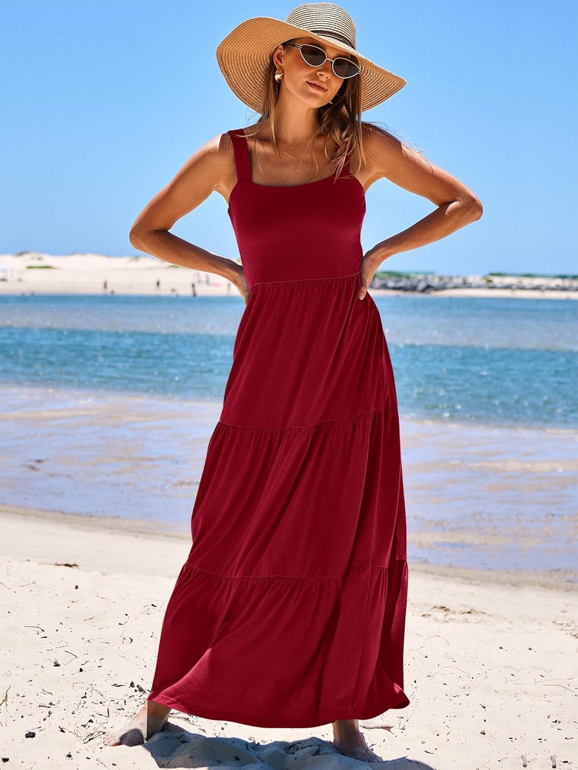 ANRABESS Women’s Summer Casual Long Maxi Beach Vacation Dresses Sleeveless Square Neck Flowy Tiered Sun Dress with Pockets(Red)