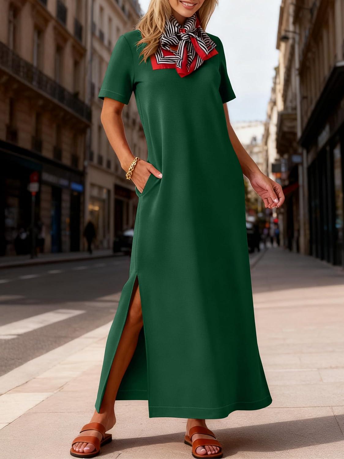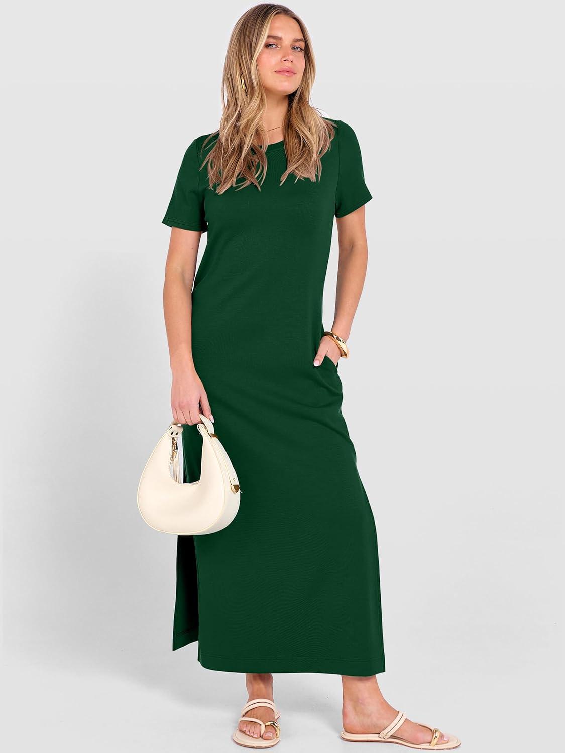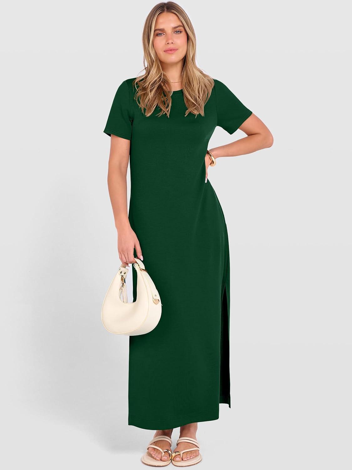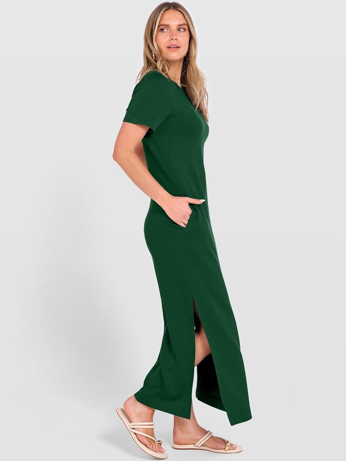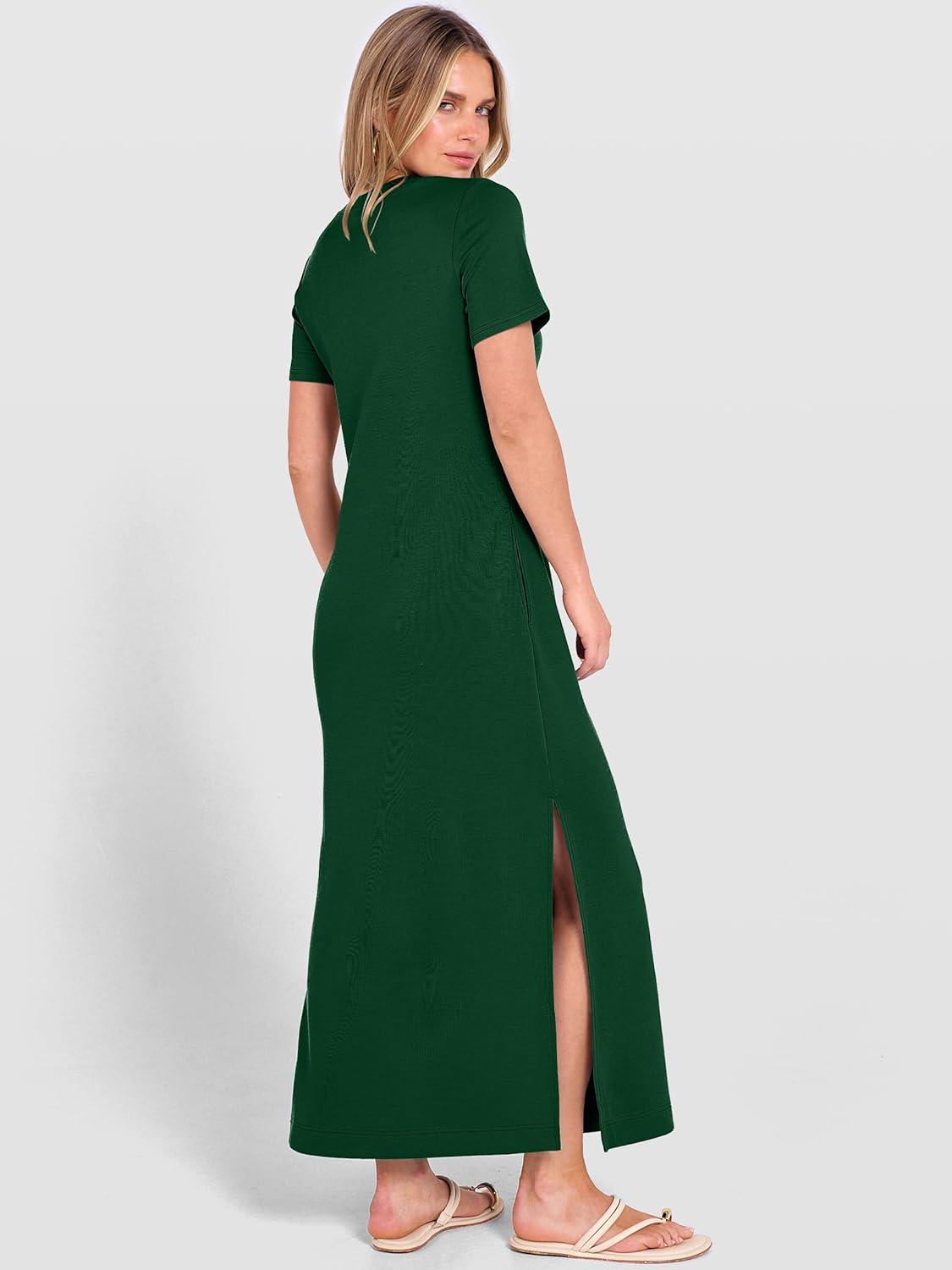 ANRABESS Womens Summer Casual Maxi Dress Short Sleeve Crewneck Loose Split Wrinkle-Free Beach Travel Vacation Long Sundress(Forest Green)