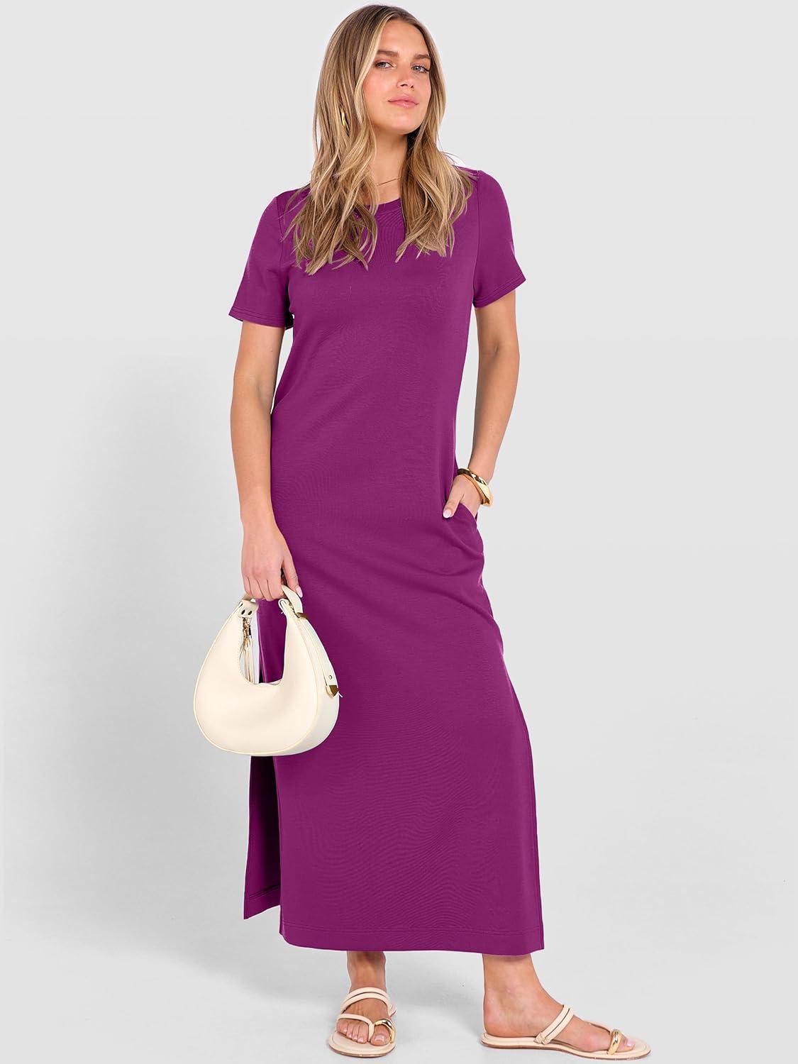 ANRABESS Womens Summer Casual Maxi Dress Short Sleeve Crewneck Split Wrinkle-Free Travel Long Sundress Beach Vacation Clothes(Purple Red)