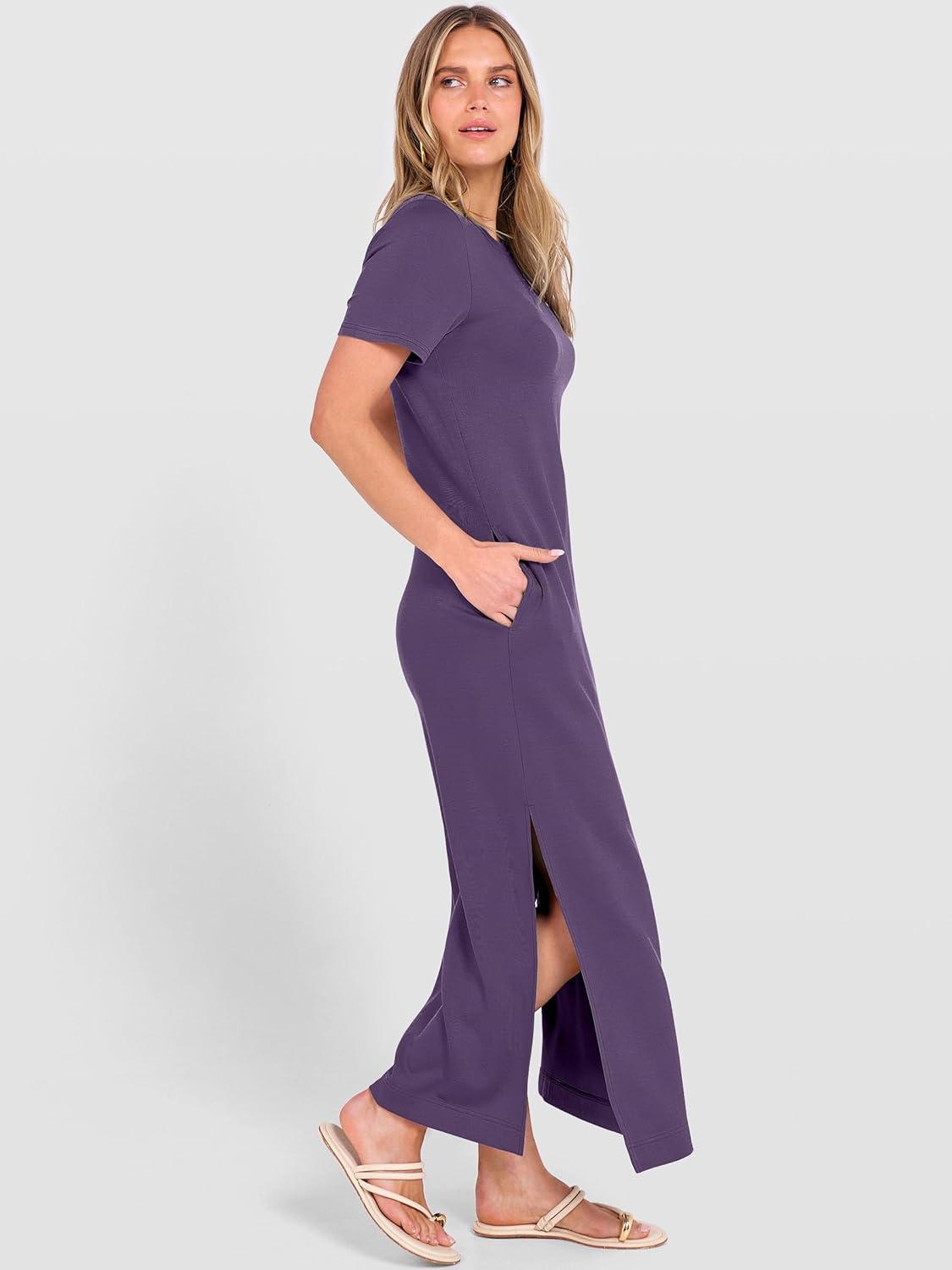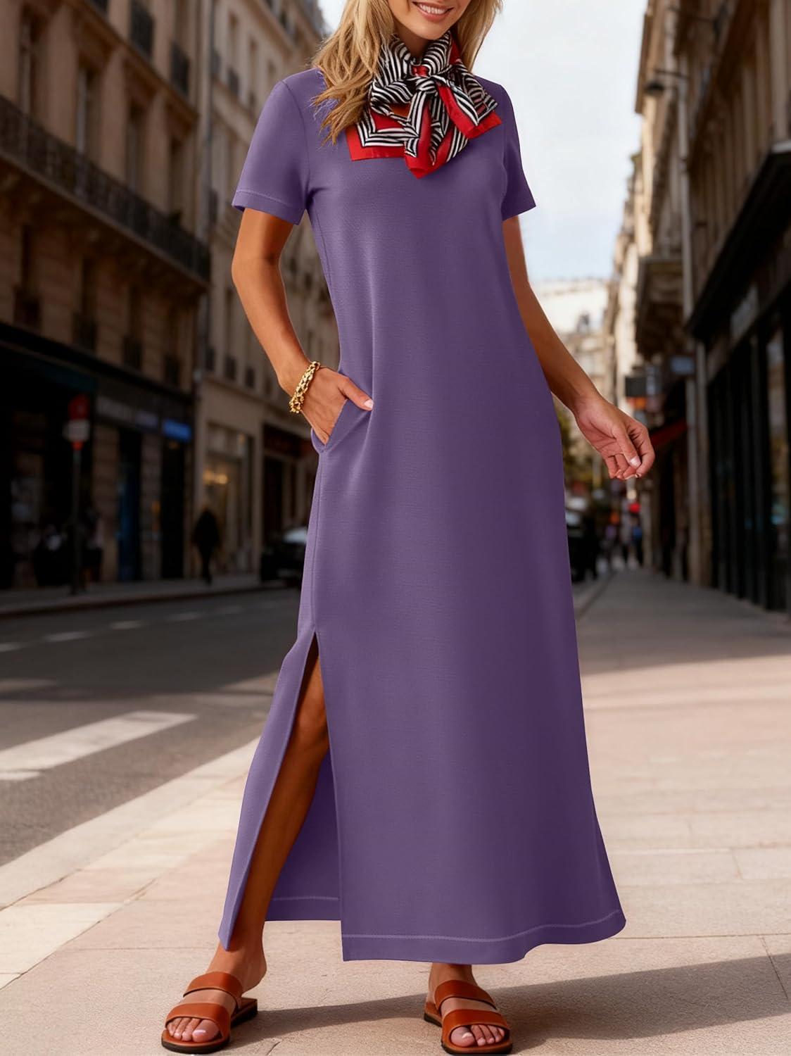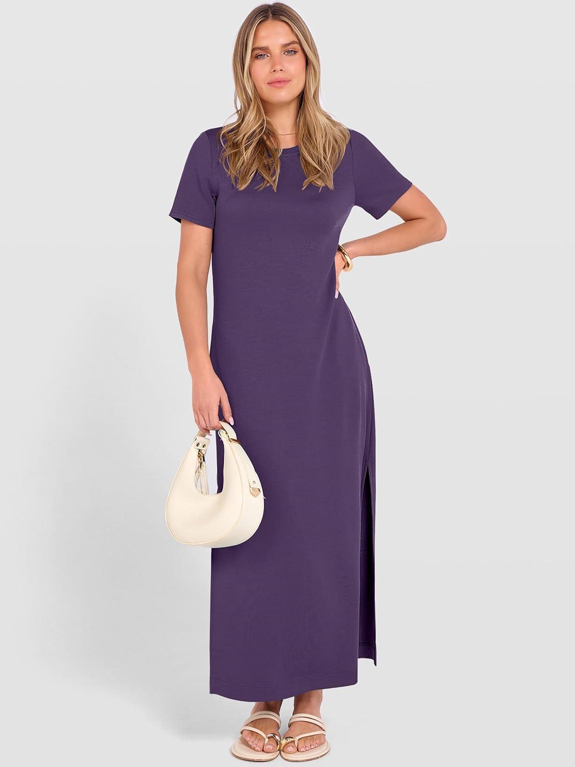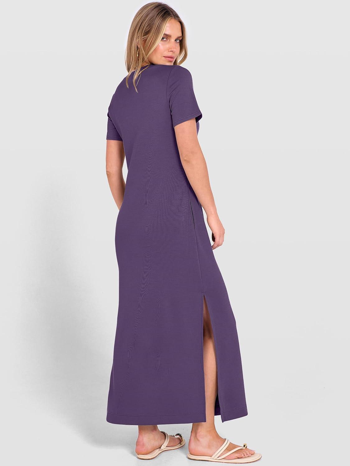 ANRABESS Womens Summer Casual Maxi Dress Short Sleeve Crewneck Split Wrinkle-Free Travel Long Sundress Beach Vacation Clothes(Purple)