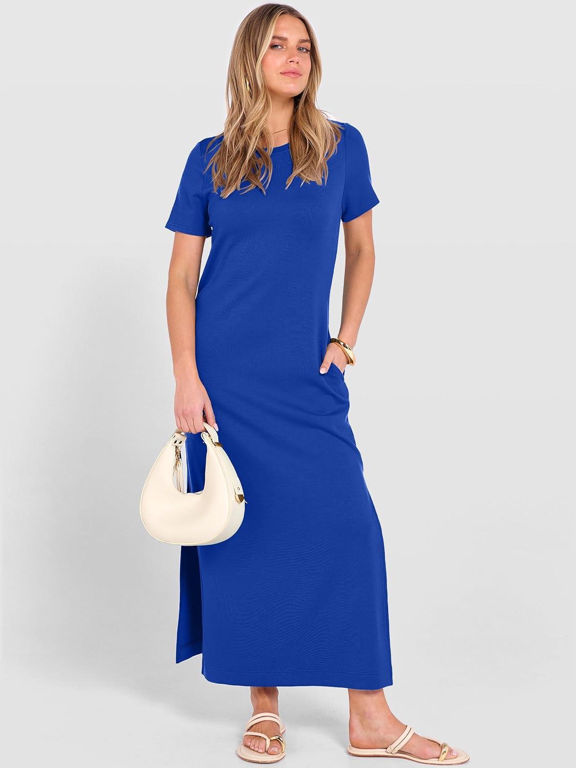 ANRABESS Womens Summer Casual Maxi Dress Short Sleeve Crewneck Split Wrinkle-Free Travel Long Sundress Beach Vacation Clothes(Royal Blue)