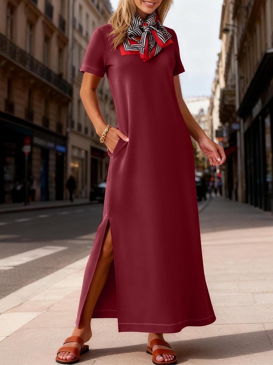 imageANRABESS Womens Summer Casual Maxi Dress Short Sleeve Crewneck Split WrinkleFree Travel Long Sundress Beach Vacation ClothesWine Red
