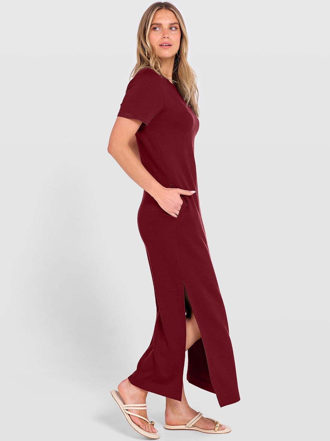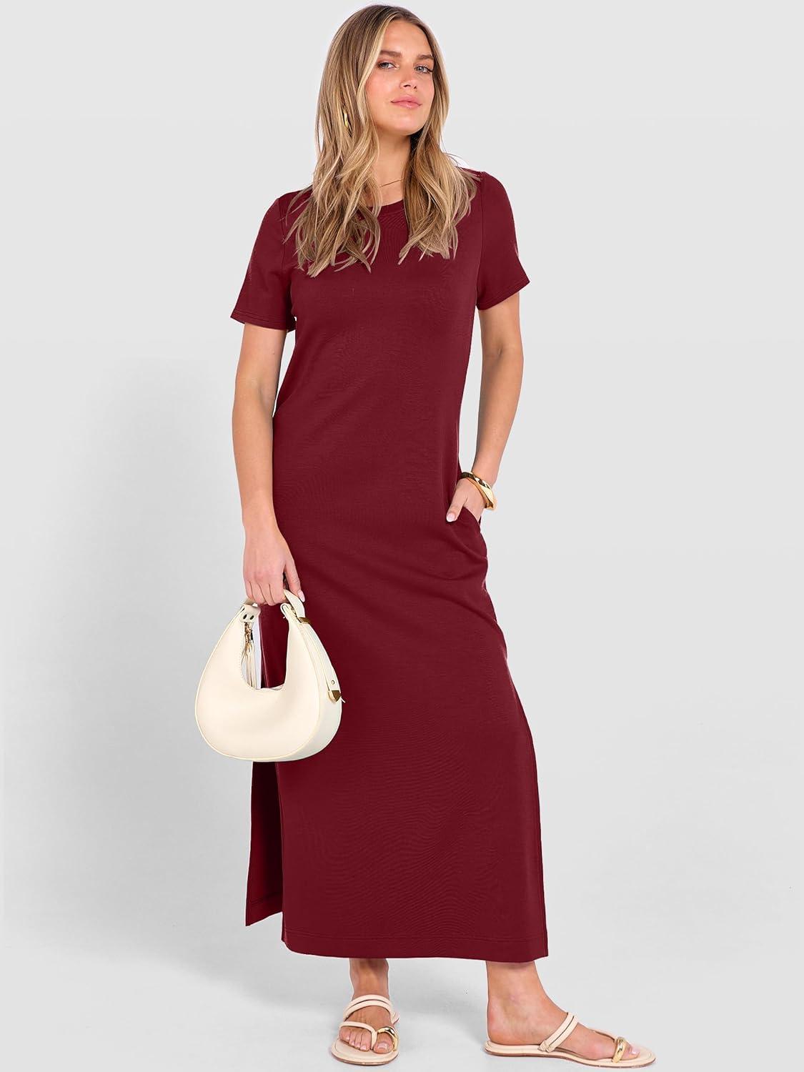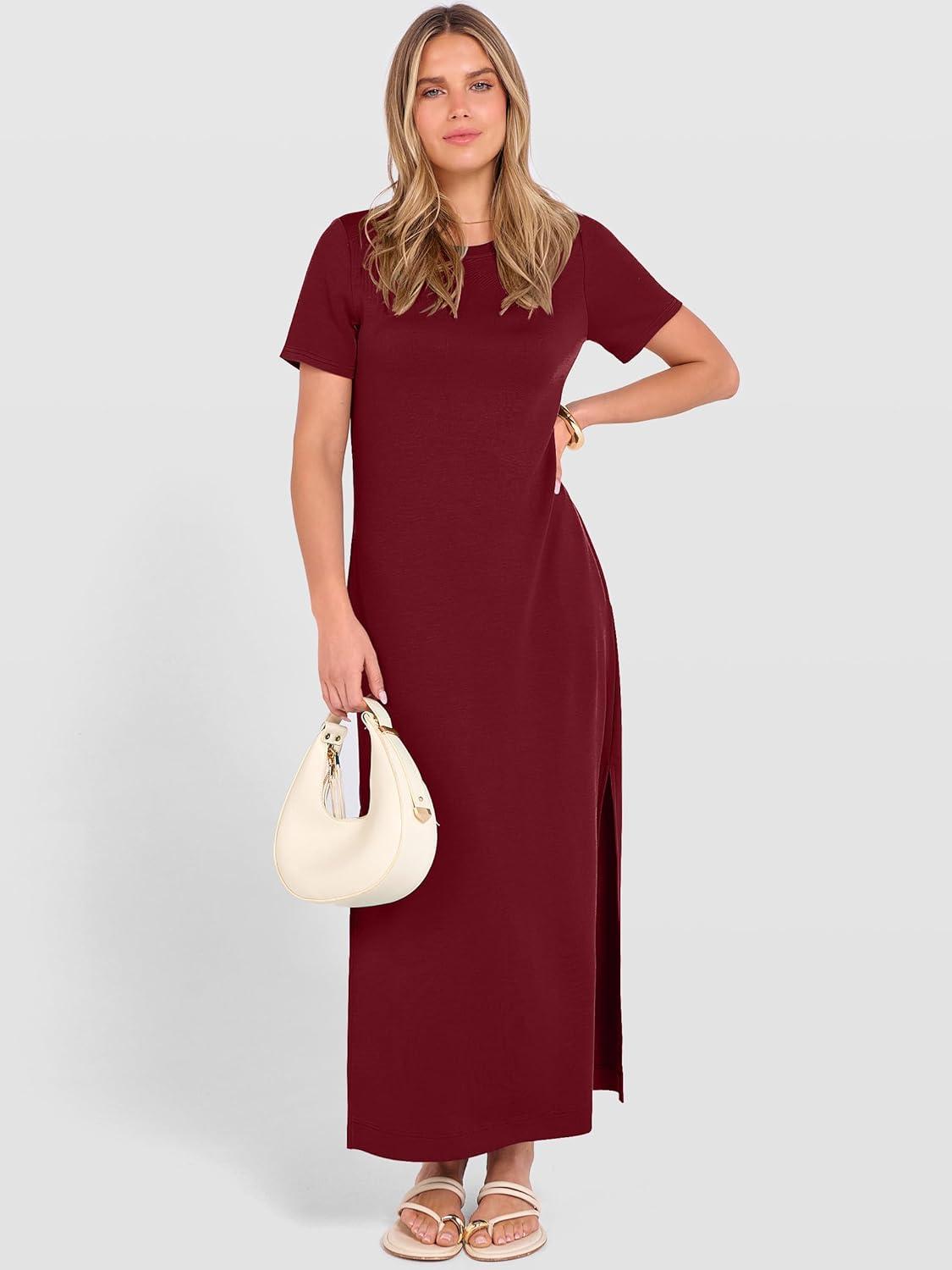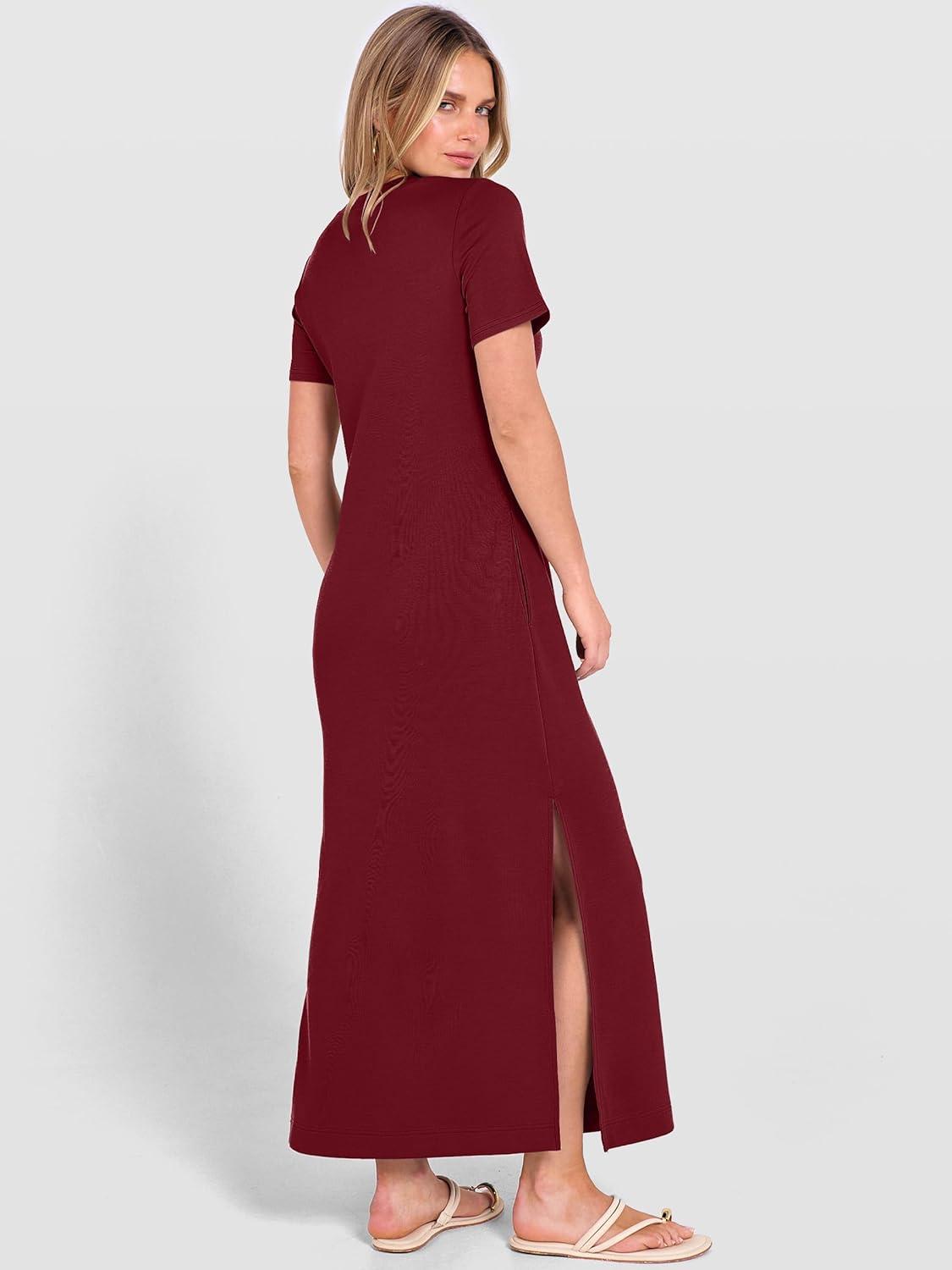 ANRABESS Womens Summer Casual Maxi Dress Short Sleeve Crewneck Split Wrinkle-Free Travel Long Sundress Beach Vacation Clothes(Wine Red)