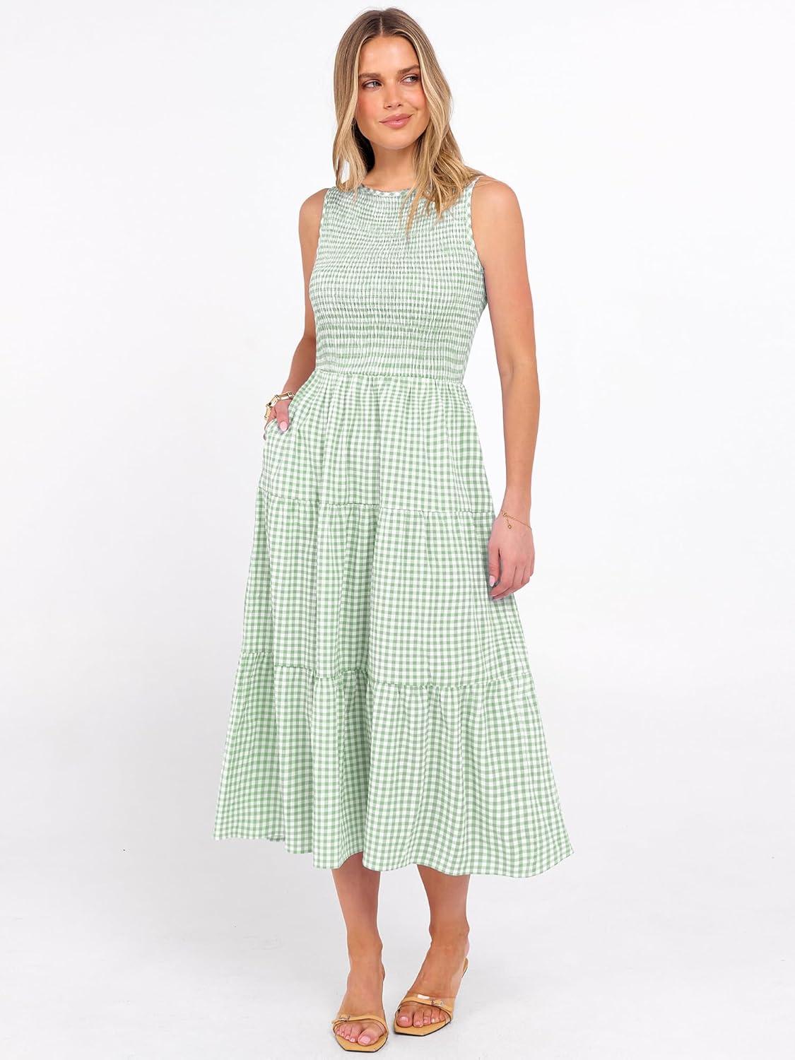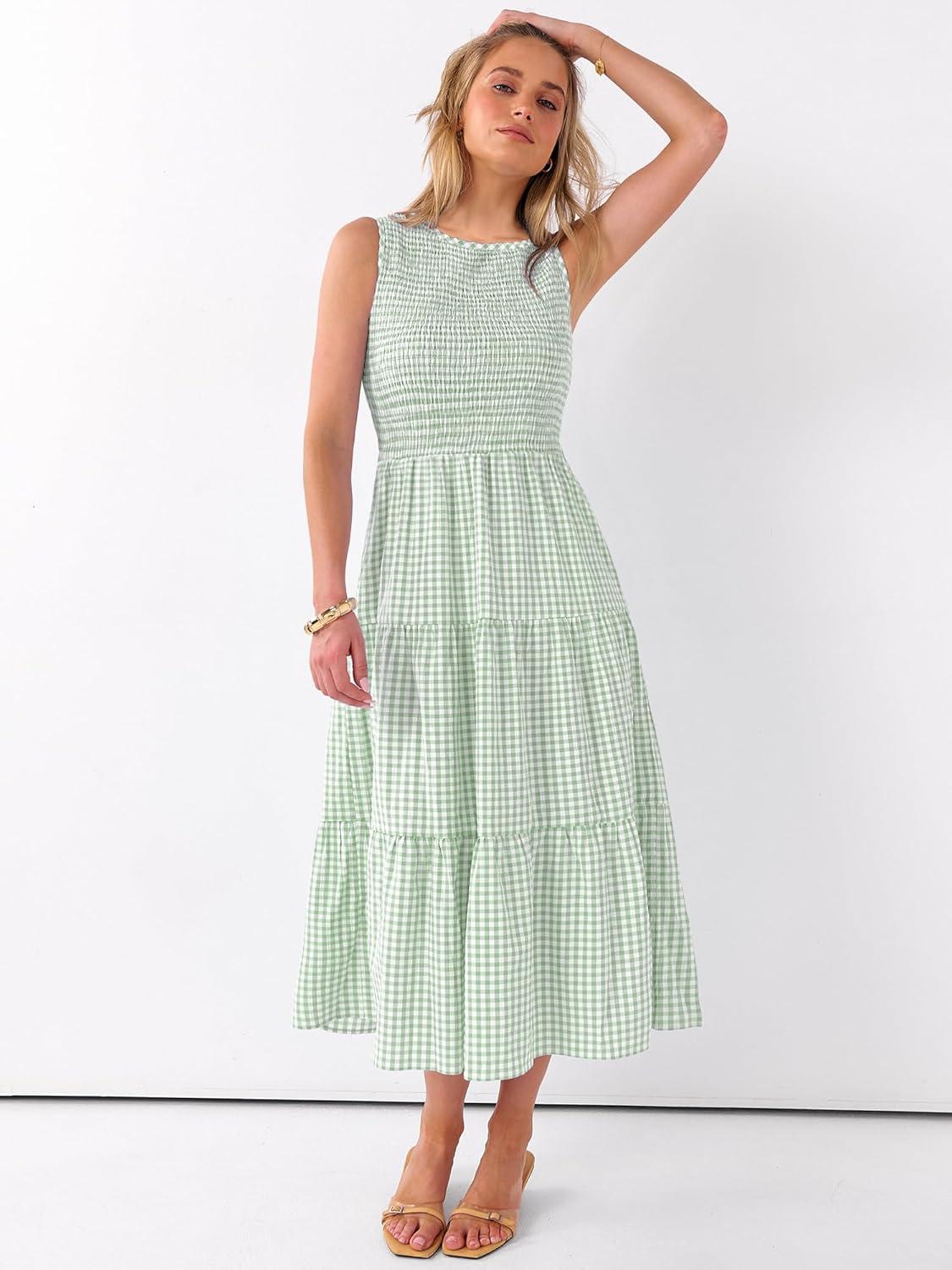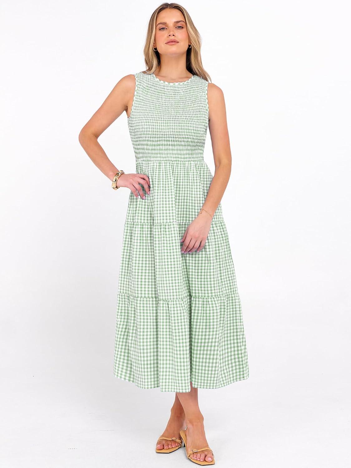 ANRABESS Women’s Summer Casual Maxi Dress Sleeveless Crewneck Smocked 2026 Flowy Plaid Tiered Boho A Line Beach Long Sundress(Green Plaid)