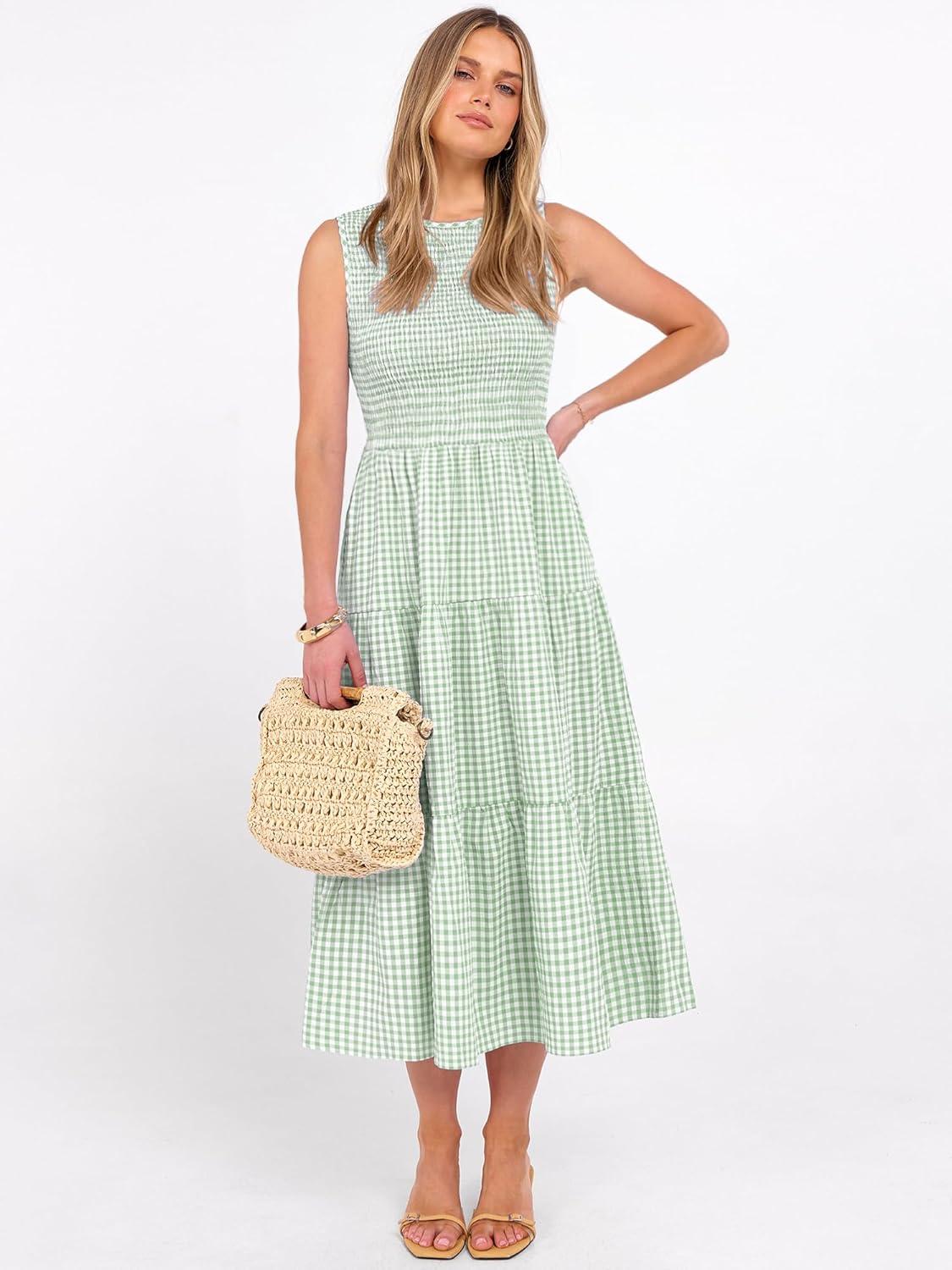ANRABESS Women's Summer Casual Maxi Dress Sleeveless Crewneck Smocked 2026 Flowy Plaid Tiered Boho A Line Beach Long Sundress(Green Plaid)
