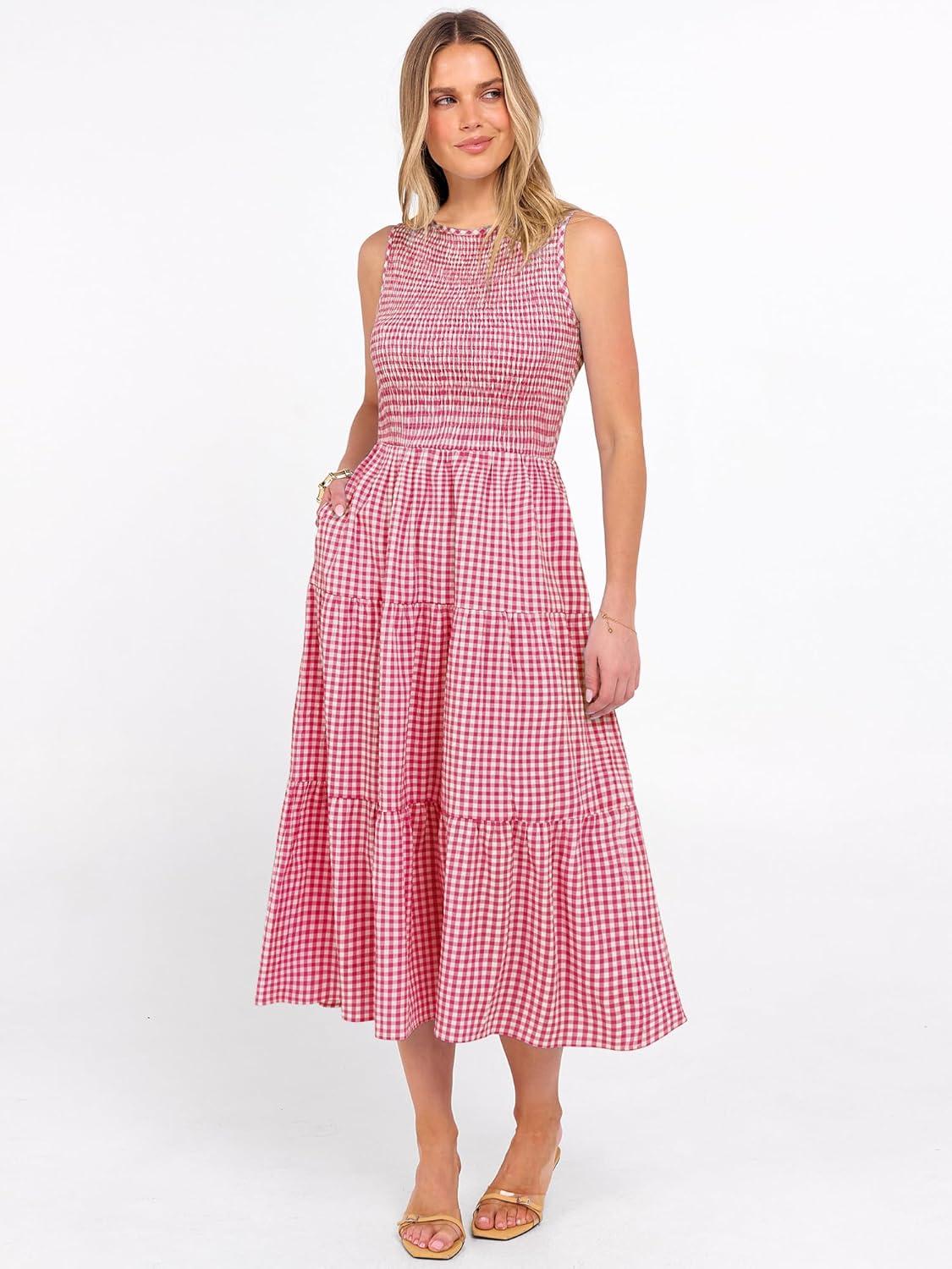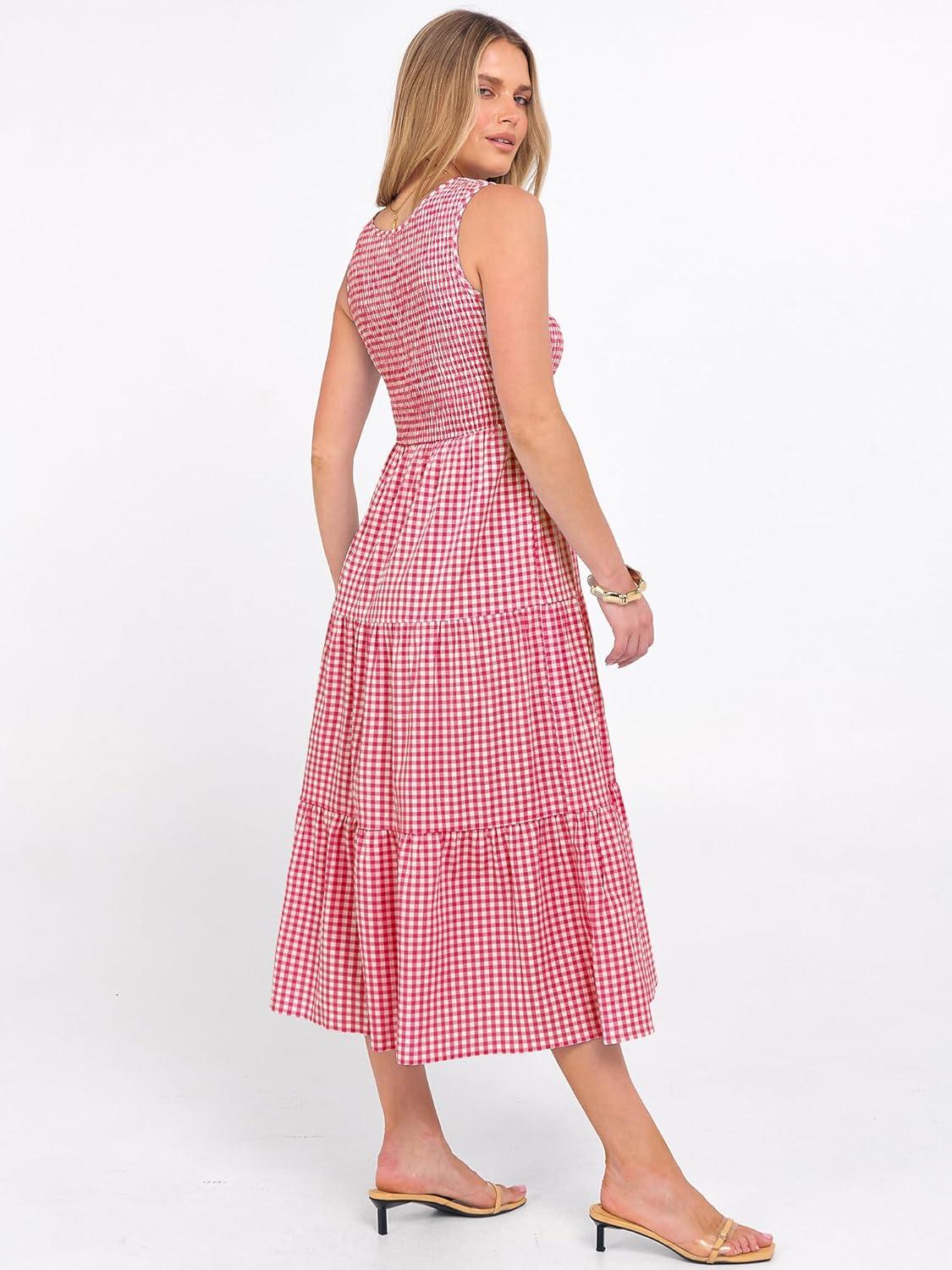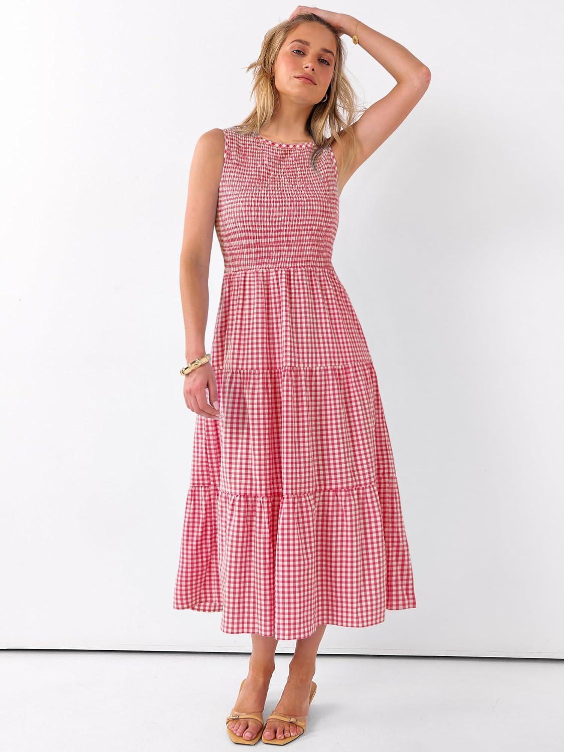 ANRABESS Women's Summer Casual Maxi Dress Sleeveless Crewneck Smocked 2026 Flowy Plaid Tiered Boho A Line Beach Long Sundress(Red Plaid)