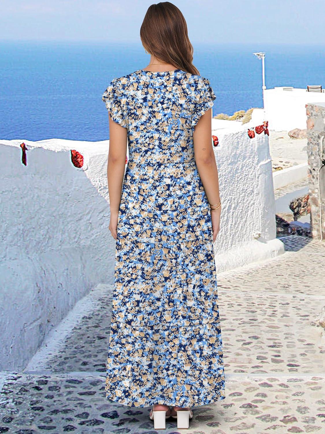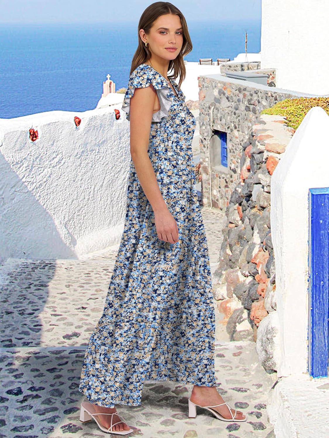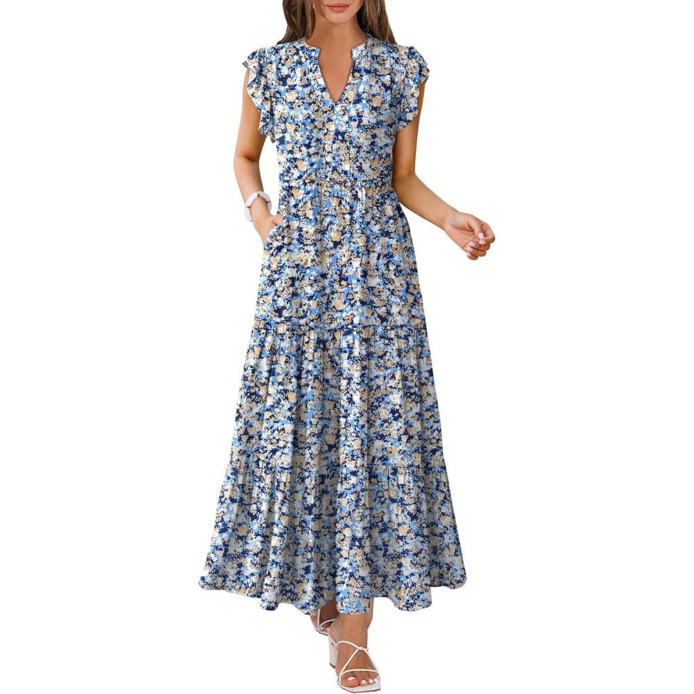 ANRABESS Womens Summer Casual Maxi Dress V Neck Ruffle Sleeve Long Dresses Fashion Flowy Tiered Boho Beach Vacation Sundress(Floral Blue Yellow)