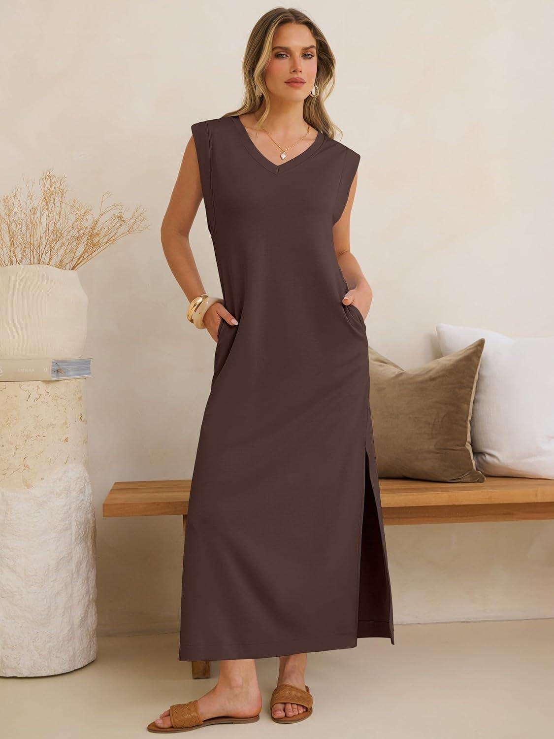 imageANRABESS Womens Summer Casual Maxi Dresses Sleeveless V Neck Split WrinkleFree Long Sundress Beach Vacation Travel ClothesBrown