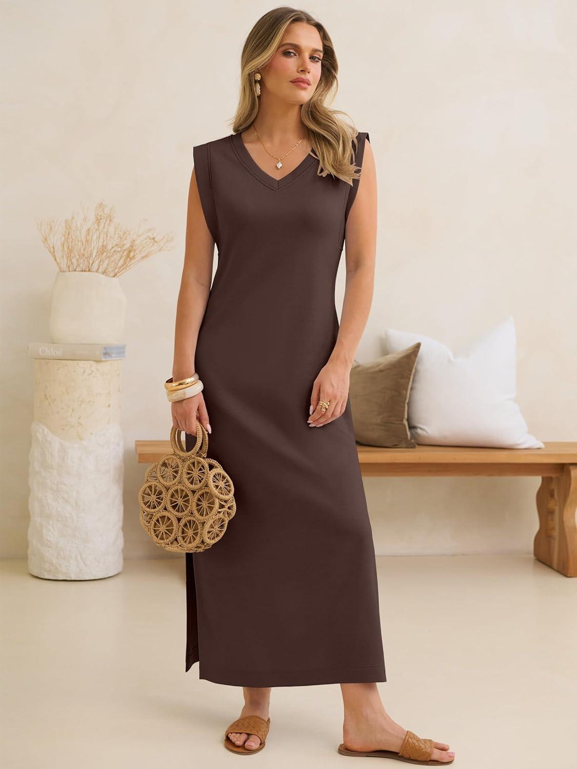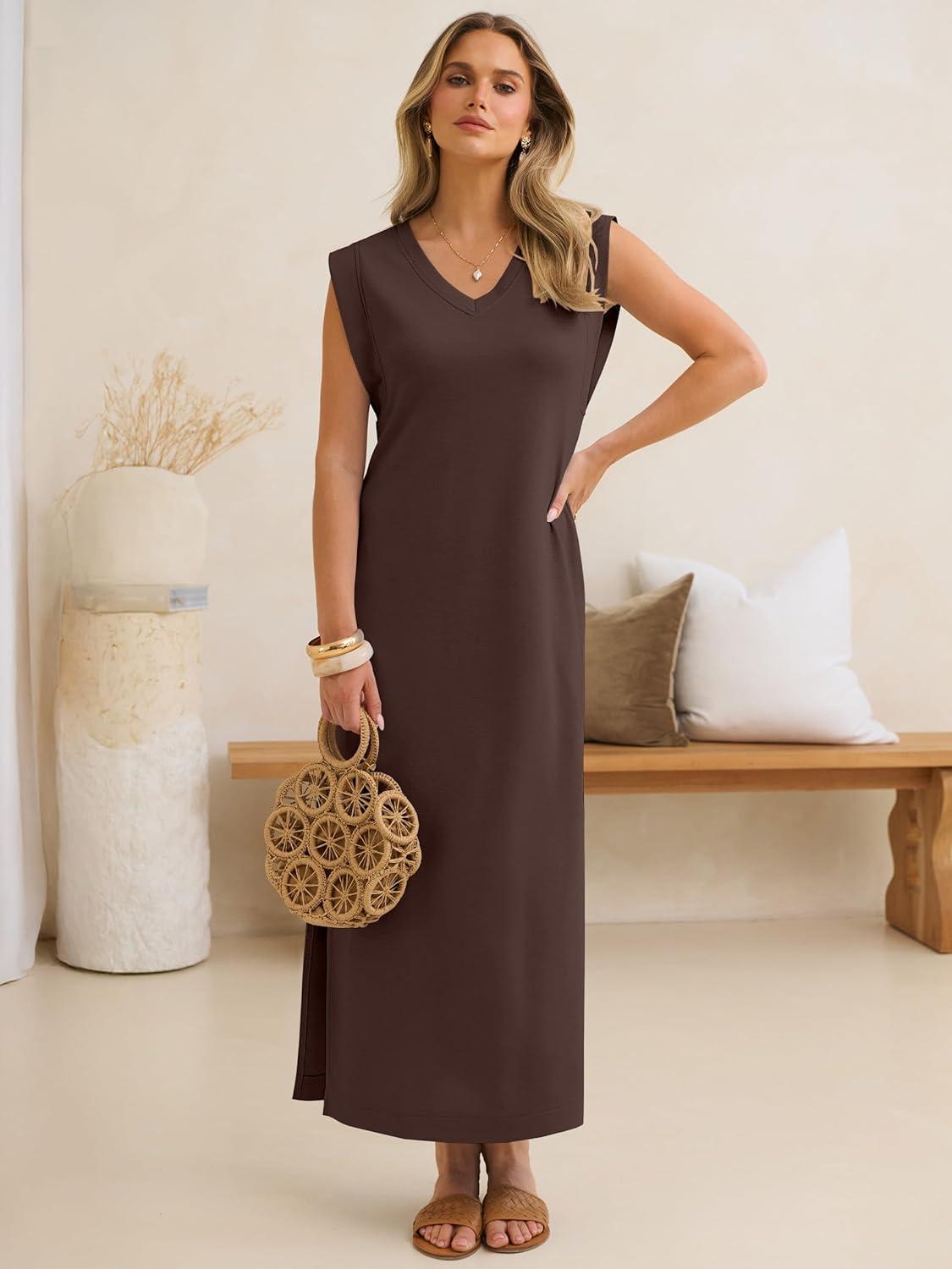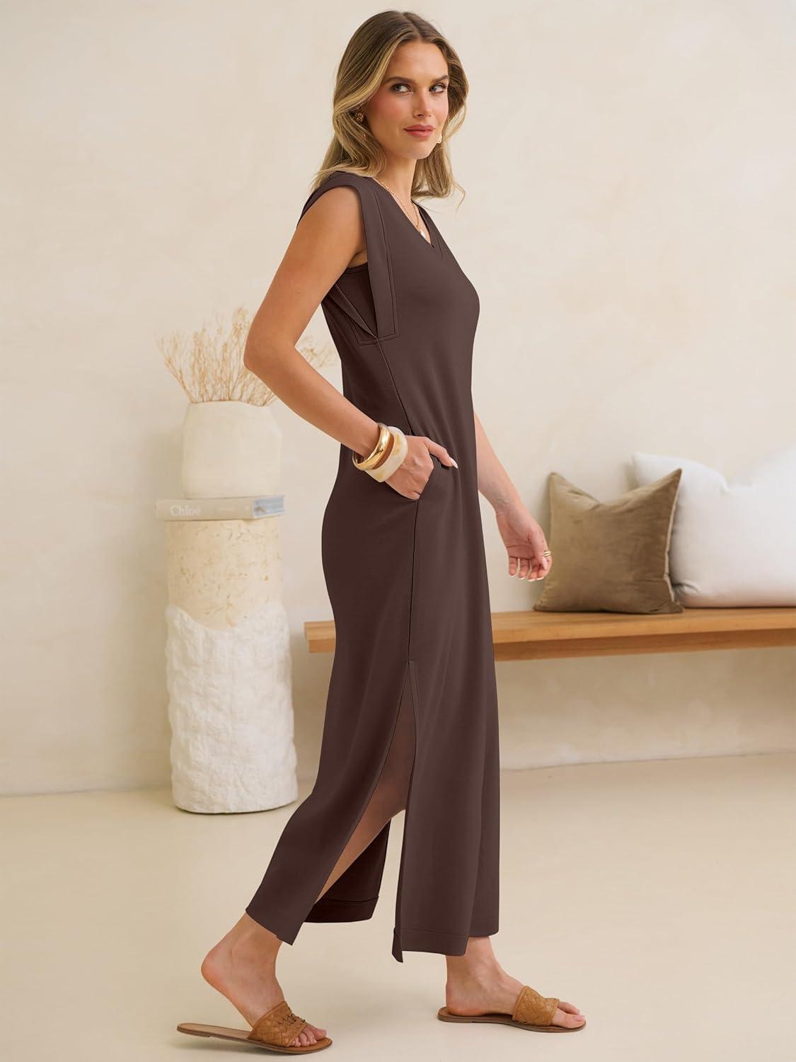 ANRABESS Womens Summer Casual Maxi Dresses Sleeveless V Neck Split Wrinkle-Free Long Sundress Beach Vacation Travel Clothes(Brown)