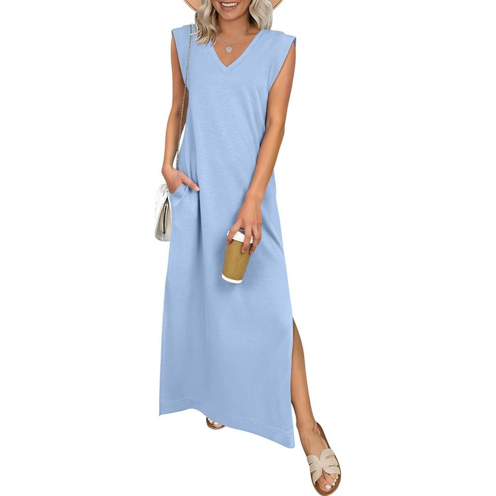 ANRABESS Womens Summer Casual Maxi Dresses Sleeveless V Neck Split Wrinkle-Free Long Sundress Beach Vacation Travel Clothes(Light Blue)