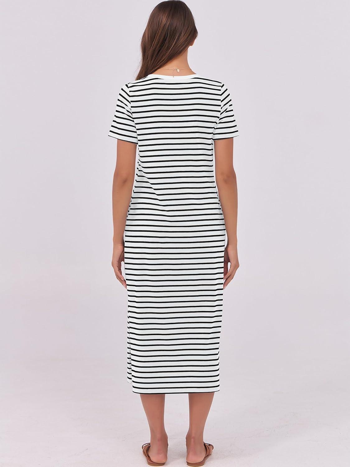 ANRABESS Womens Summer Casual Midi Dress Short Sleeve Crewneck T Shirt Long Dresses Split Stripe Beach Vacation Travel Outfit(White Black Stripe)