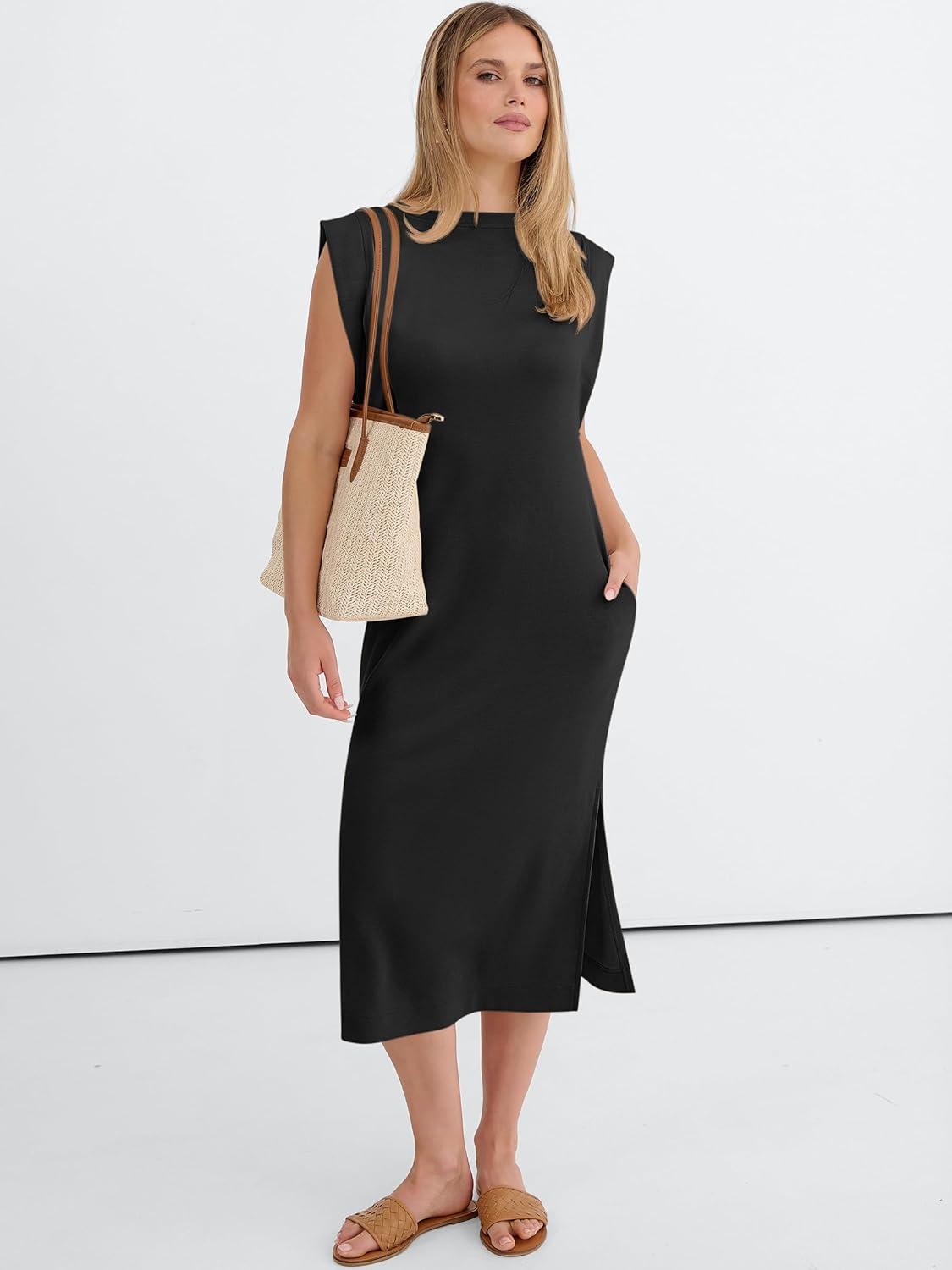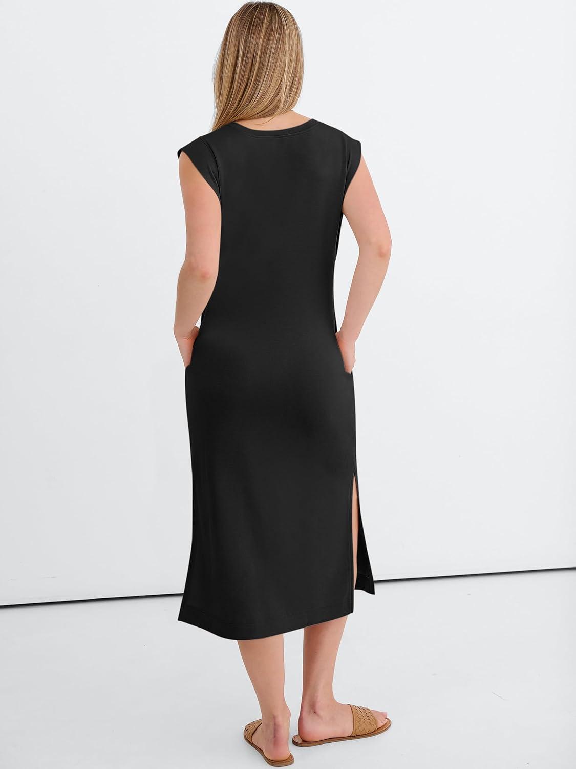 ANRABESS Womens Summer Casual Midi Dress Sleeveless Crewneck Loose Split Wrinkle-Free Beach Travel Vacation Long Sundress(Black)