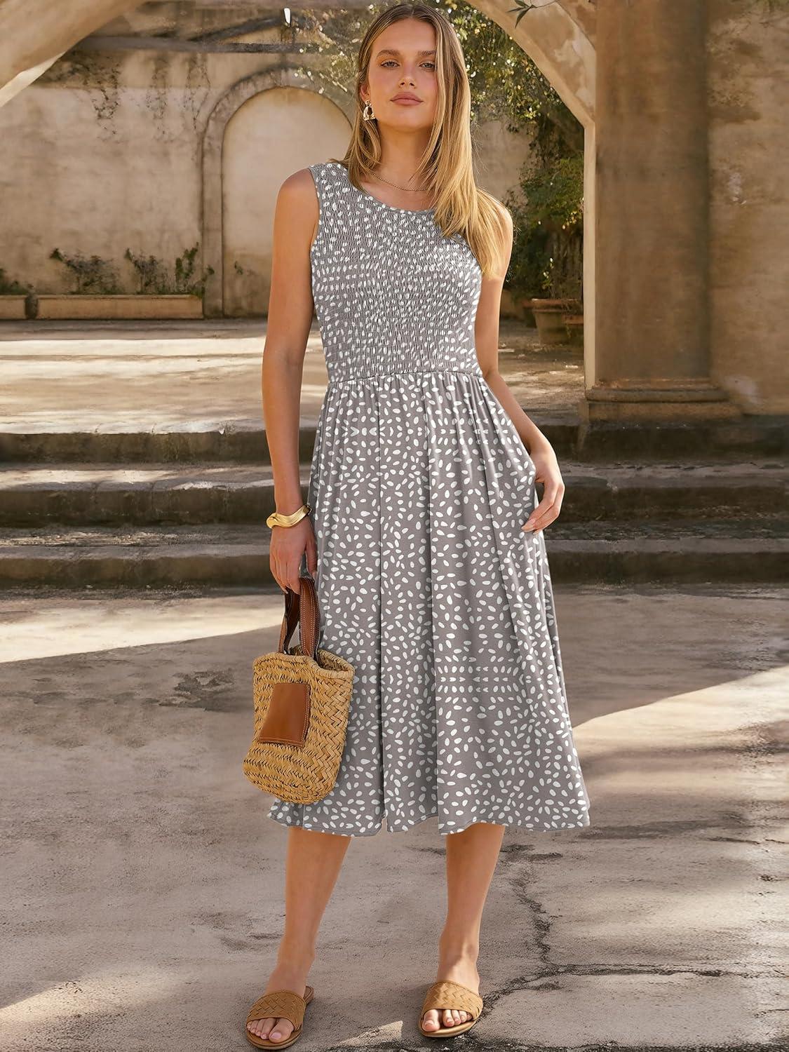 ANRABESS Womens Summer Casual Midi Dresses Sleeveless Smocked Elastic Waist Flowy Sundress 2026 Spring Beach Vacation Clothes(Grey Khaki White Dot)