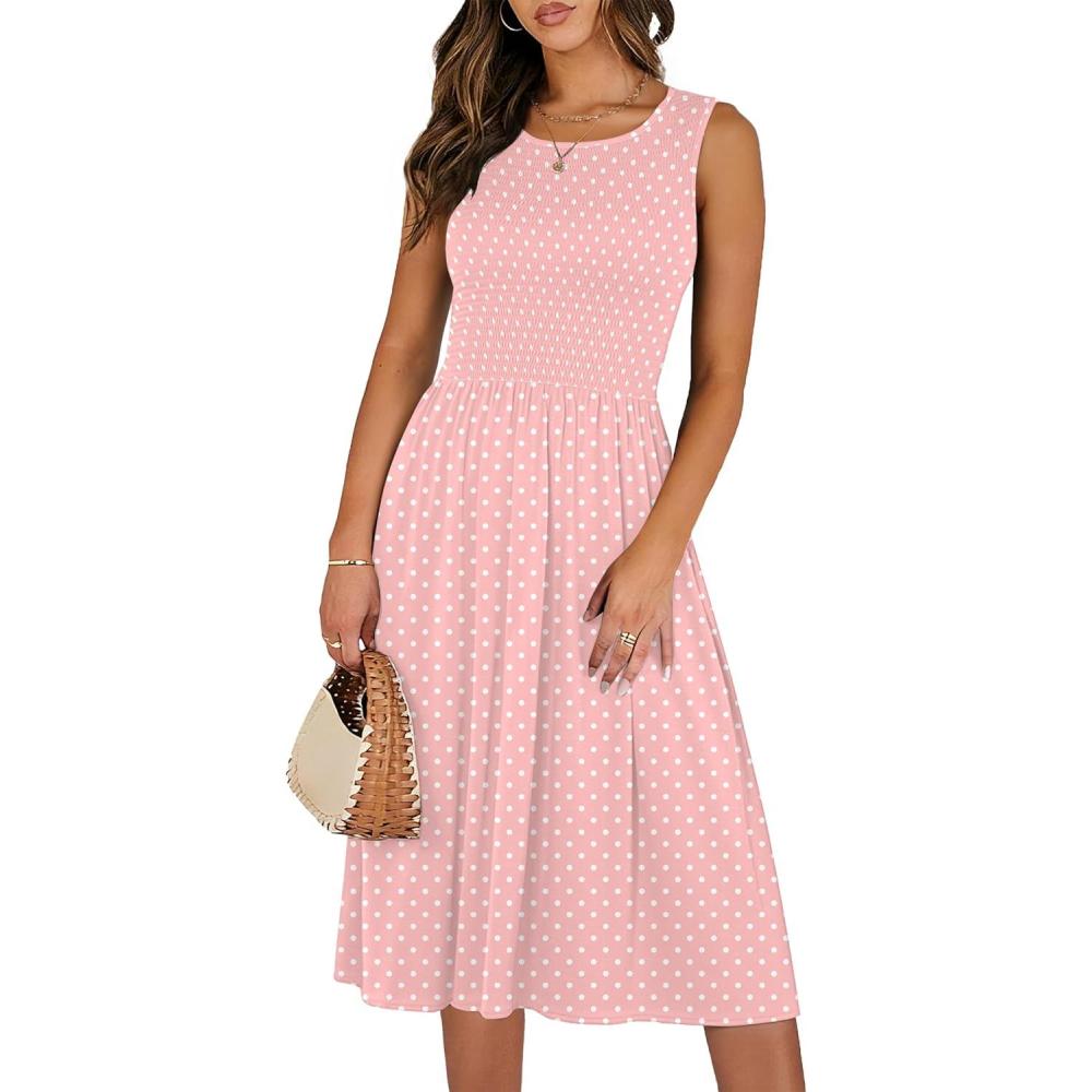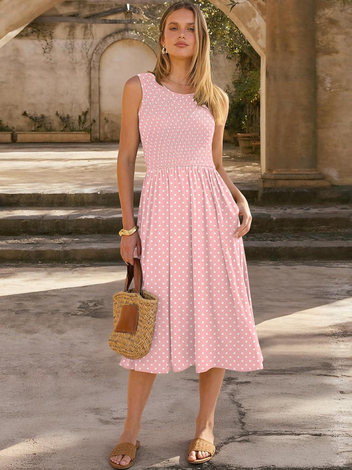 ANRABESS Womens Summer Casual Midi Dresses Sleeveless Smocked Elastic Waist Flowy Sundress 2026 Spring Beach Vacation Clothes(Pink Round Dot)