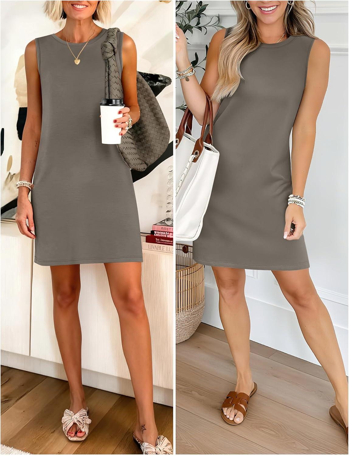 ANRABESS Womens Summer Casual Mini Dresses 2026 Sleeveless Crewneck Split Wrinkle-Free Beach Travel Vacation Short Sundress(Coffee Grey)