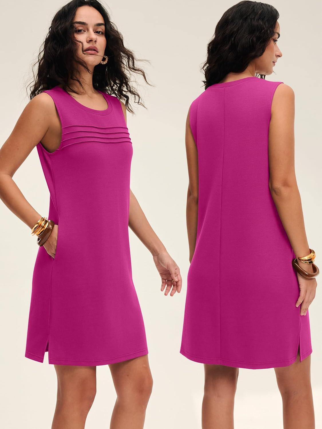 ANRABESS Womens Summer Casual Mini Dresses 2026 Sleeveless Crewneck Wrinkle-Free Sundress Beach Vacation Short Tank Dress(Hot Pink)