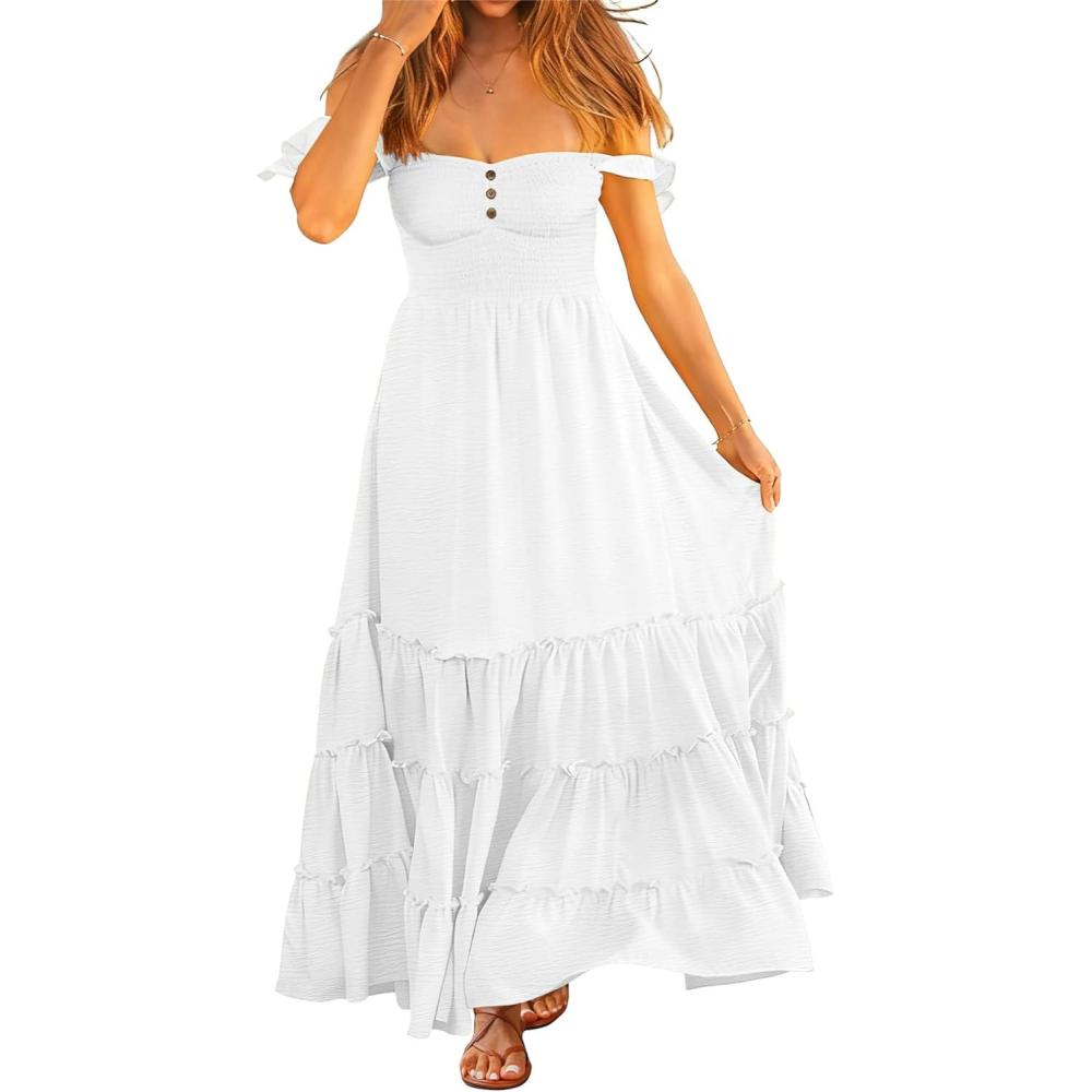 ANRABESS Womens Summer Casual Off The Shoulder Maxi Long Dress 2026 Smocked Ruffle Strap Backless Flowy Tiered Beach Sundress(White)