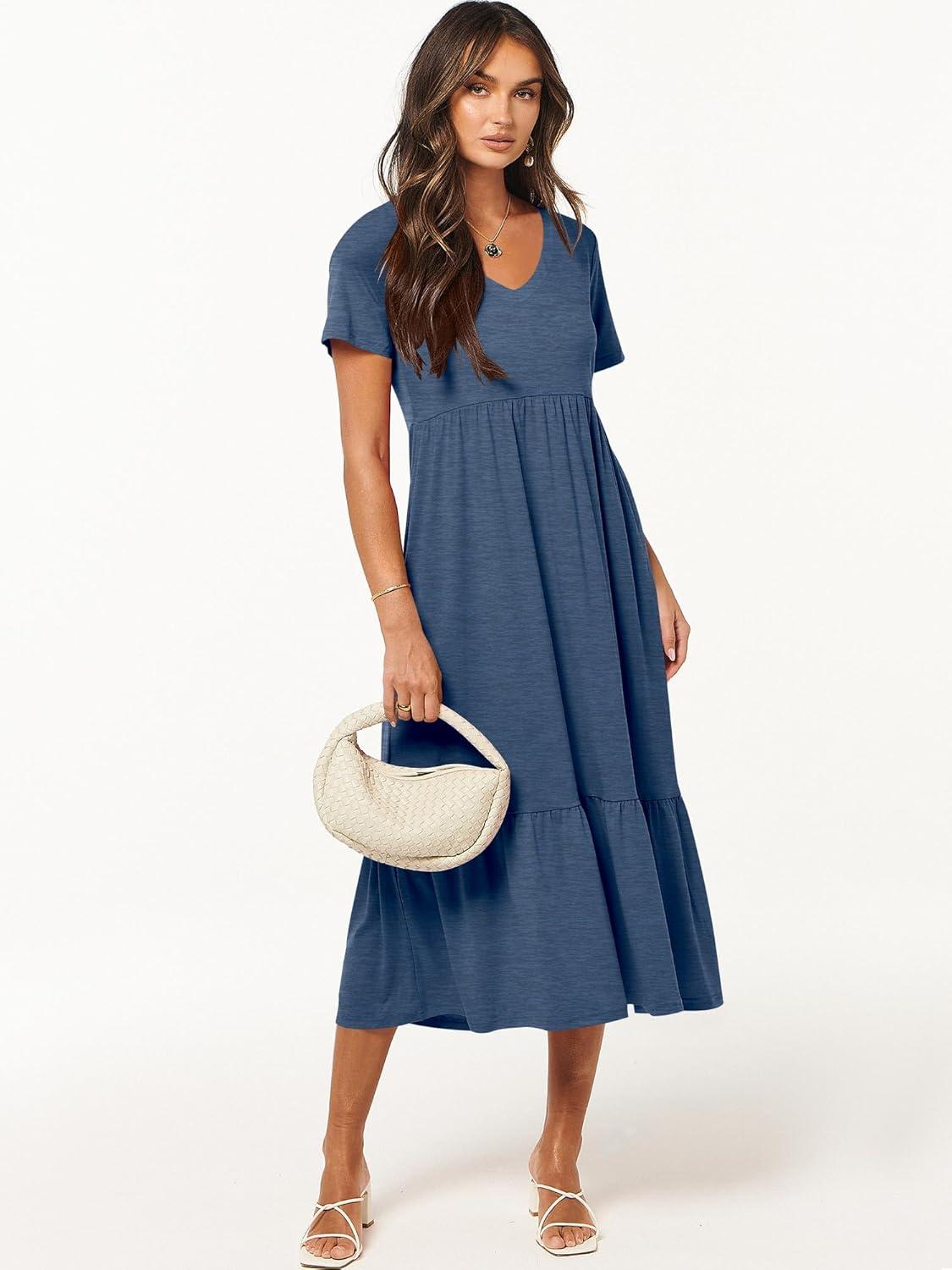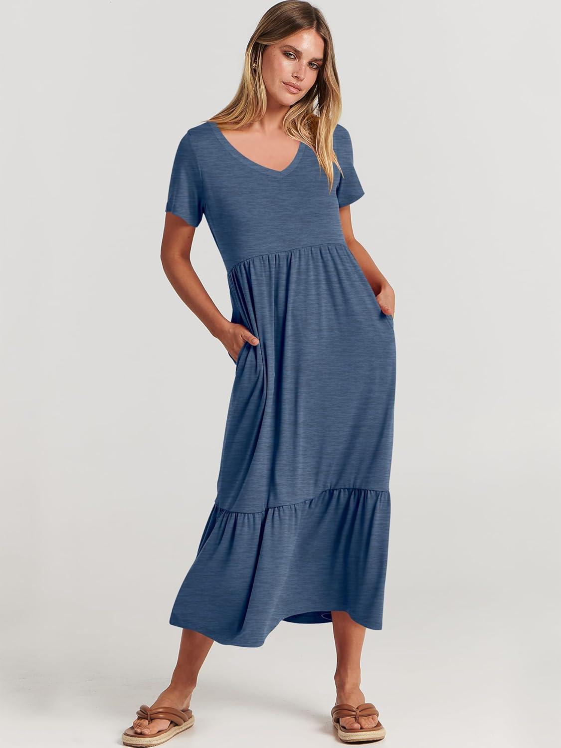 ANRABESS Women’s Summer Casual Short Sleeve T Shirts Maxi Dress Flowy V Neck Tiered Beach Vacation Sundress 2025 Outfits(Blue)