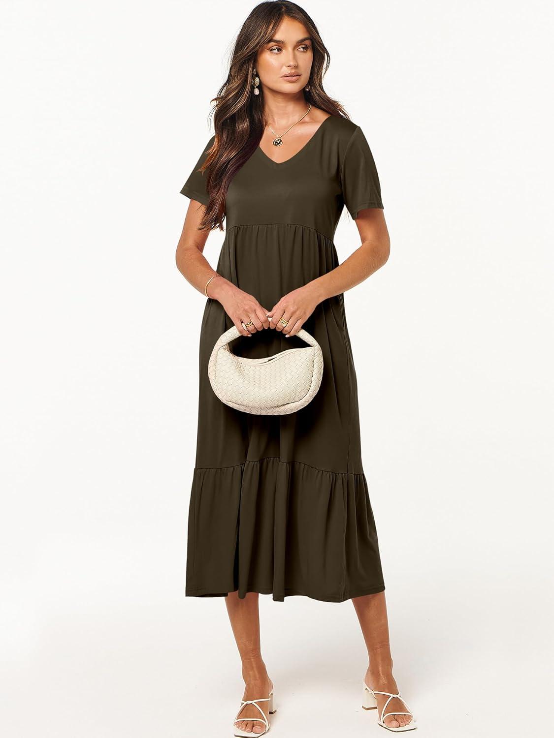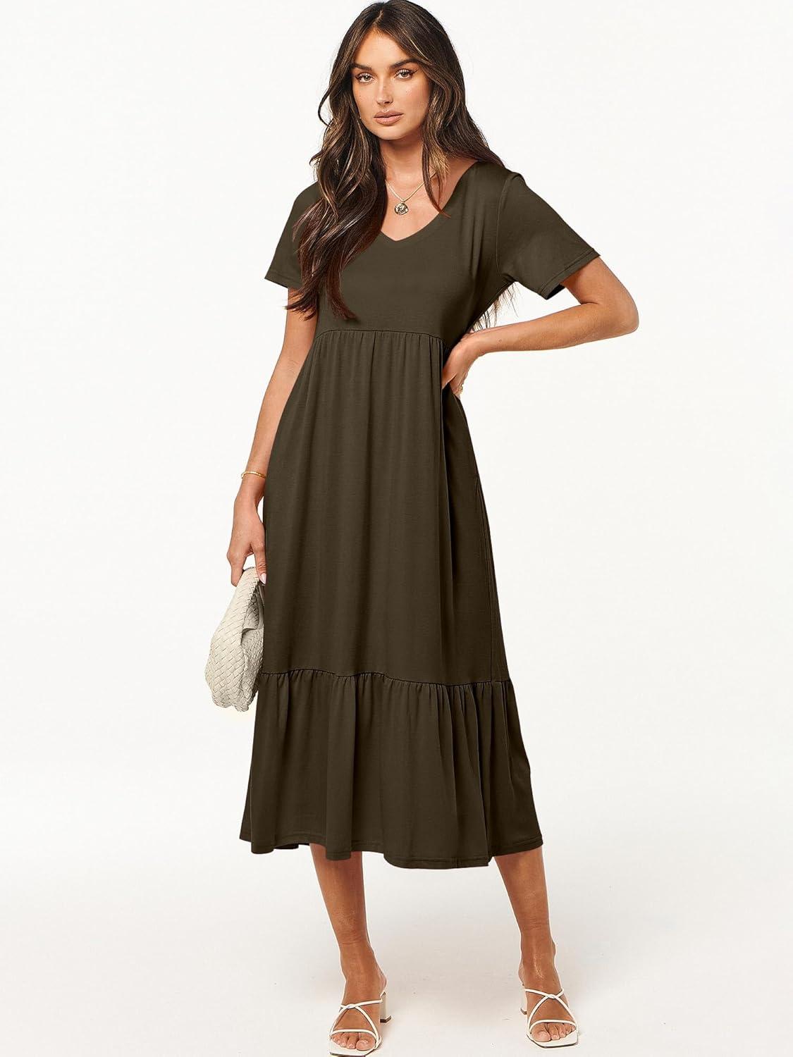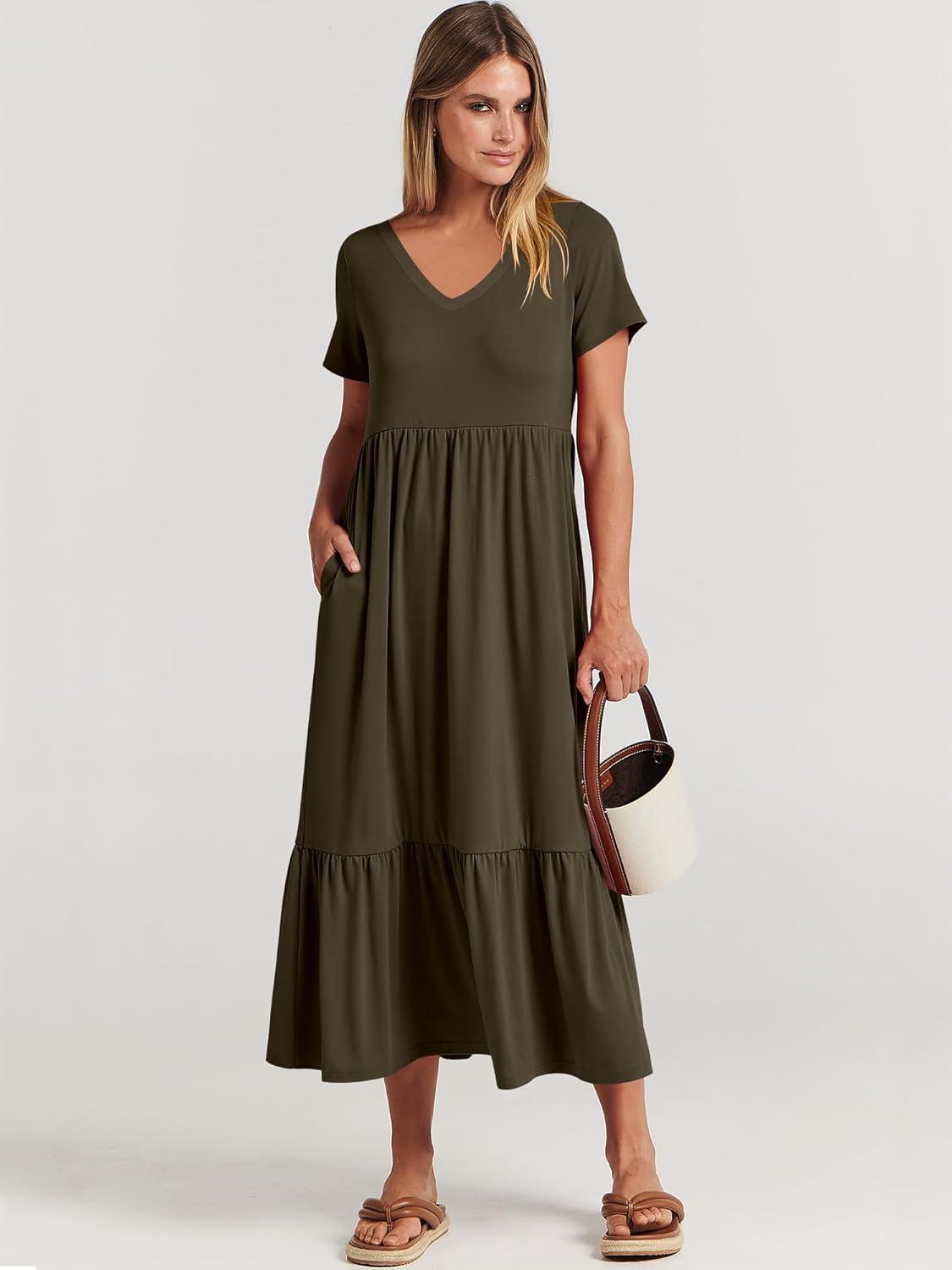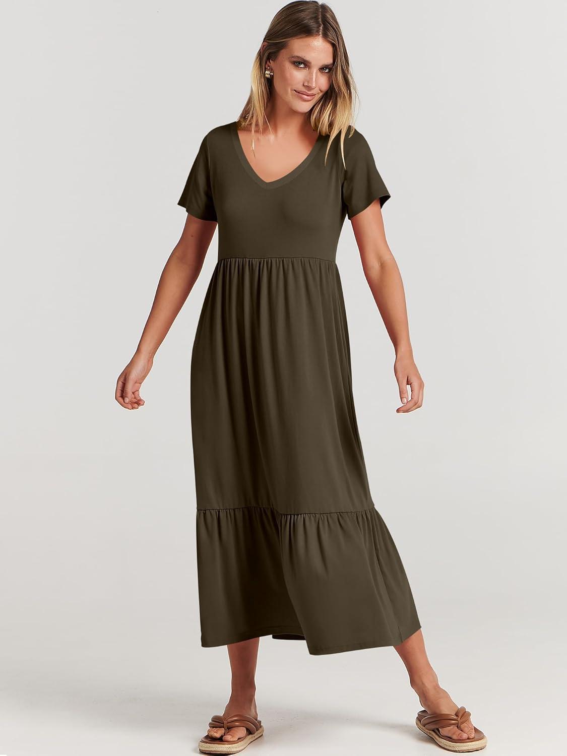 ANRABESS Women’s Summer Casual Short Sleeve T Shirts Maxi Dress Flowy V Neck Tiered Beach Vacation Sundress 2025 Outfits(Brown)